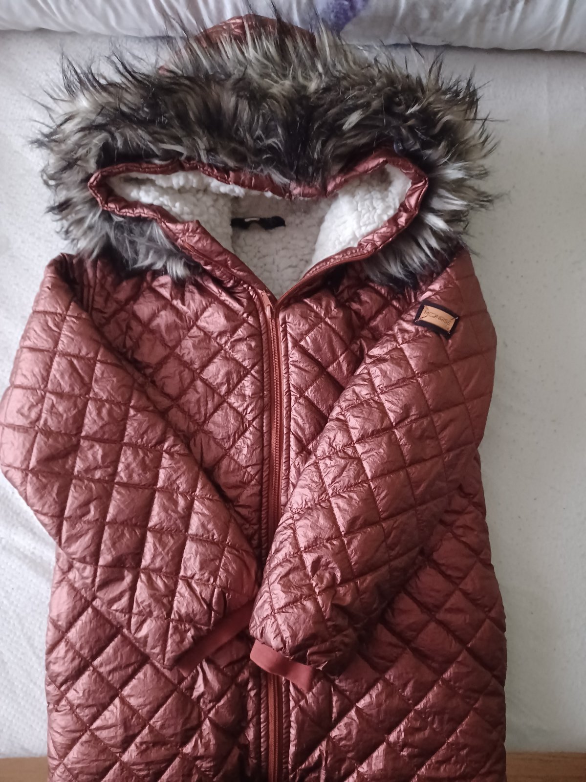 Ruzovomedena s holografickym odleskom Dlzka rukava od pleca po spodok 44 cm Dlzka bundy od pleca po spodok 51 cm Sirka pod pazuchami 40 cm Po 1 dietati, bez poskodeni Cdna 5€ + postovne