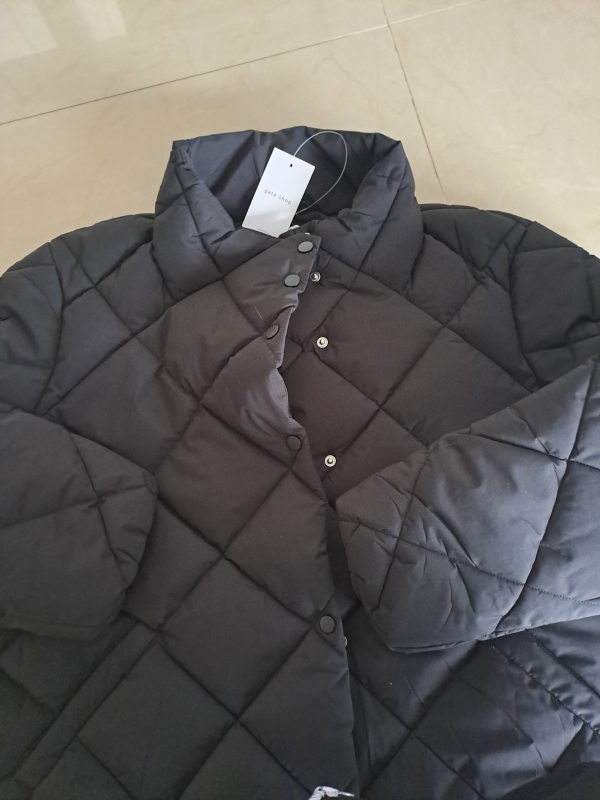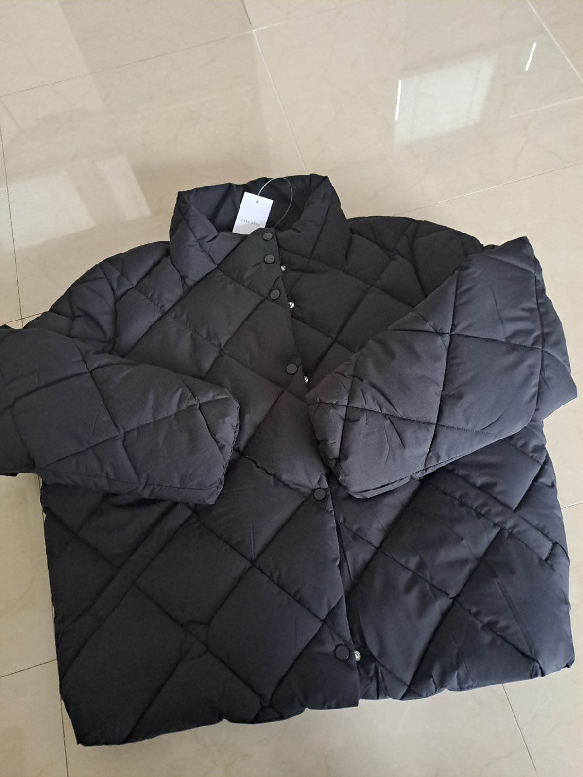 Moderná lesklá prešívaná vetrovka, zapínanie na zips aj na cvocky. Vysoký golier aj kapucna, da sa zapnut celkom ku krku. Top stav