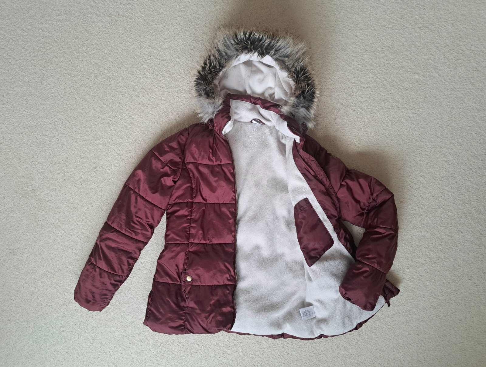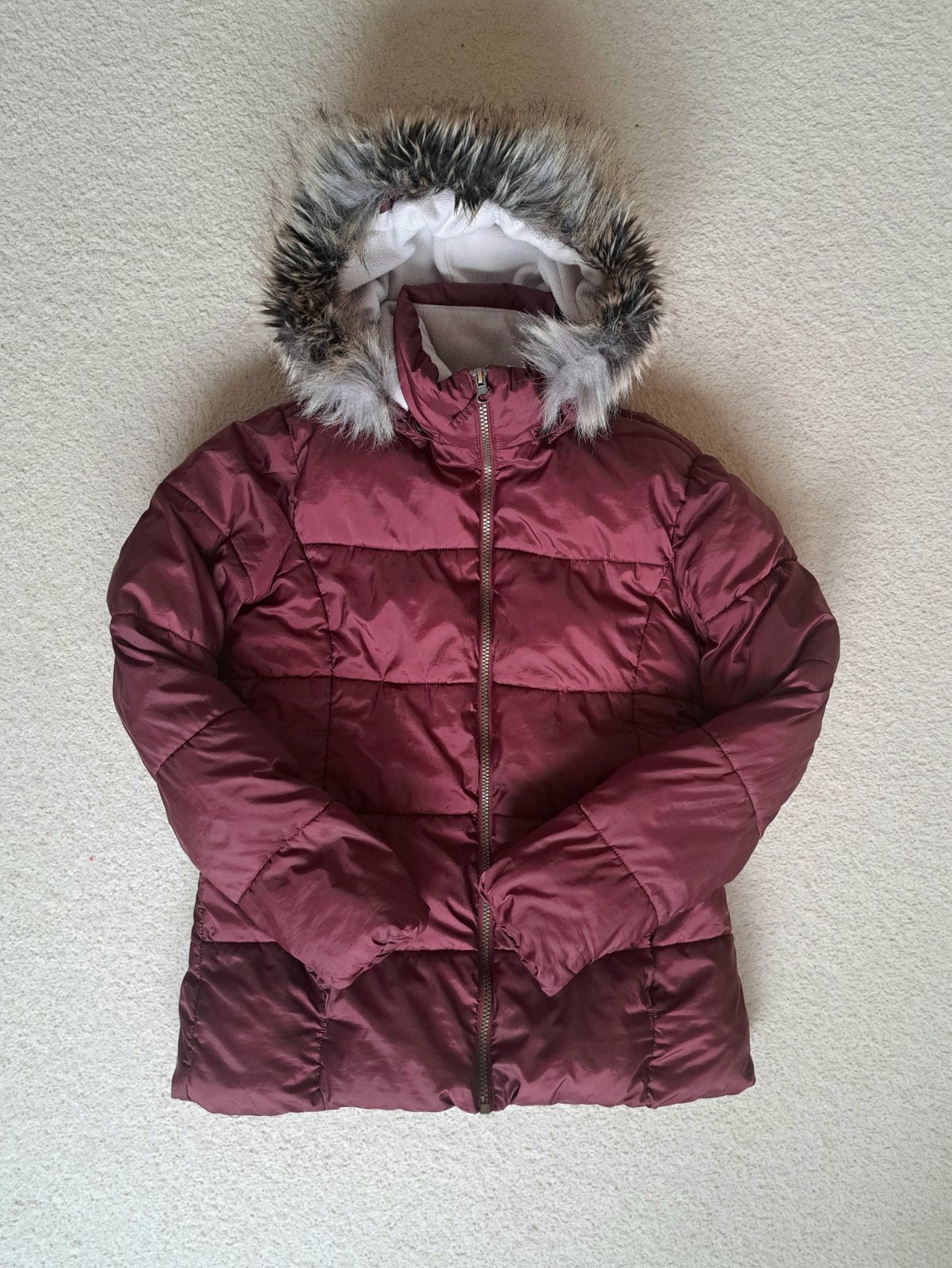 Teplá a pohodlná zimná bunda podšitá flisom krémovej farby s jedným vnútorným vreckom. Odopnuteľná kapucňa s odopnuteľnou kožušinkou, dve vrecká, vzadu reflexná páska. Výborný nosený stav bez poškodenia.