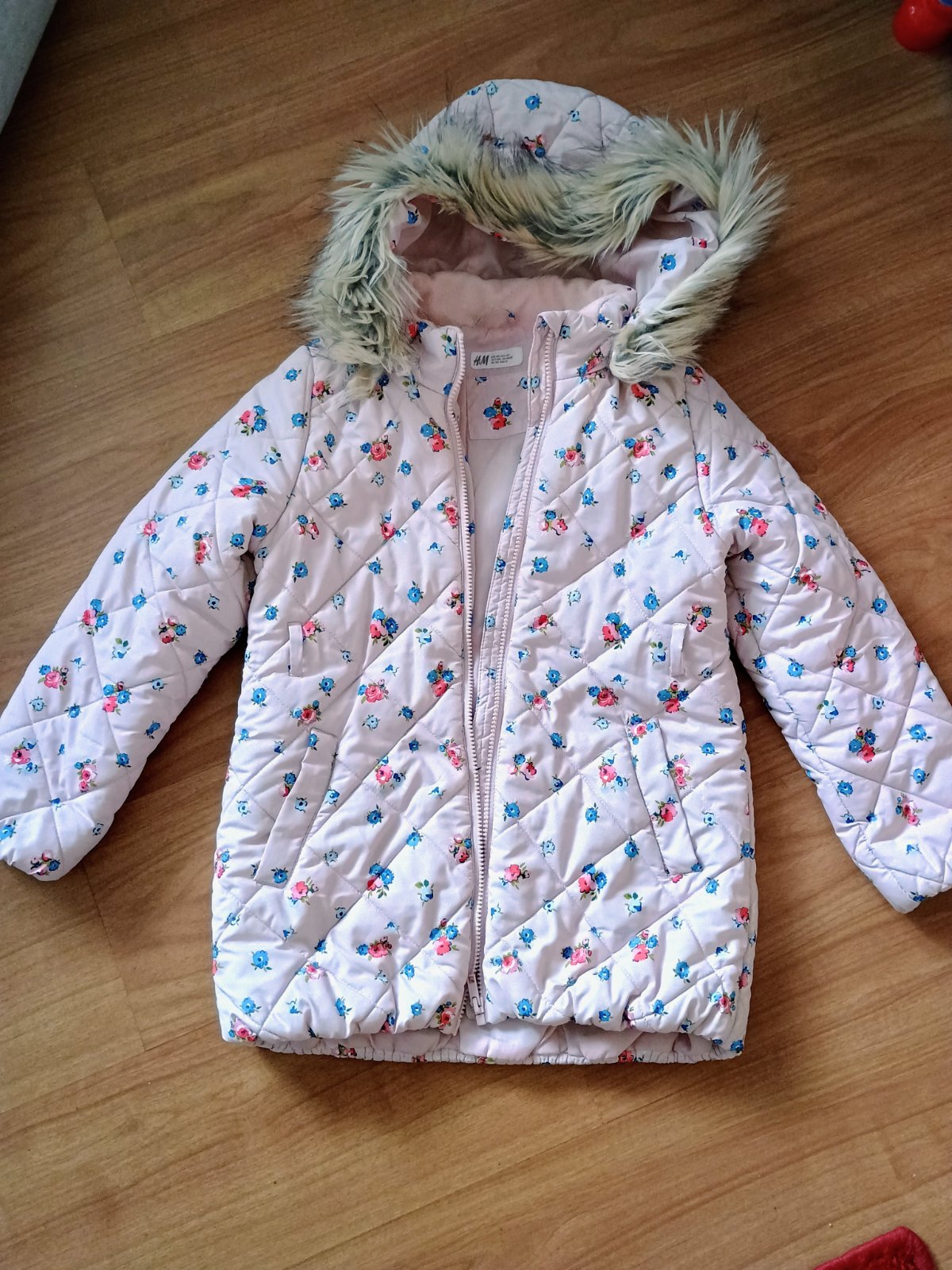 Krásna zimná vetrovka, predĺžená, bledoružová s kvetinami na 9-10 r., dĺžka rukáva od krku 60 cm, šírka pod pazuchami 2x44 cm, smerom dolu sa trochu rozširuje 2x47 cm, dĺžka 65 cm.