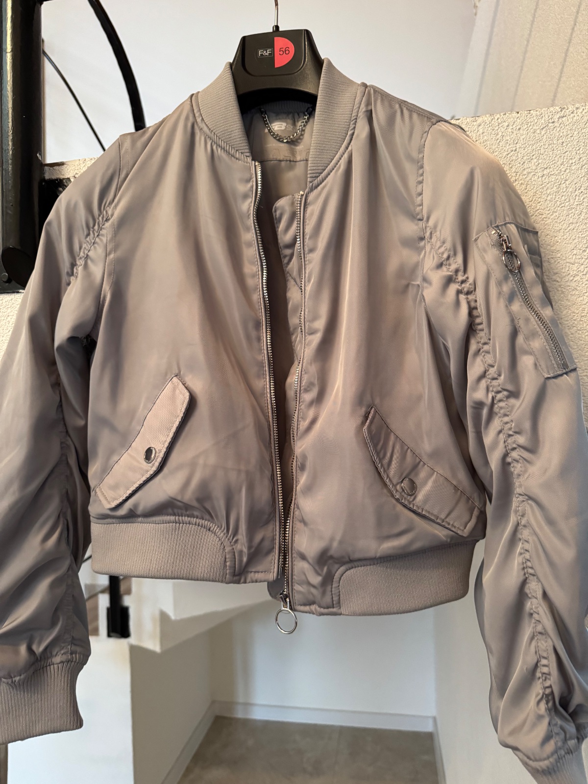 šedá bunda na patenty, v hornej časti vrecká na patenty, v dolnej klasické vrecká. Bundička je vo výbornom stave. Materiál - 98 % polyester, 2 % elastan.