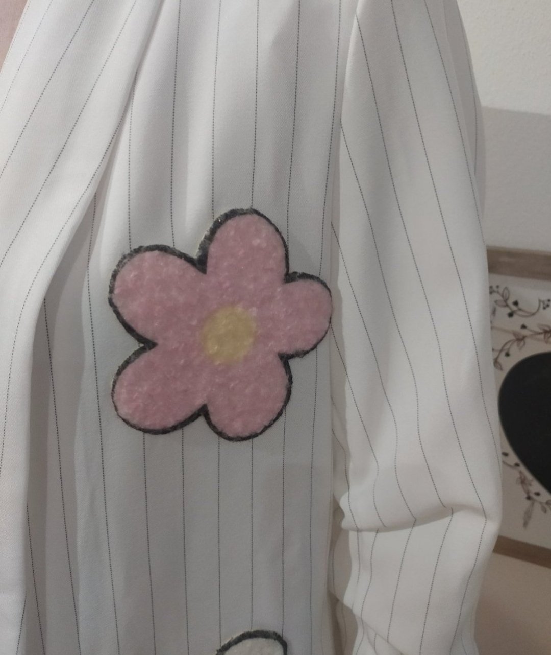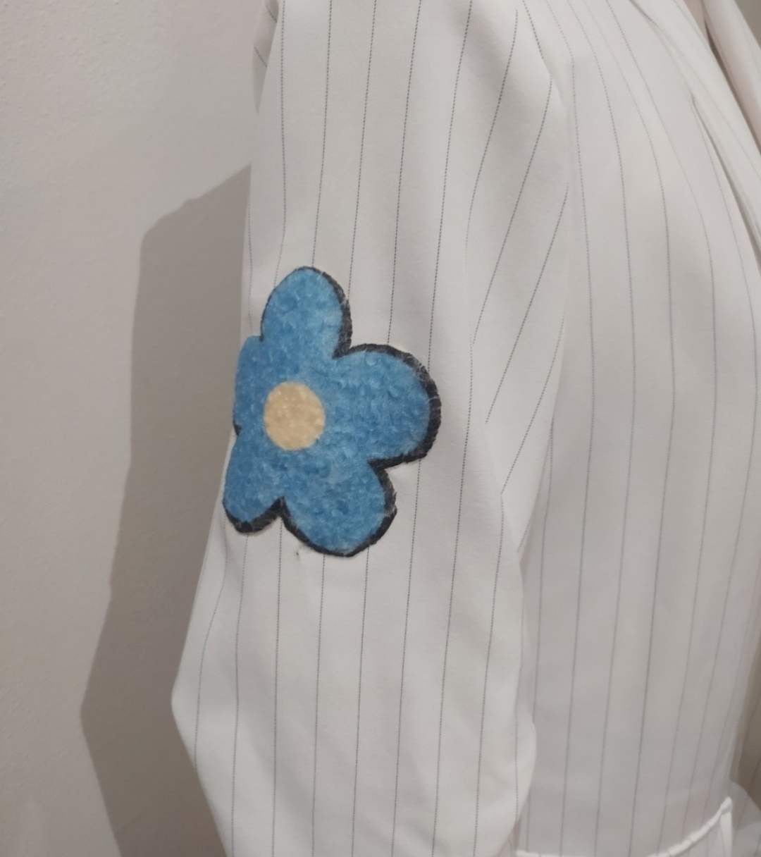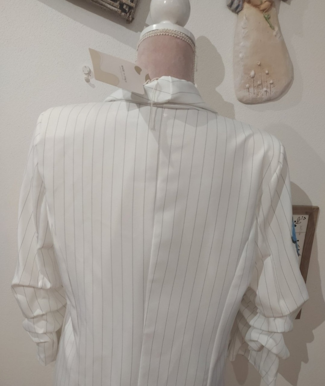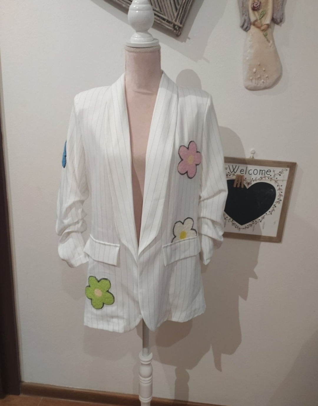 Krásne letné sako s podšívkou,rukávy nariasené 3/4,sako má jemný prúžok,zdobené kvetmi.Vel Uni vhodné pre veľ S-L