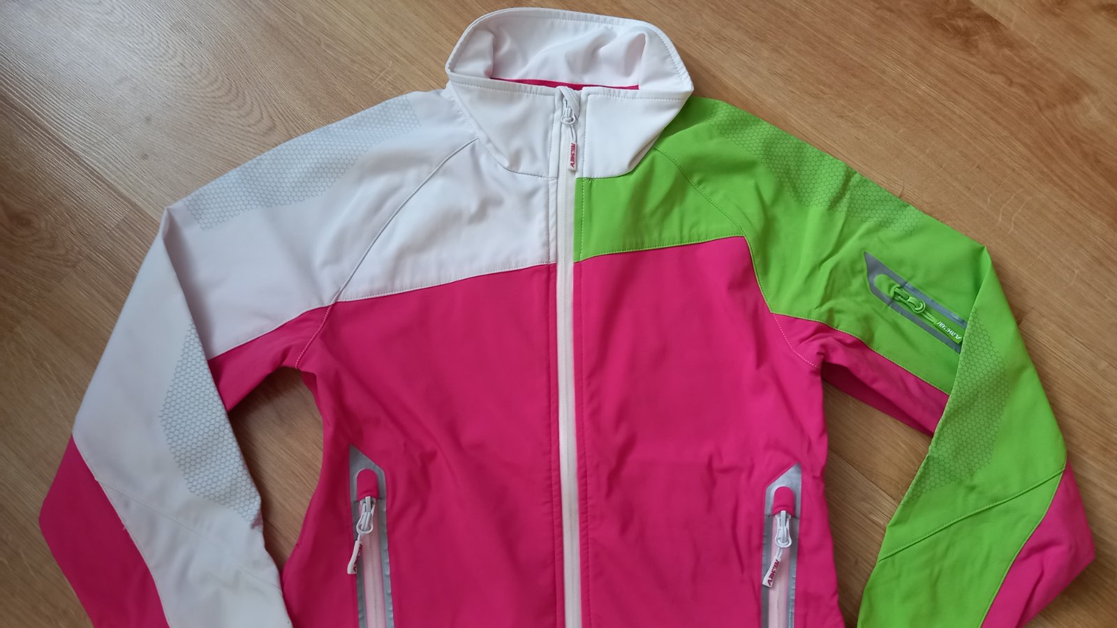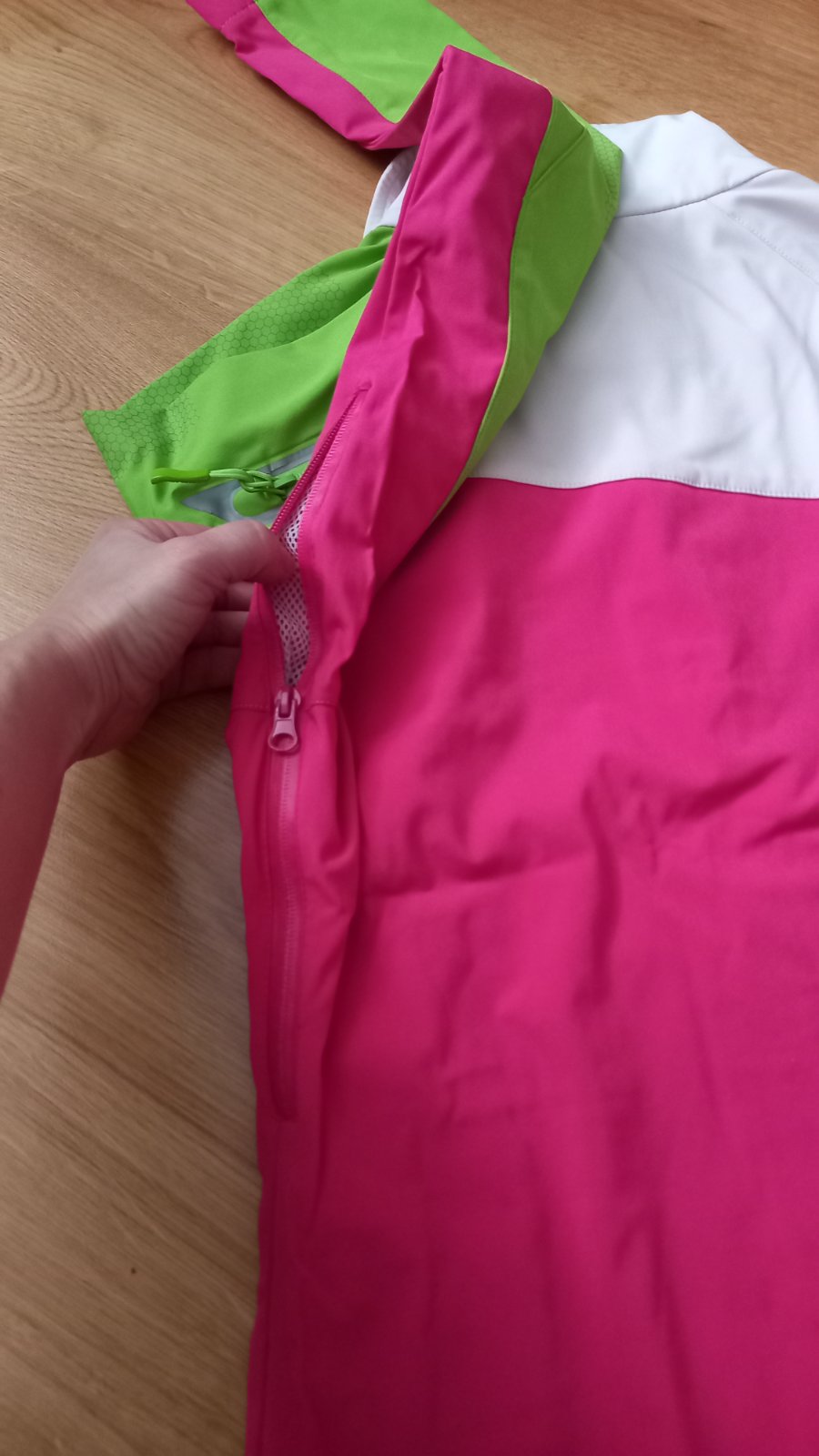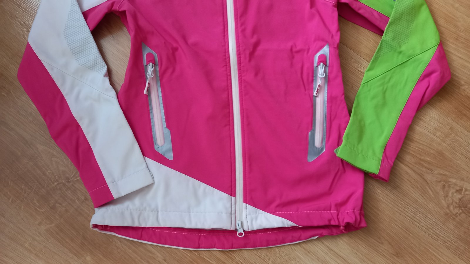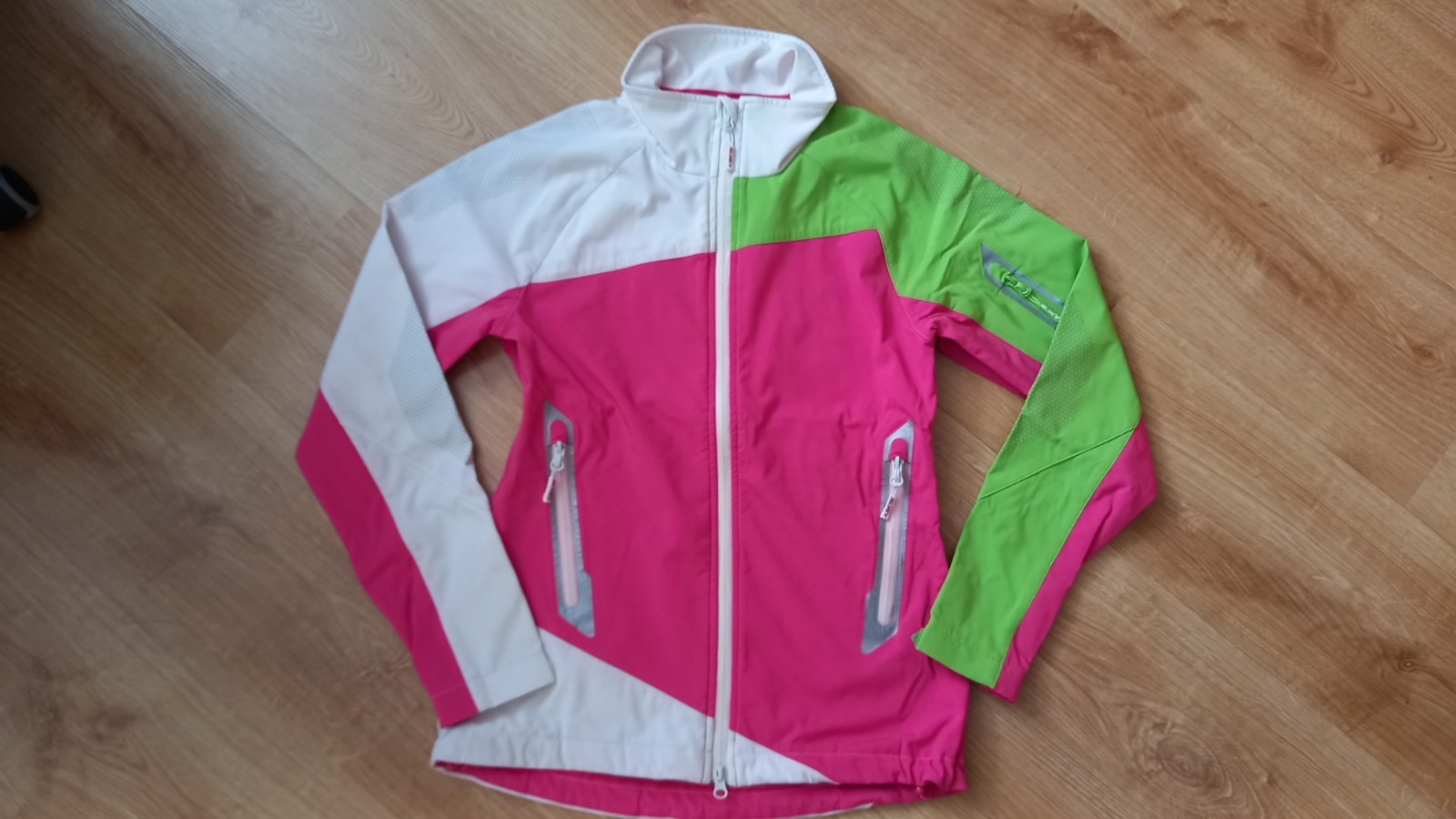 nova, nepouzita, s original visackami, dcera rychlo vyrastla. 5000mm vodny stlpec, odnimatelna kapucna, jarno/zimno/jesenna sportova bunda, velkost xs - na vysku okolo 160cm, stihlu postavu, rukav ...