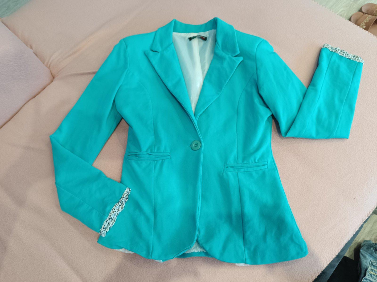 Tyrkysove sako znacky Orsay. Velkost S. Pouzivane, no velmi zachovale. Hladky material. Normalne sa da prat v pracke. Zapinanie vid. na fotke. Zaujimavy, pekny strih.