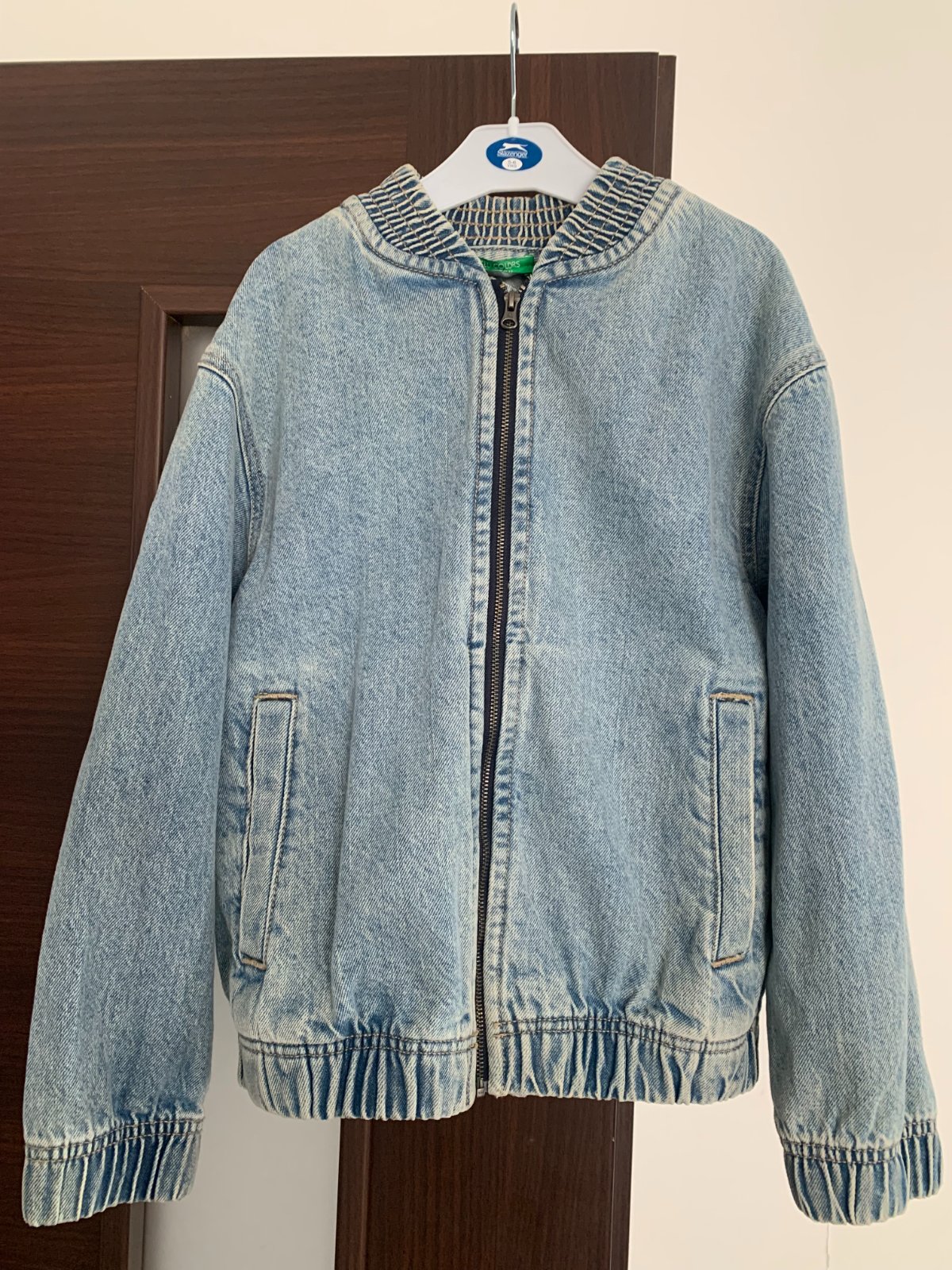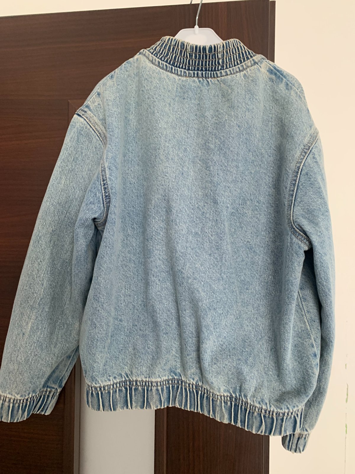 Oblečená 1 krát, top stav, ako nová. Mäkká rifľovina, taký bomber strih. Veľkosť 140, ale sedí aj na väčšiu veľkosť. Rozmery prsia: 47x2 cm, dĺžka 51 cm, rukáv od pleca 59 cm. PC. 40 €. Poštovné 3,50 €.