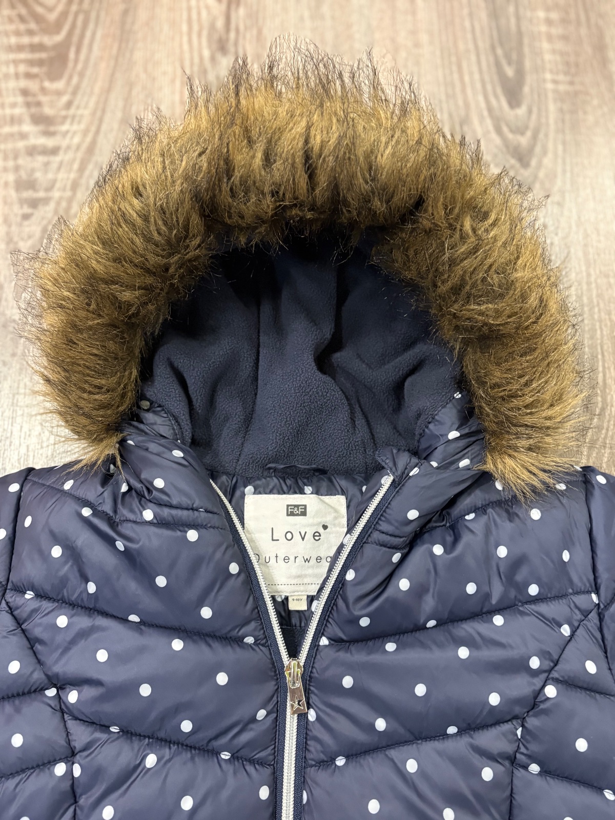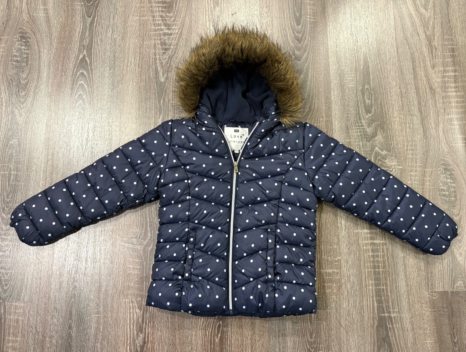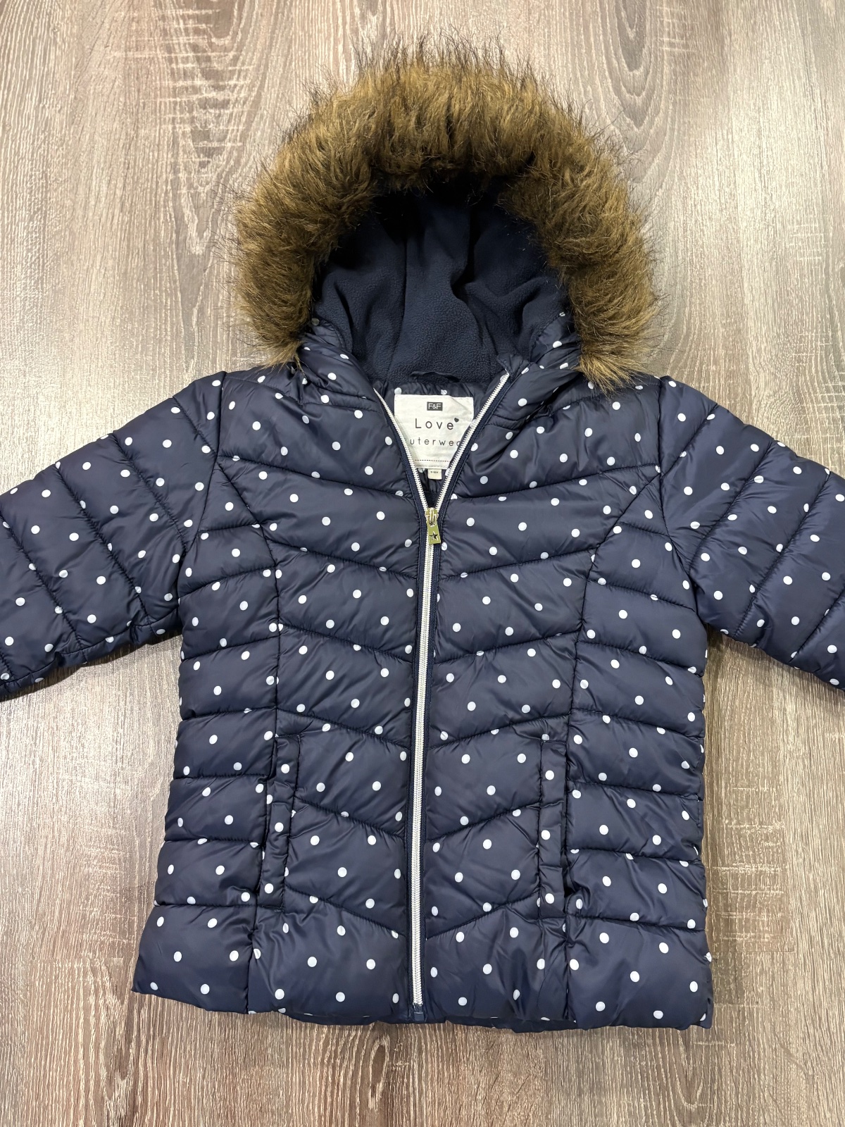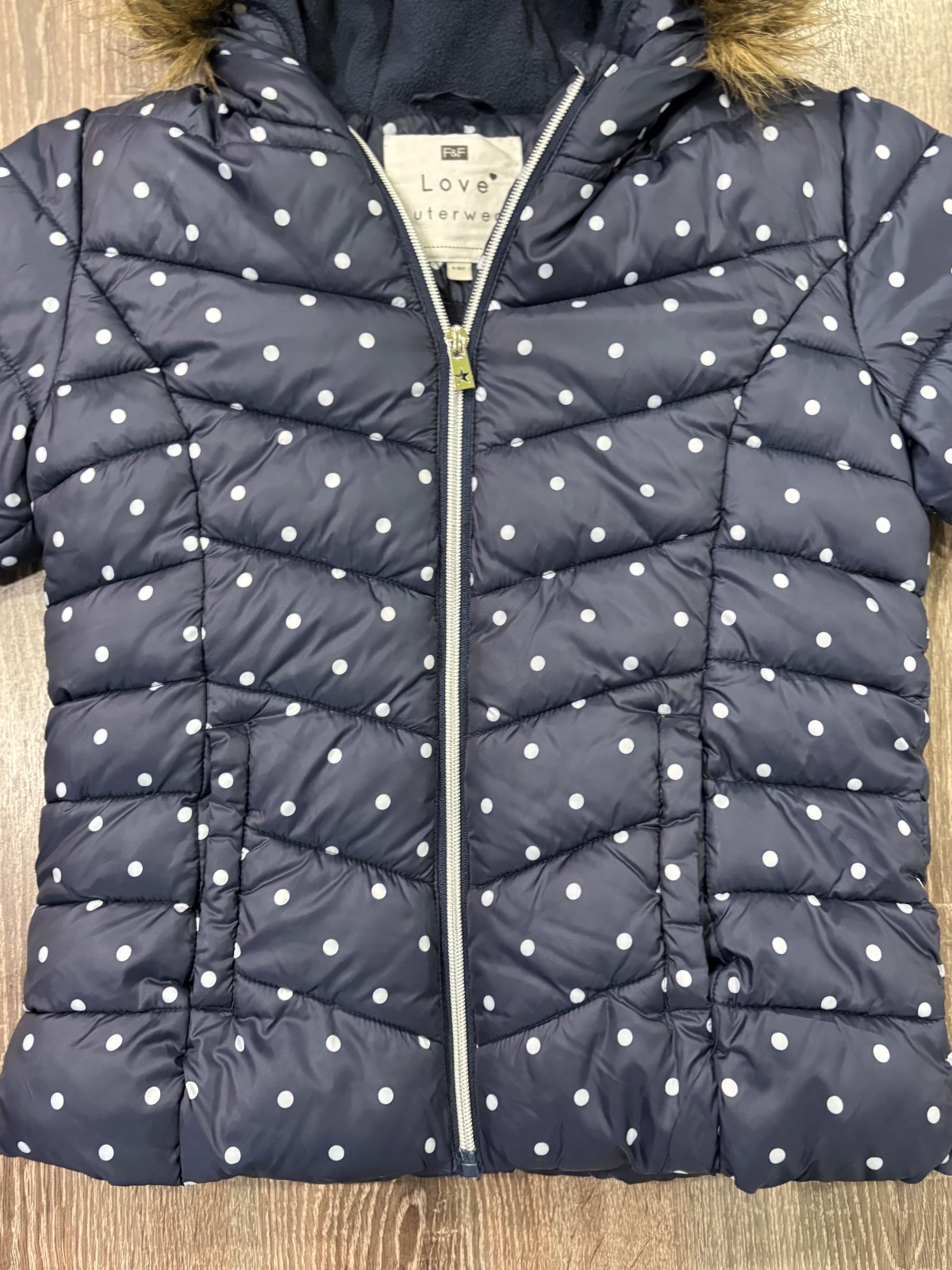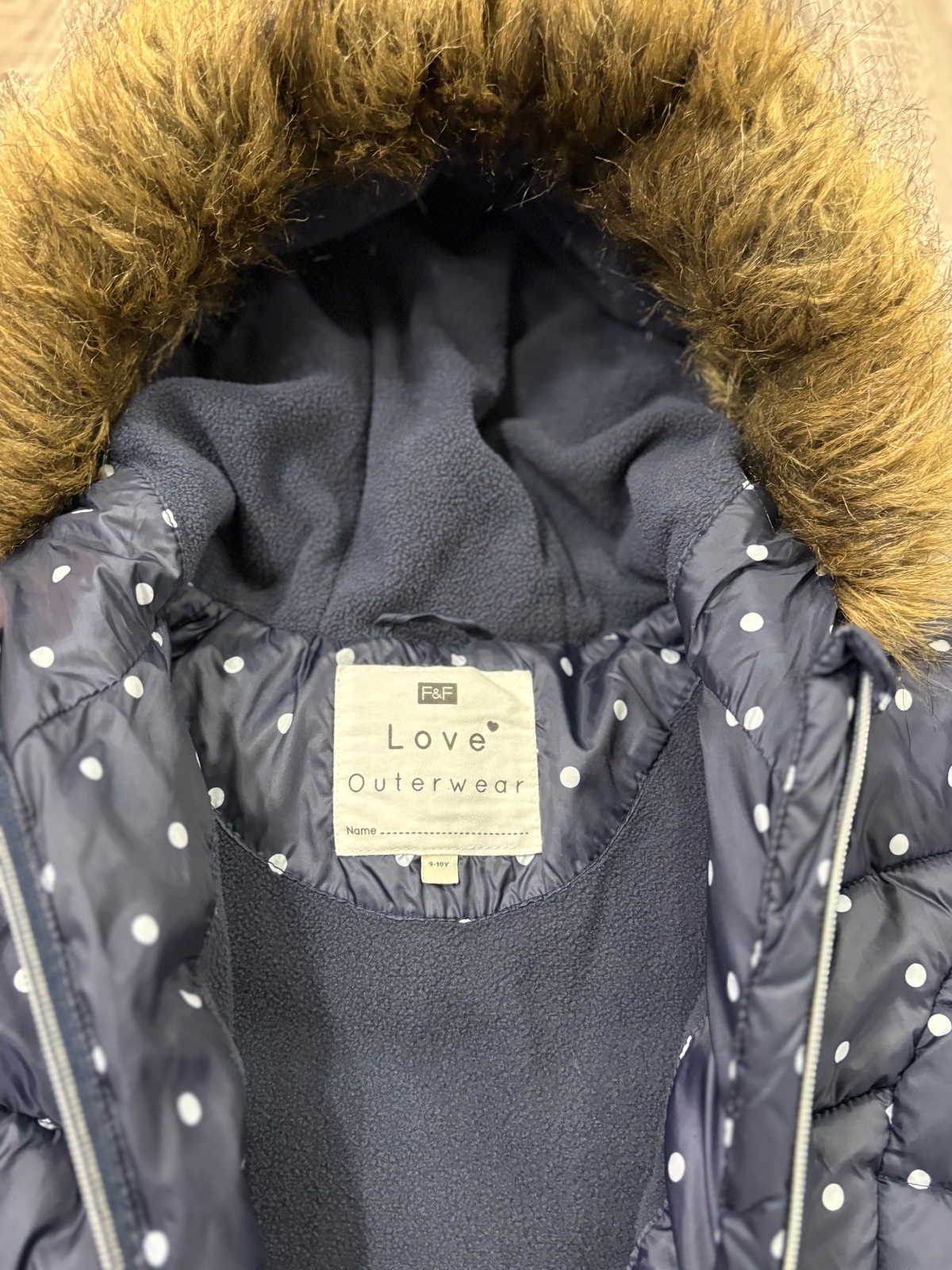 016.F&F dievcenska zimna vetrovka vo velkosti 9-10 rokov,kapucna s kozušinkou,ako nova.Dlzka je 53cm,dlzka rukava od krku je 57cm a sirka v podpazusi je 42x2cm