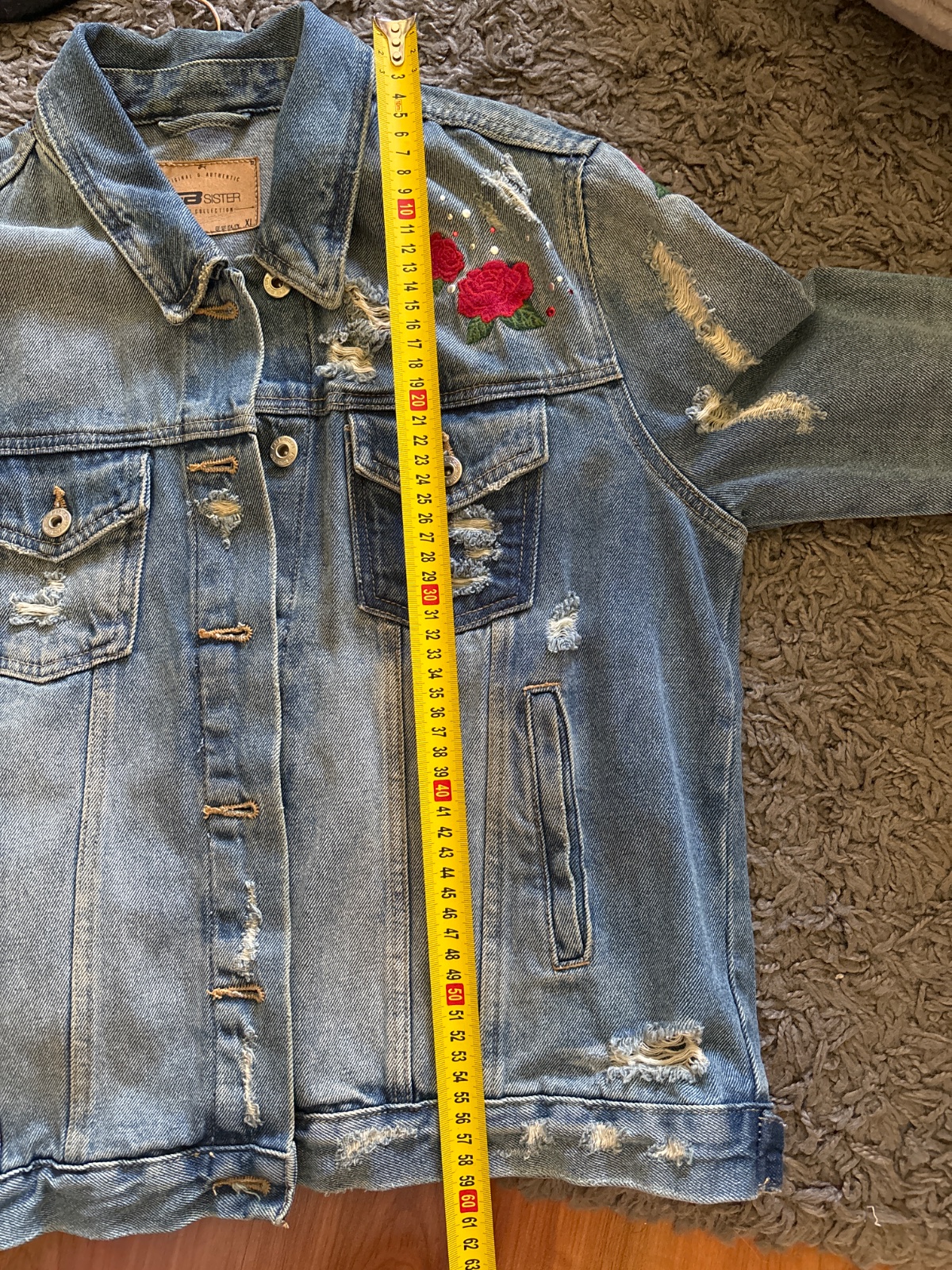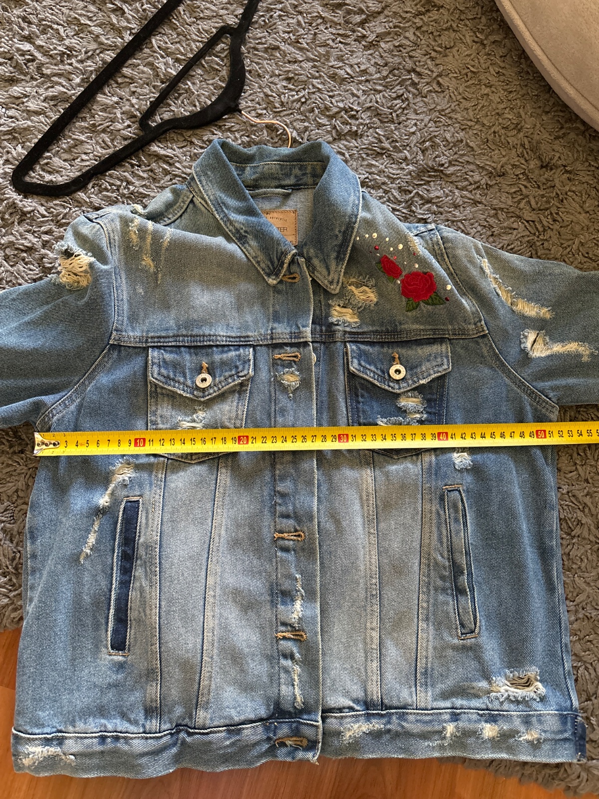 Trendy riflová bunda vo vintage štýle. Bunda je svetlomodrej farby s jemne „destroyed“ efektom a originálnou výšivkou červených ruží.