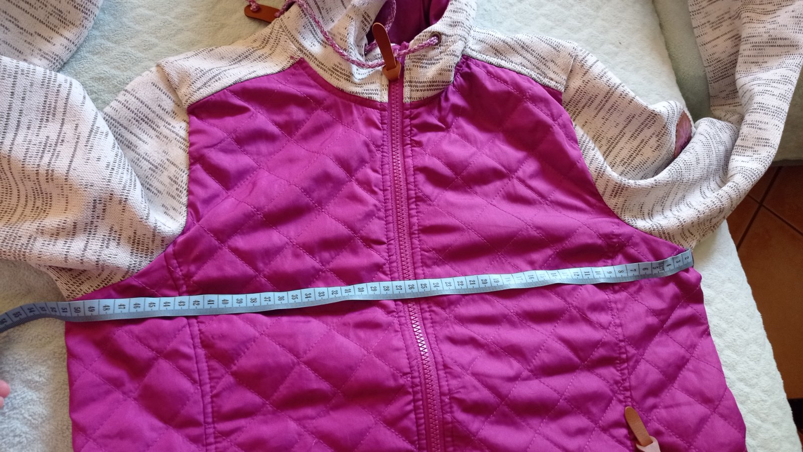 Stav je odfoteny aj rozmery, ma zmolky na patentoch a niekde uvoľnenú nitku.