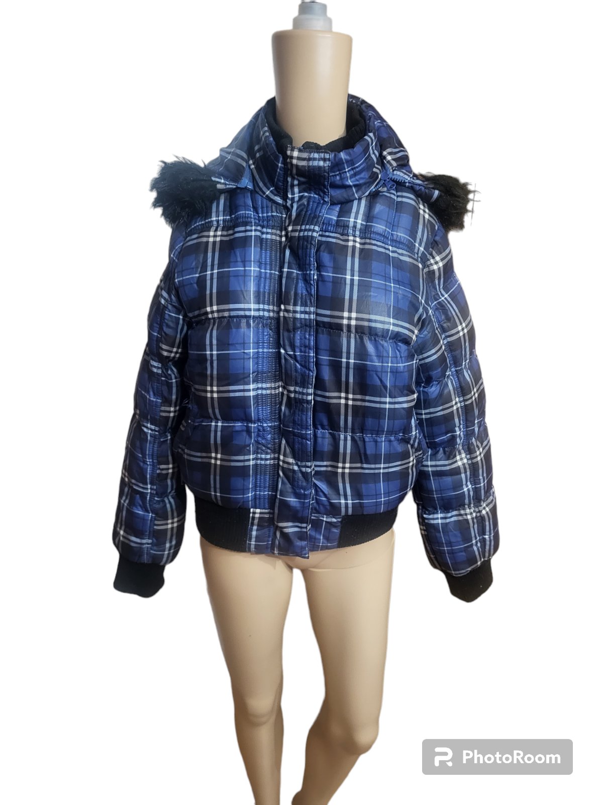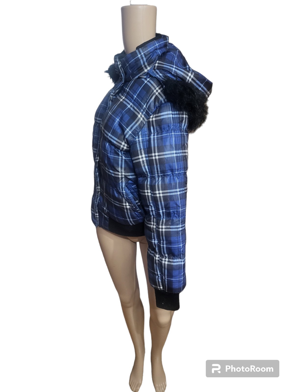 Dámska bundička s kapucňou. Zapínanie je vpredu na zips a cvoky. Dĺžka je 60cm,obvod hrudníka je 96cm a obvod pása je 92cm. Dĺžka rukáva je od krku 75cm