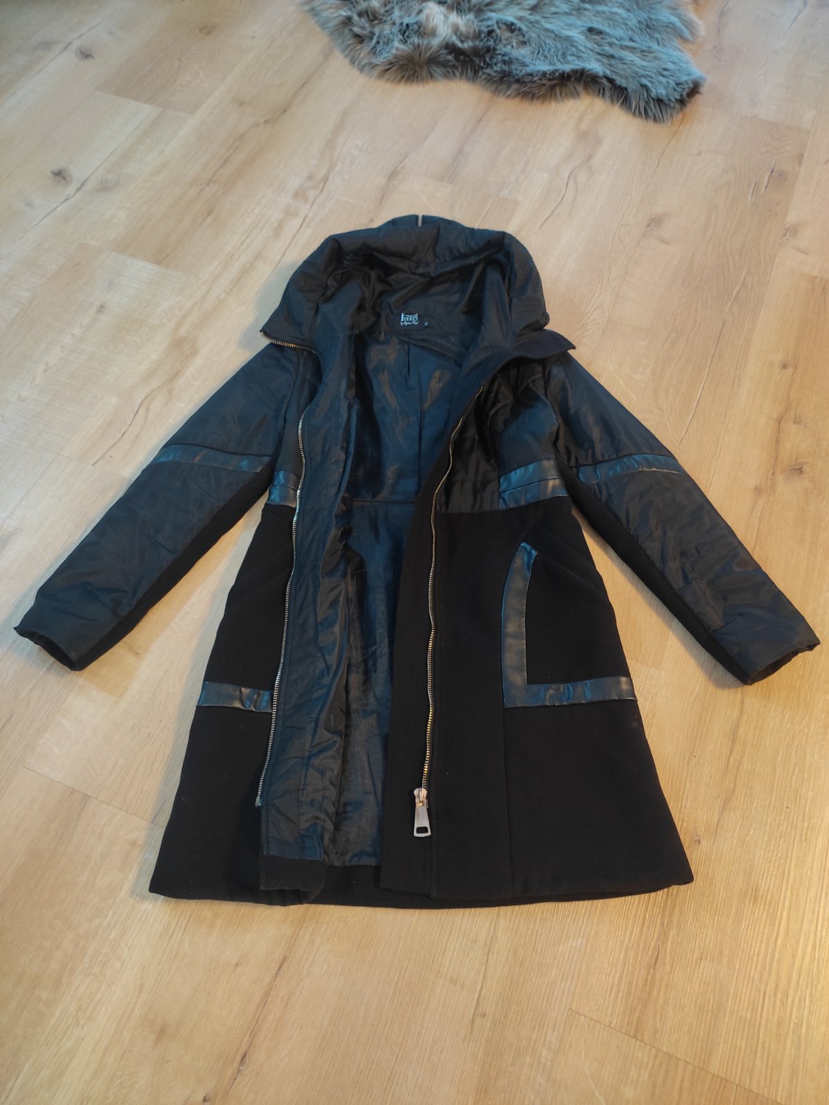 Veľmi pekný kombinovaný kabat,noseny krátko.Pekne sedí na postave,nepredávala by som ho,ale je mi malý.Miery: celková dĺžka 91 CM,šírka pod pazuchami 48cm,dĺžka rukáva od krku 73 CM.