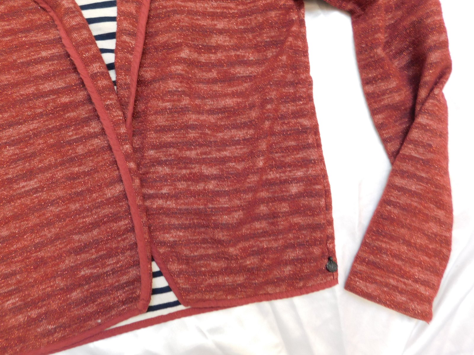 Luxusny mikinovy blejzer bez zapinania,tehlovej farby,s upletovou podšivkou.85%cotton,13=metallik,2=polyester.sem-tam žmolka,inak super stav. se11