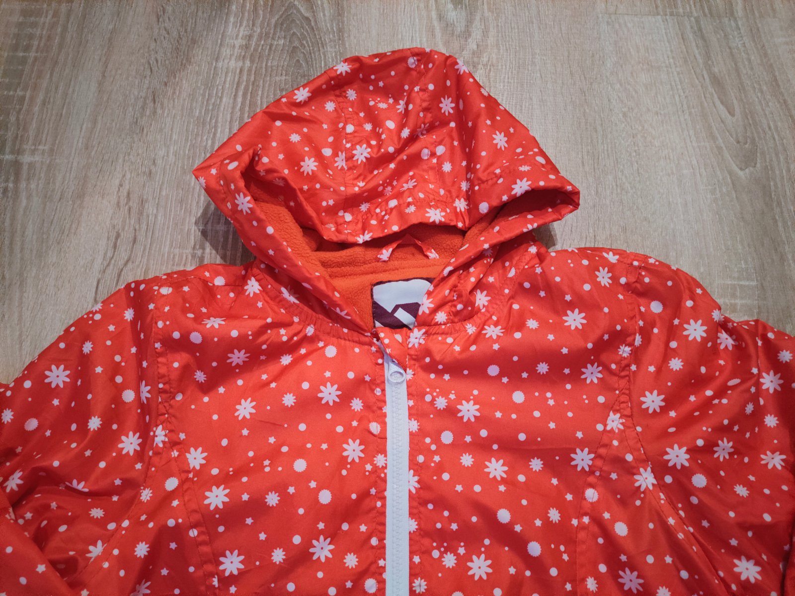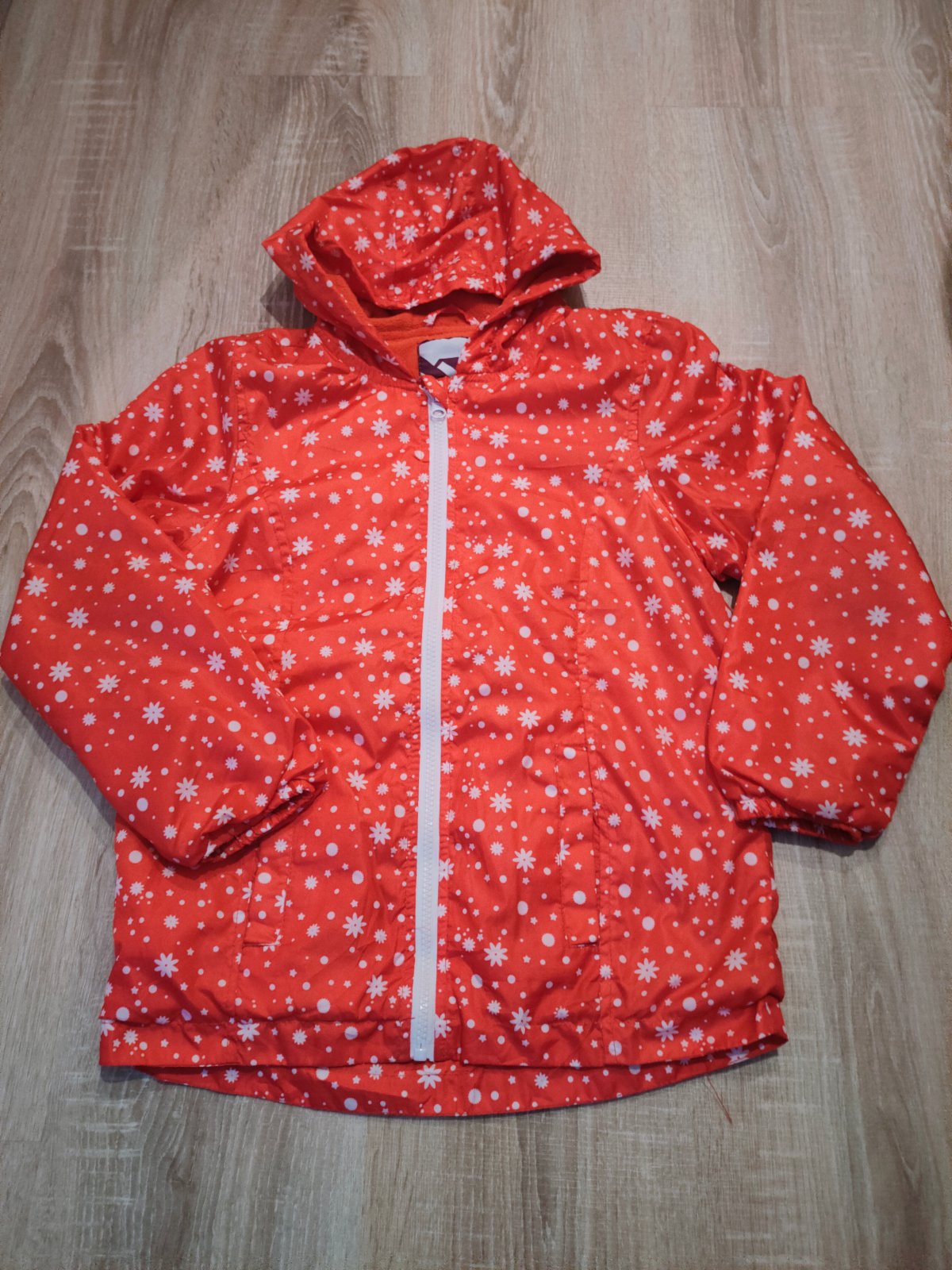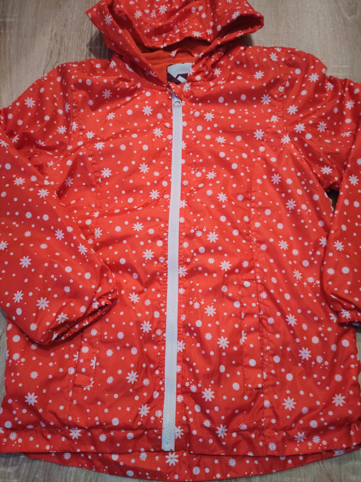 Ľahká vetrovečka na prechodné obdobie pre 6-7 ročné dievčatko. Kapucňa je poskladaná v golieri. Pár krát oblečená.