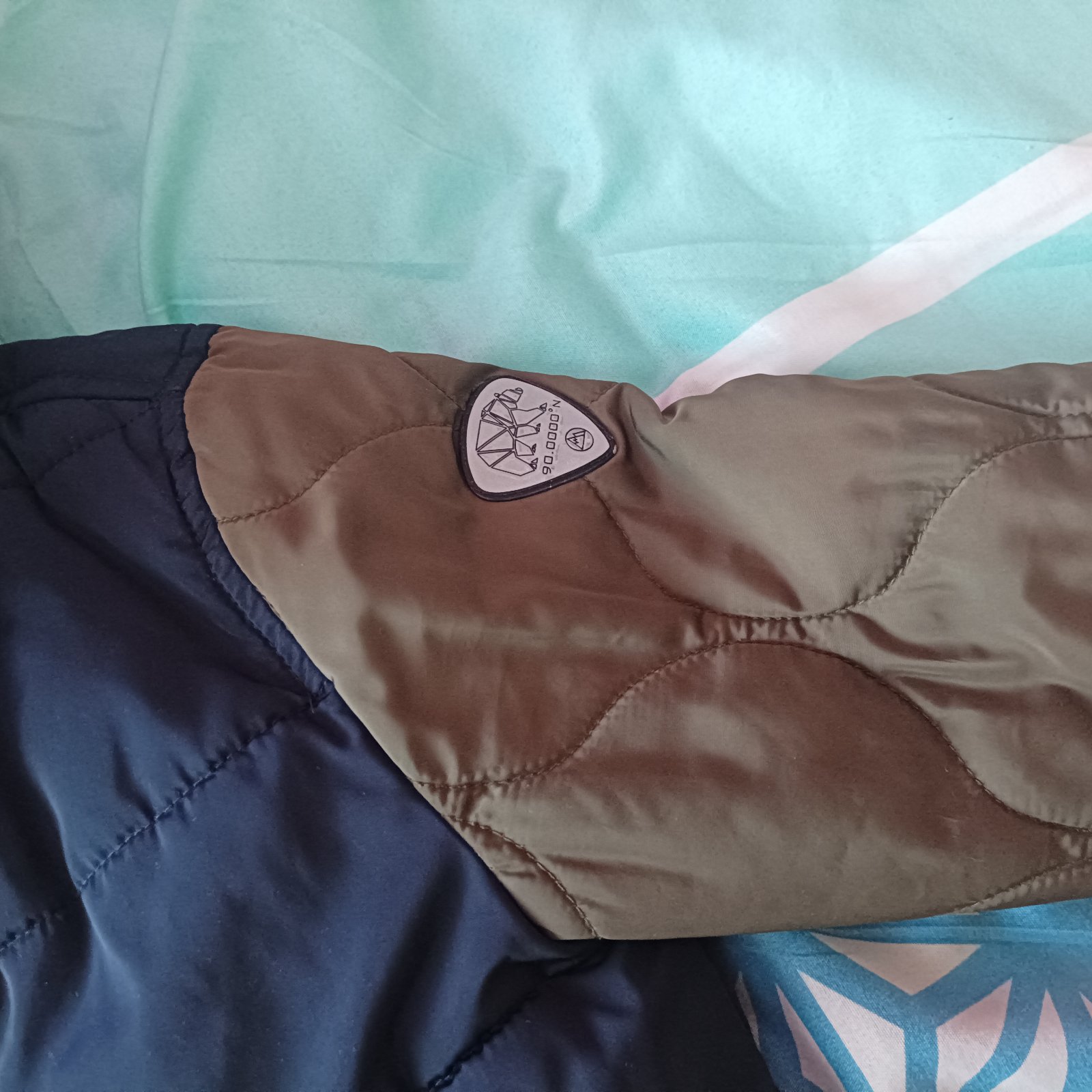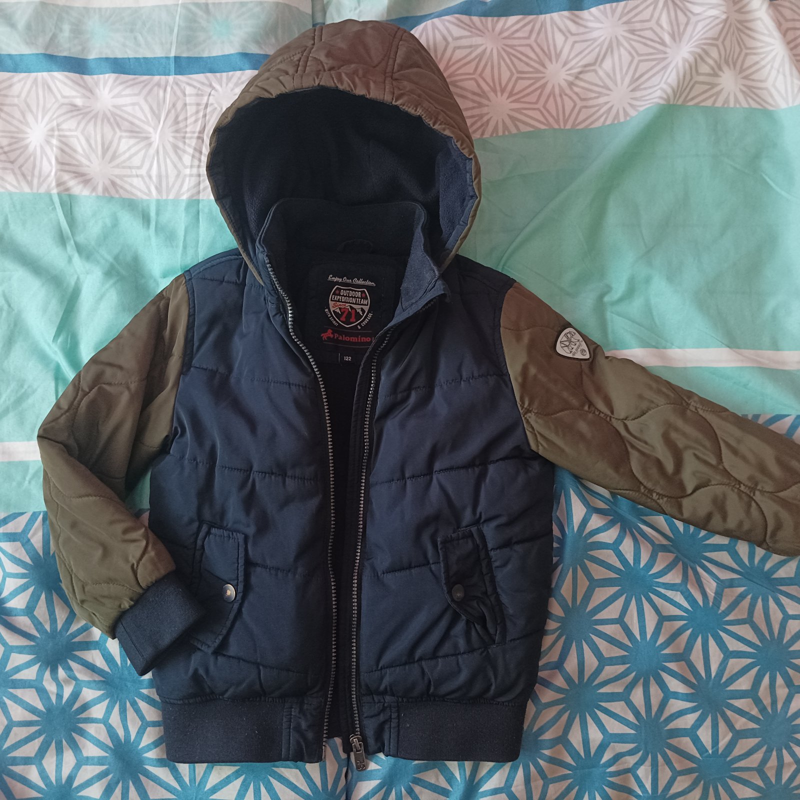 Jesenno-Zimná bundička zateplená veľ.122., Tmavo modrá farba,rukávi sú zeleno až Kakhi farby.Top stav bez zavad všetko potrebné nafotené.