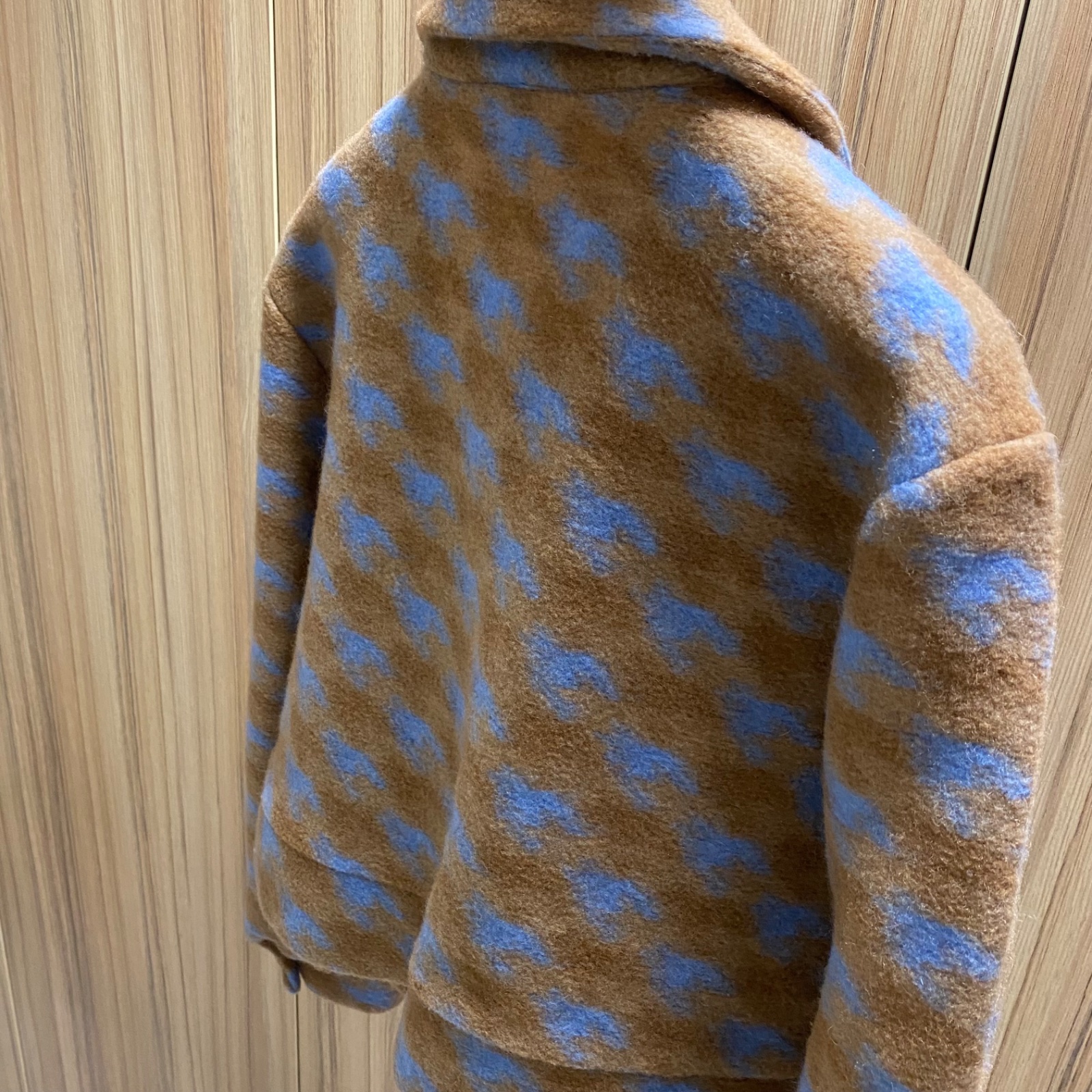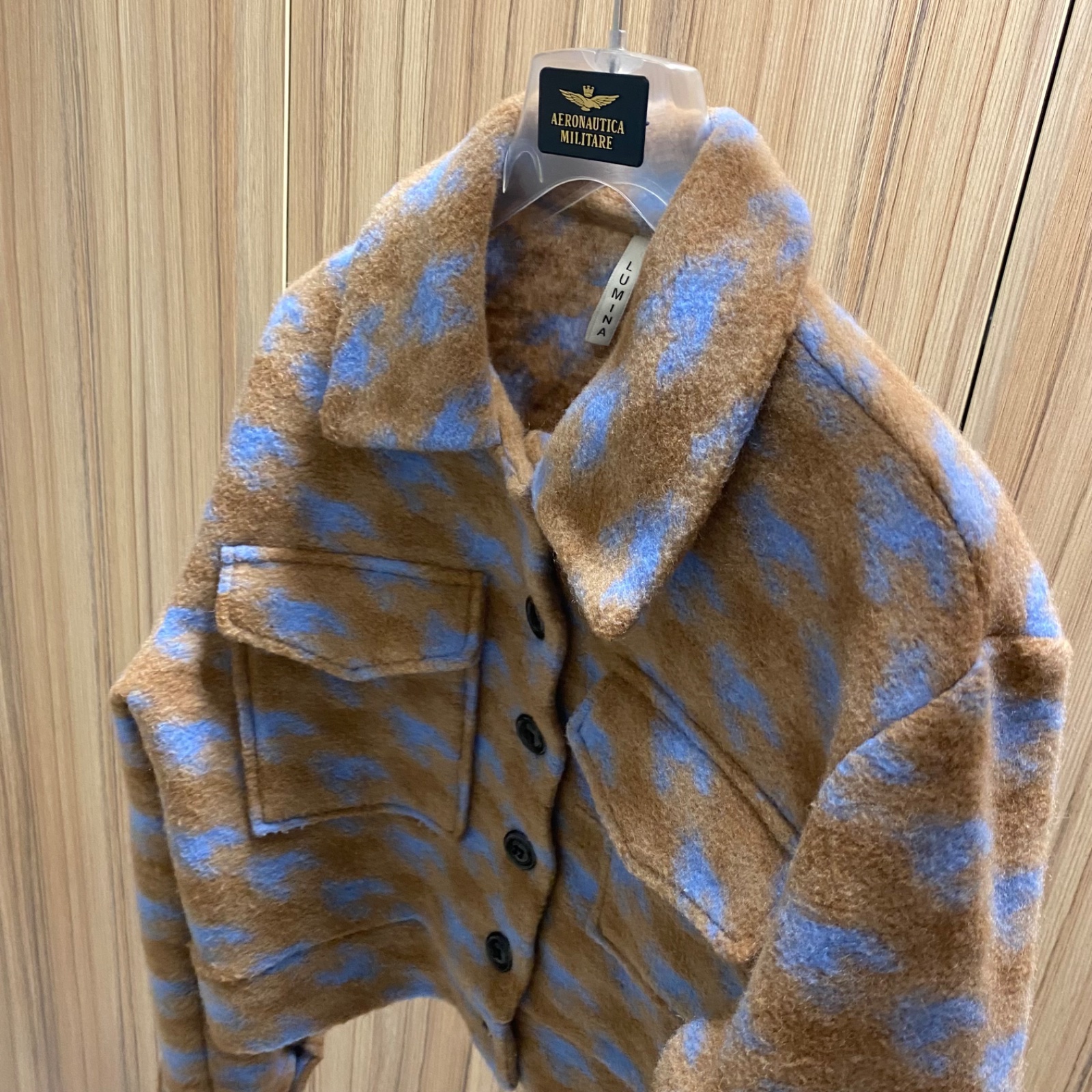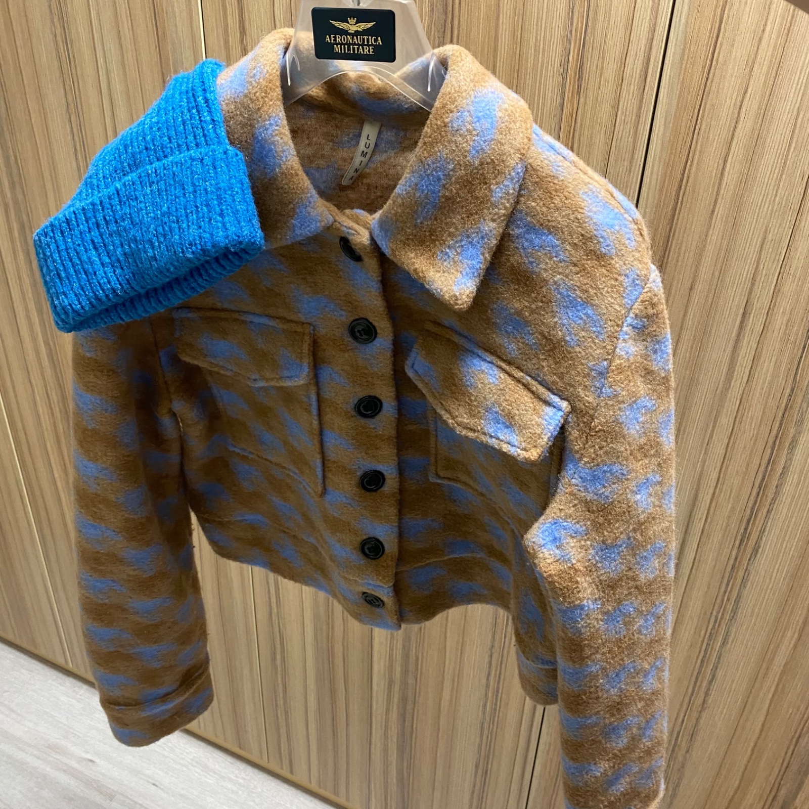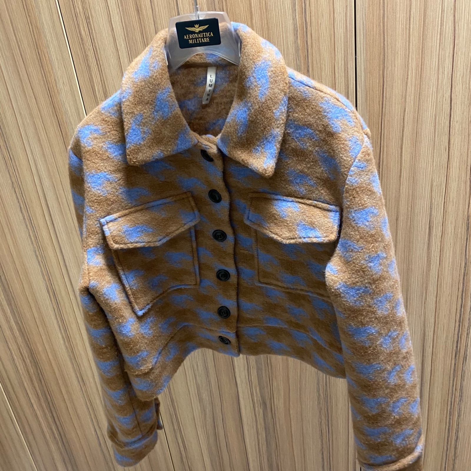 🩵🤎 Predám štýlový kabátik, uvedená veľkosť M, sedí UNI XS - M. Vzor “kohútia stopa”. Pekný nosený stav. Čiapka na foto zn. Stradivarius tiež na predaj (6€).