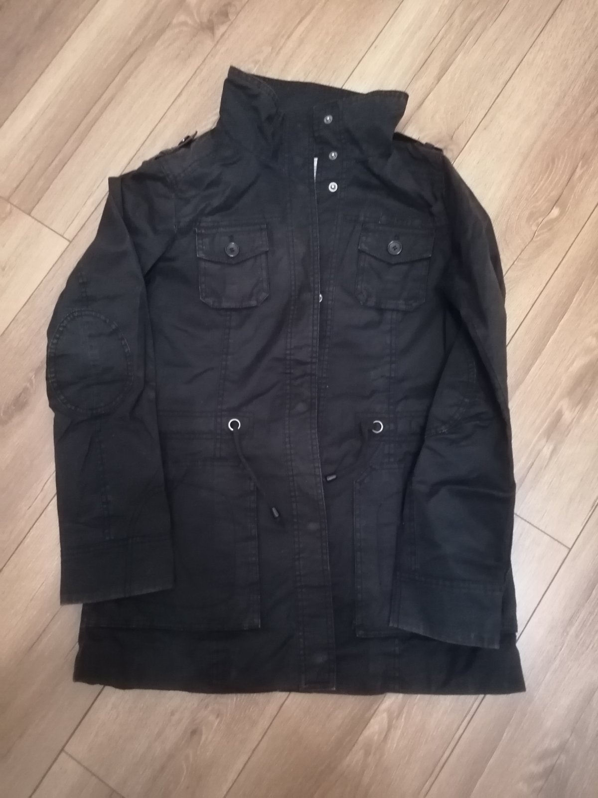 Pekný kabátik, skryté gombíky, odopínateľná kapuca, možnosť stiahnutia v páse. Jemne aj podšitá, bezchybný stav, ako nová. Farba je sýto čierna. šírka pod pazuchami 44cm, celková dľžka 63cm, dľžka ...