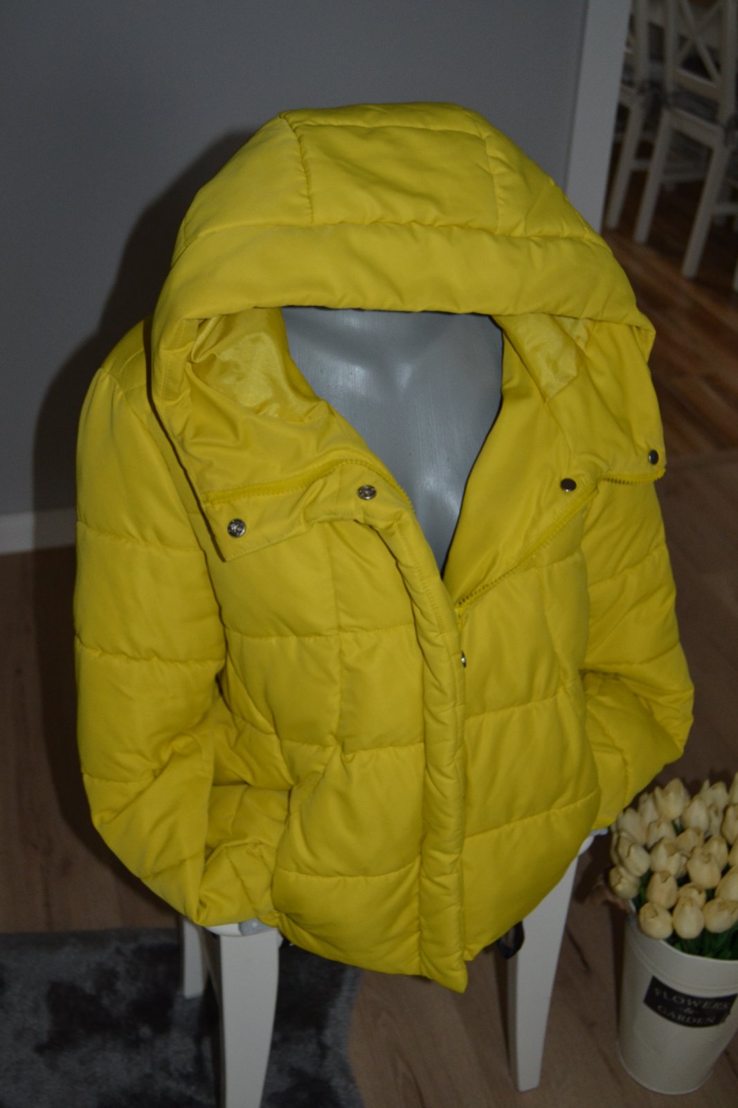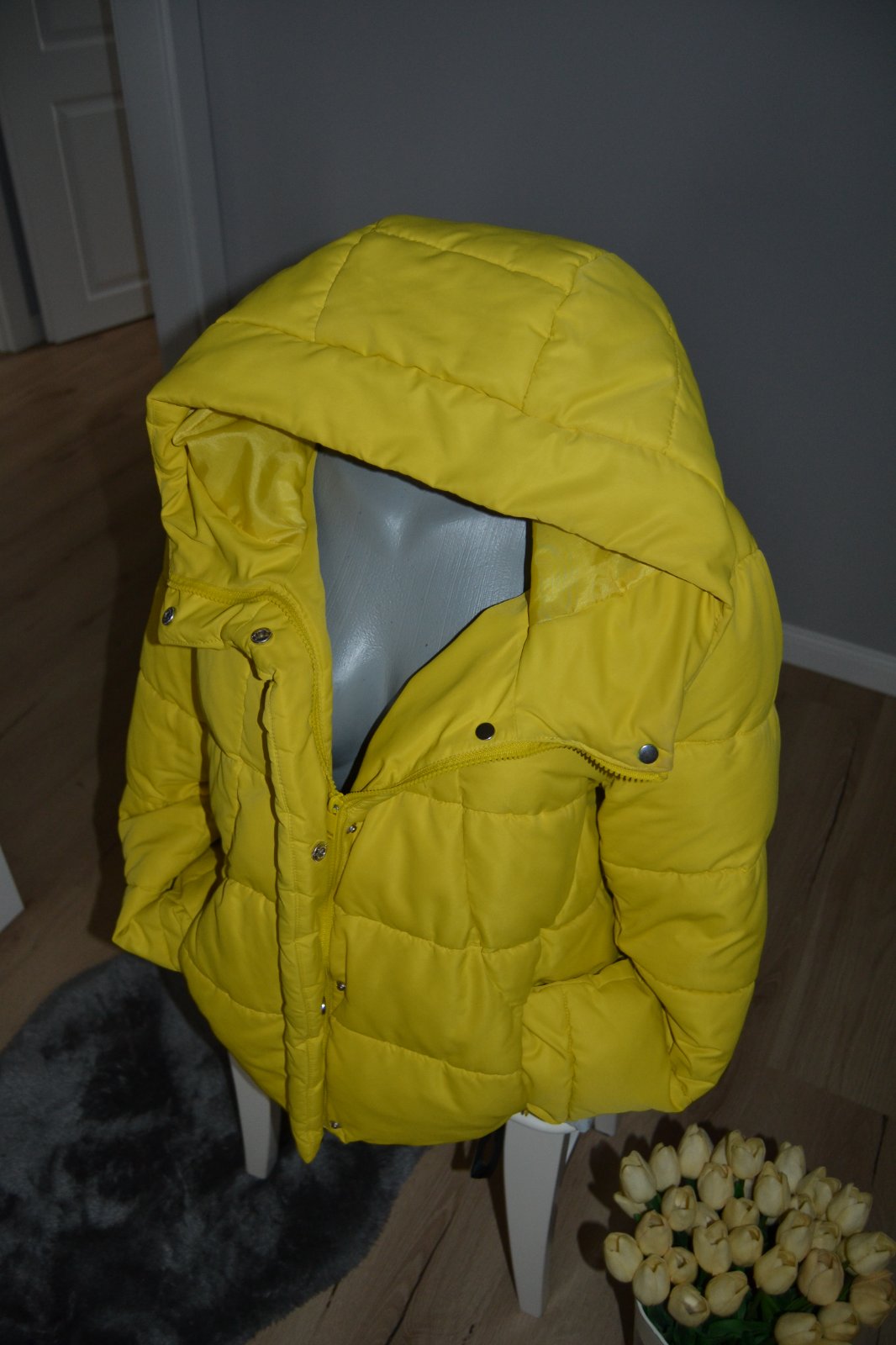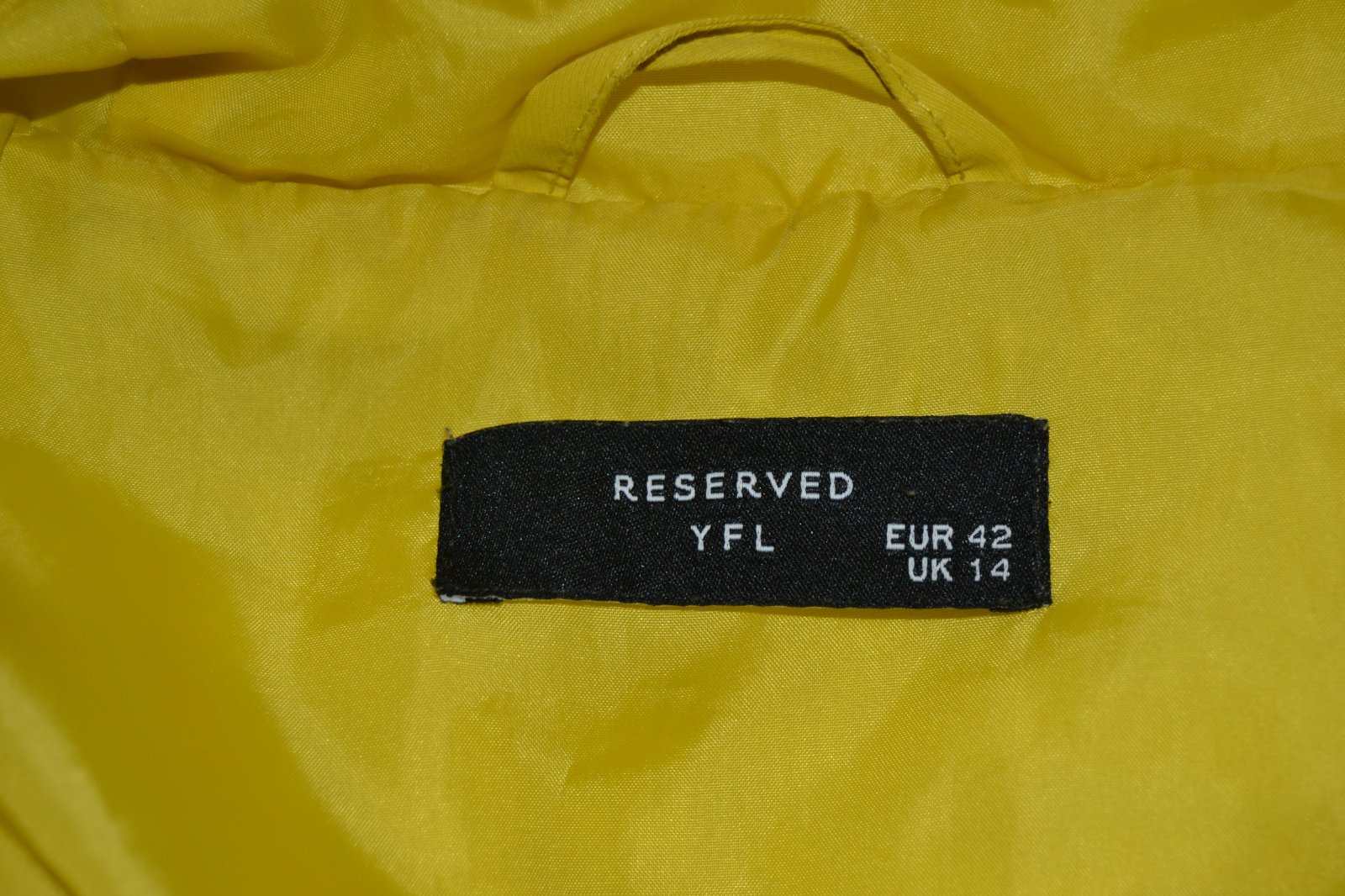 Prešívaná bunda s prírodným perím žltej farby, zn. Reserved, veľkosť 42, rozmery obvod hrudník 63x2 cm, dĺžka 60cm, rukávy 60cm.