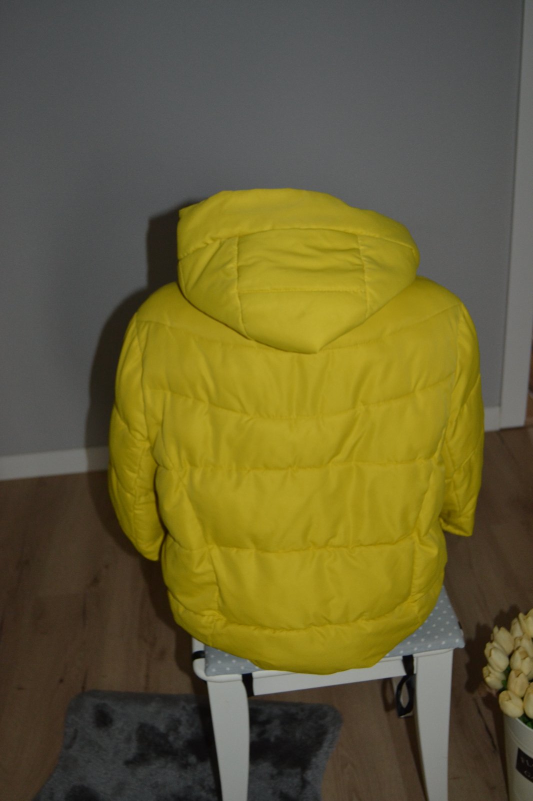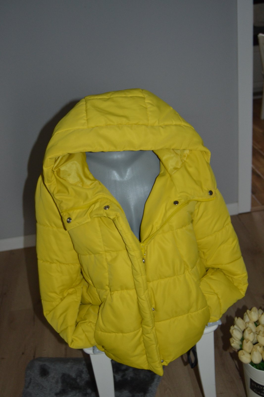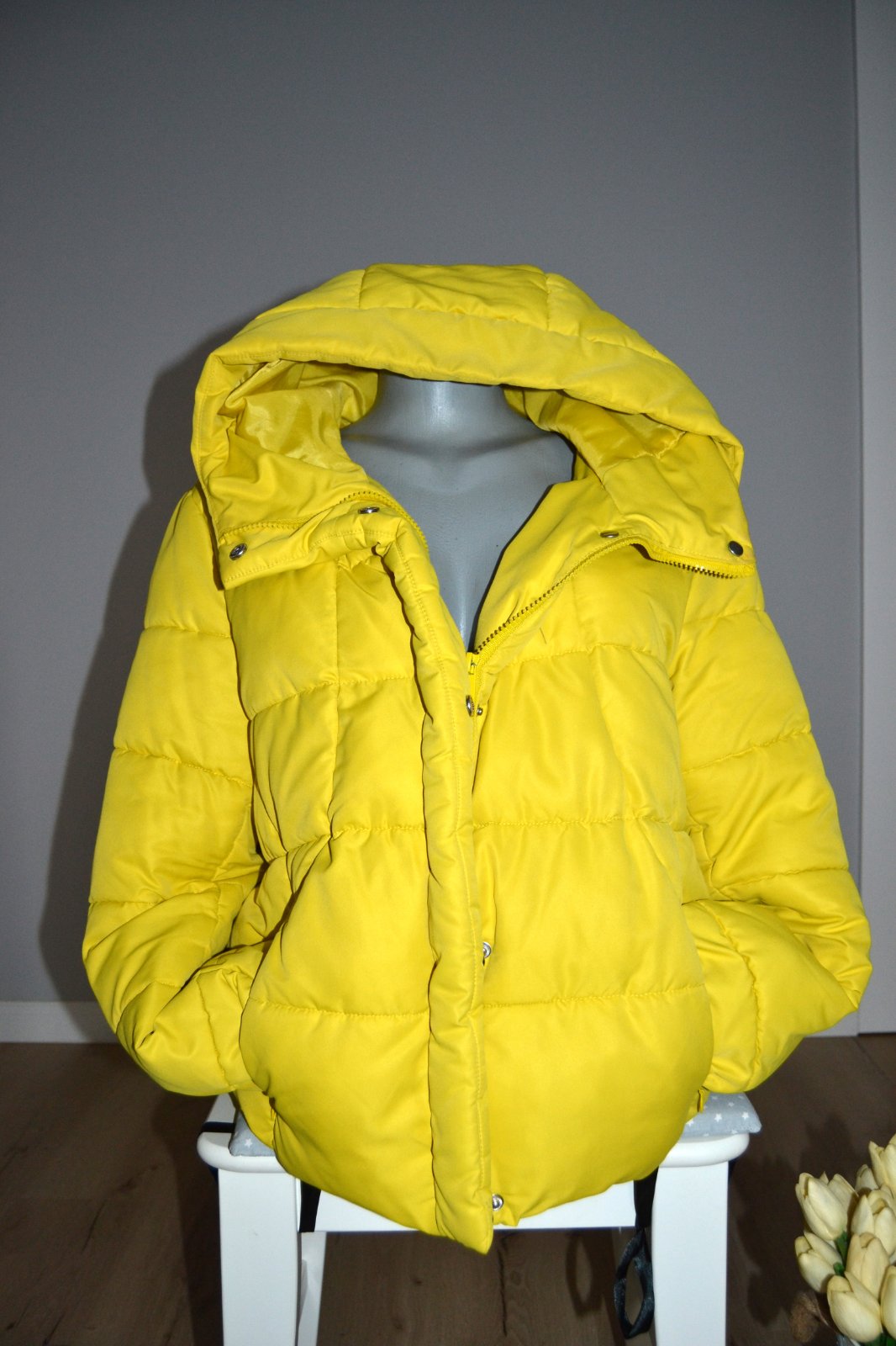 Prešívaná bunda s prírodným perím žltej farby, zn. Reserved, veľkosť 42, rozmery obvod hrudník 63x2 cm, dĺžka 60cm, rukávy 60cm.