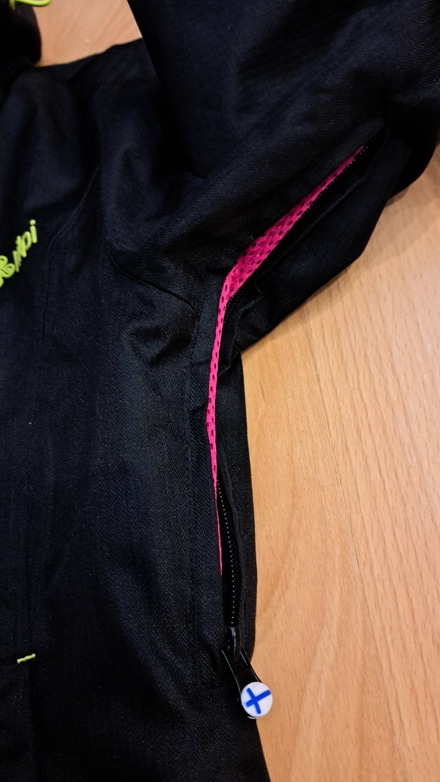 Veĺmi pekná, kvalitná funkčná značková lyžiarska bunda Má odnímateľnou kapucňou, možno ju tvarovať pomocou karabiniek. Má vyvýšený límec na ochranu brady. Zapínanie zipsom až po vrch stojačika na ochranu brady. Má funkčné vrecká na bokoch. Vetracie otvory pod pazuchami.