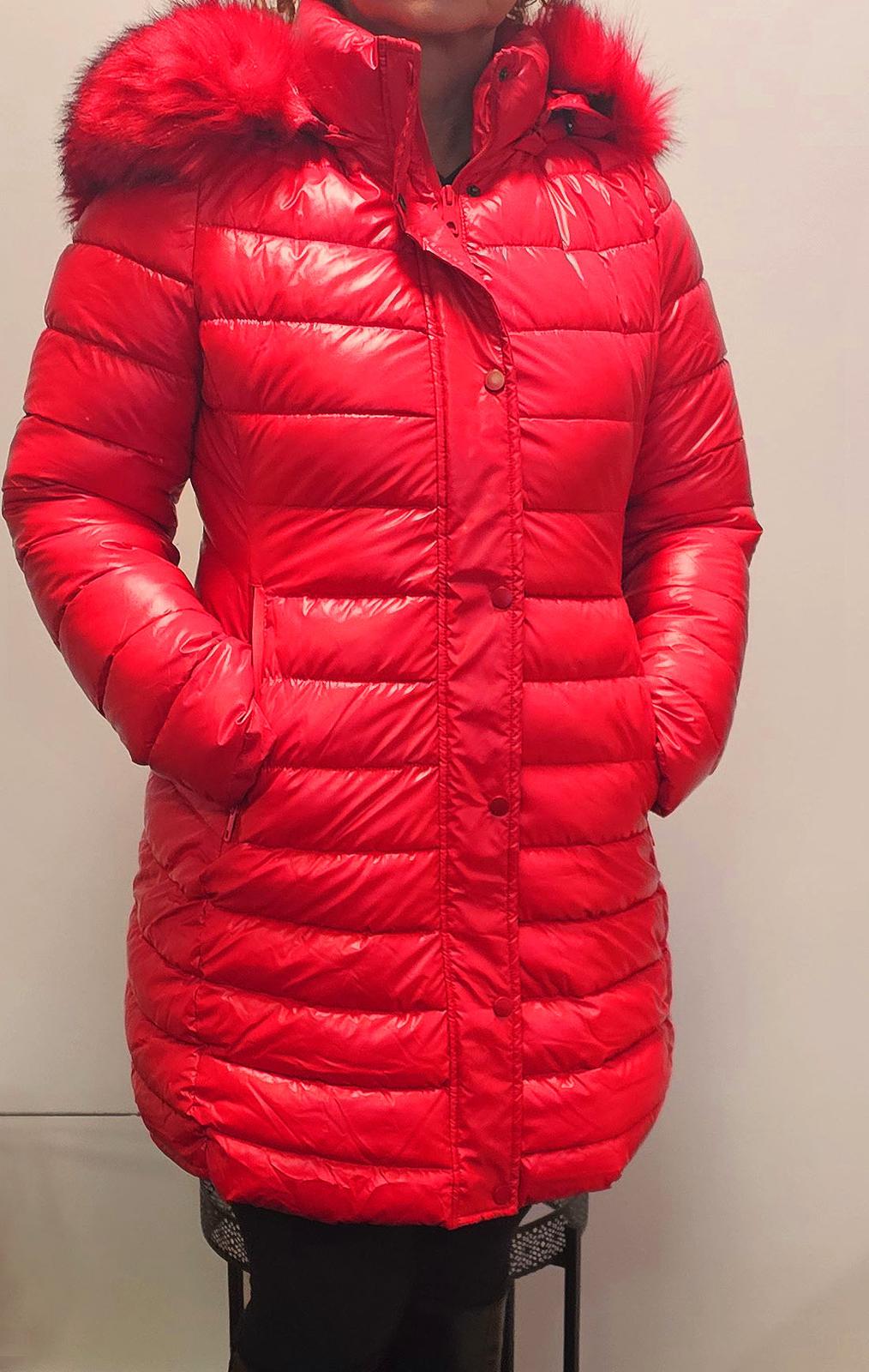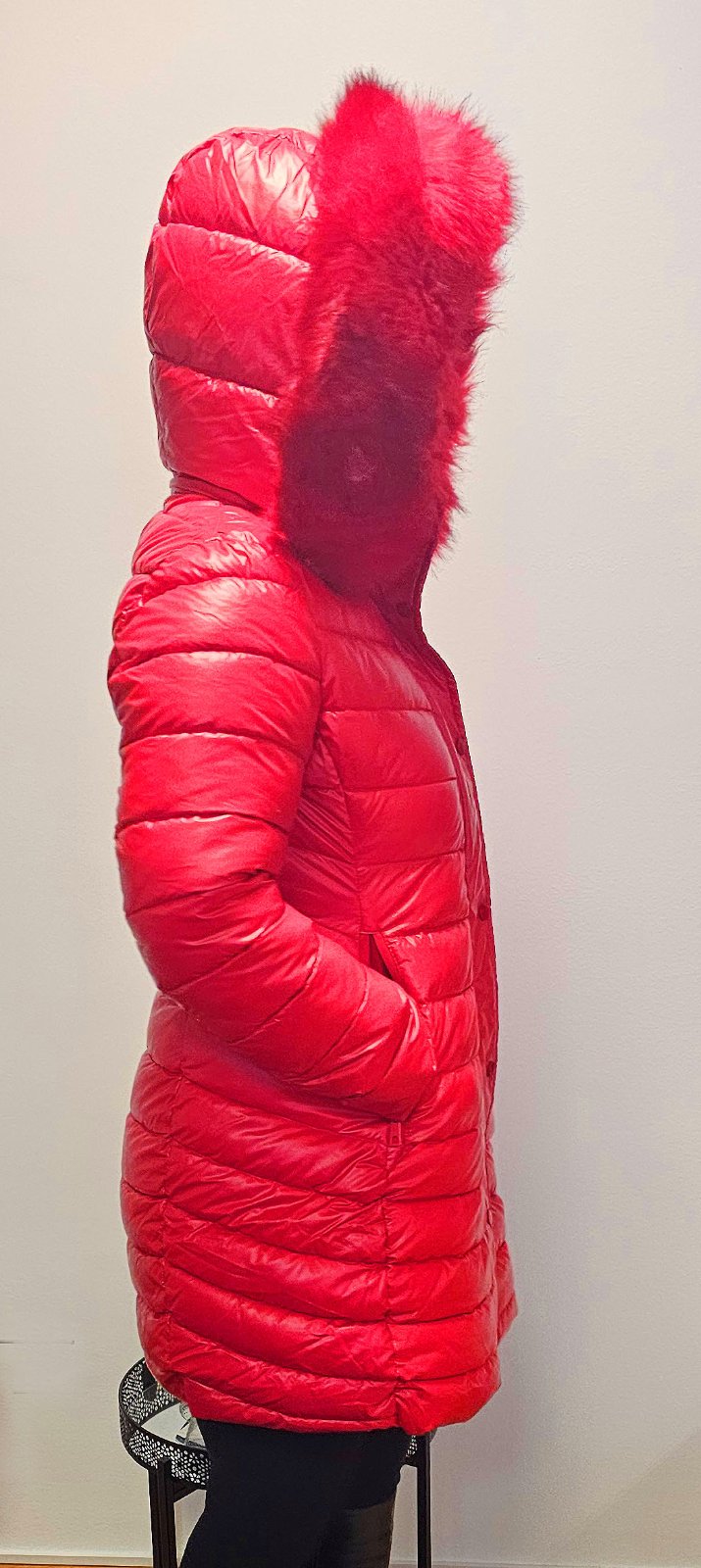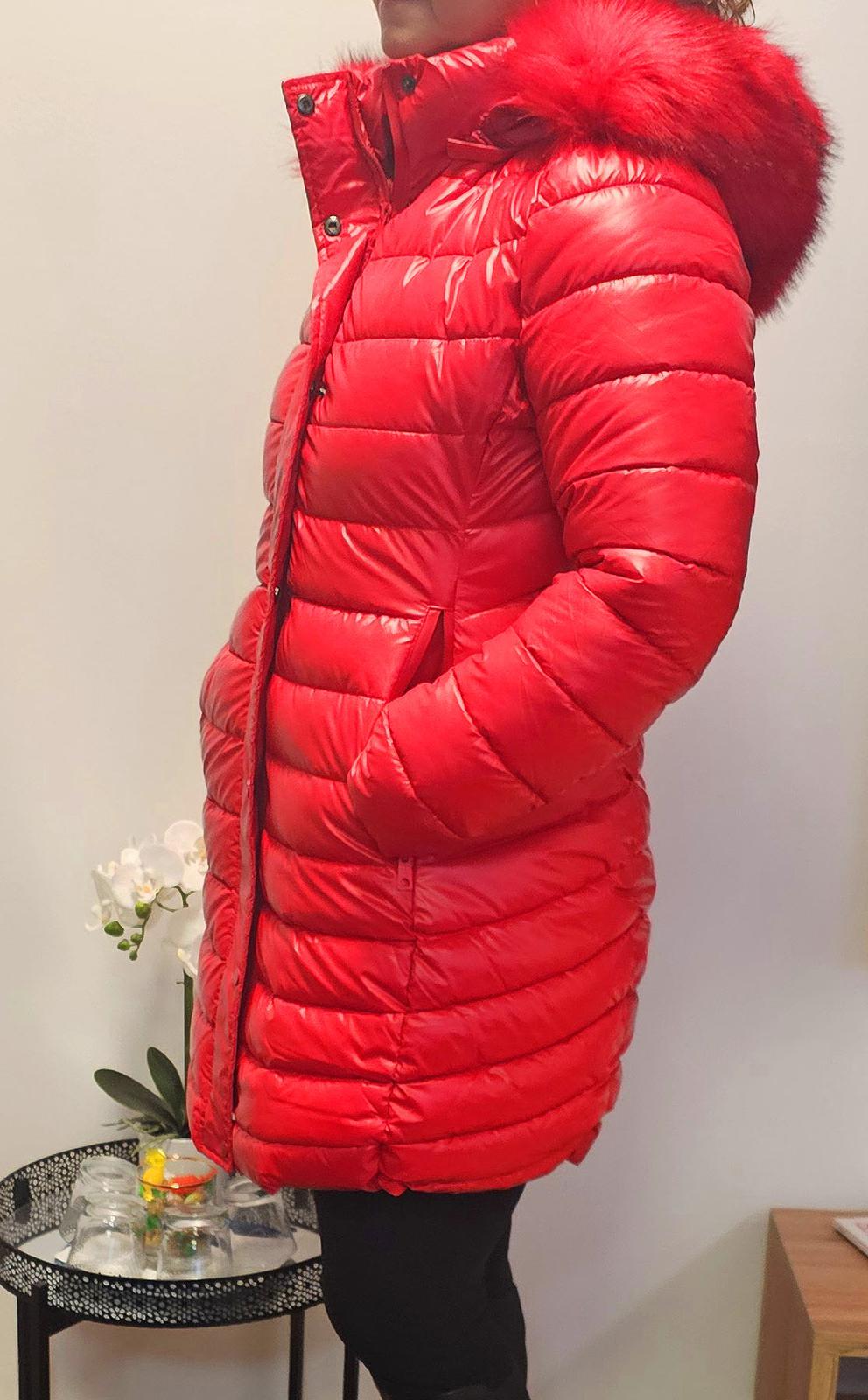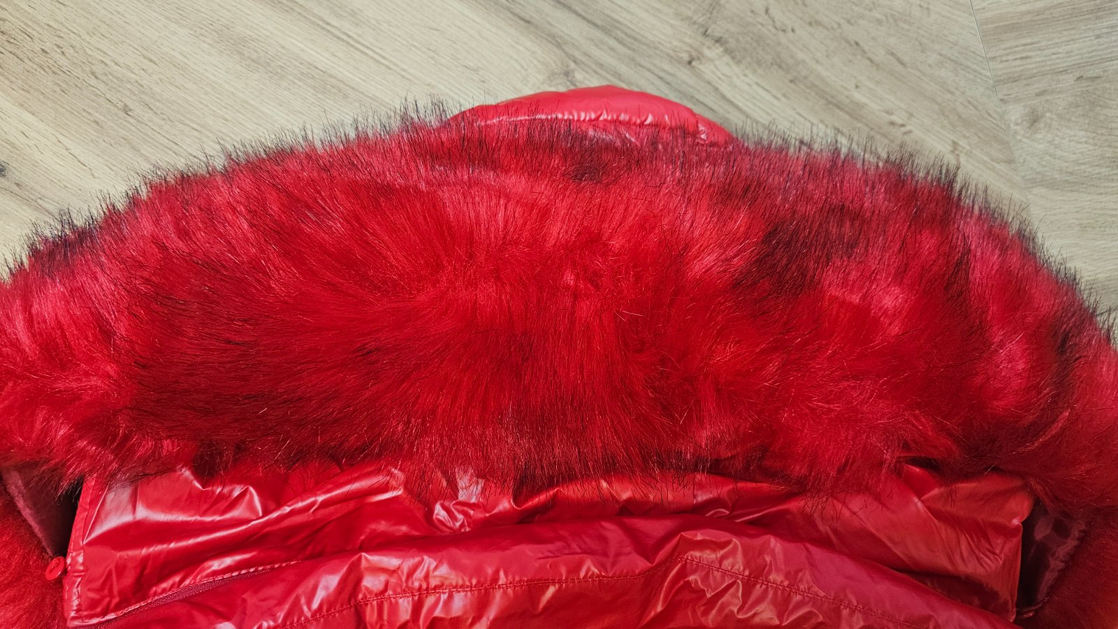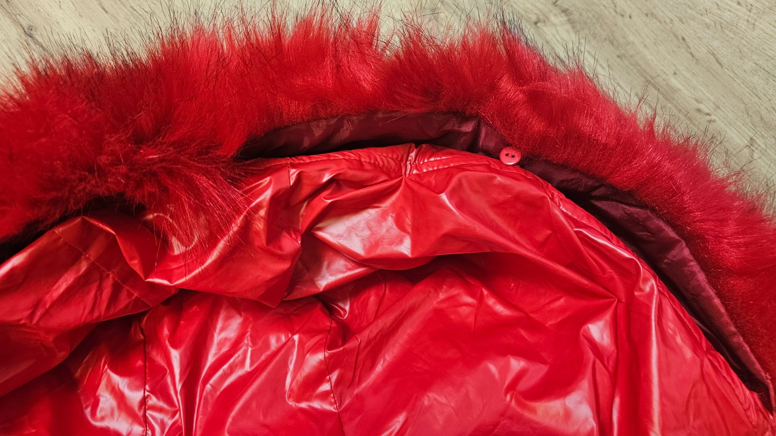 Výborný stav, minimálne nosená. Krásna výrazná farba. Teplá vatovaná. Dĺžka 87 cm, dĺžka rukáva od krku 76 cm, šírka v hrudníku 56x2 cm, šírka v páse 49x2 cm. Kožušinka odnímateľná. Výplň na chrbte zvnútra teplý mäkký a jemný flees.