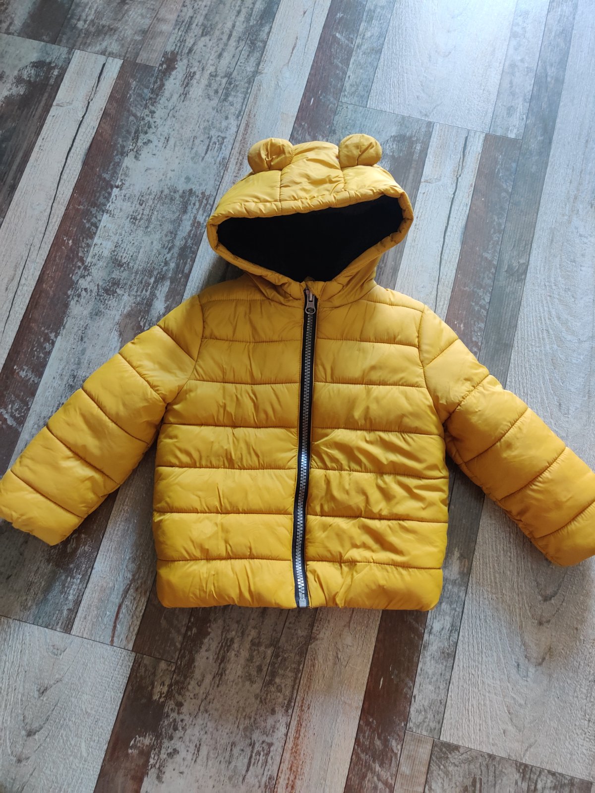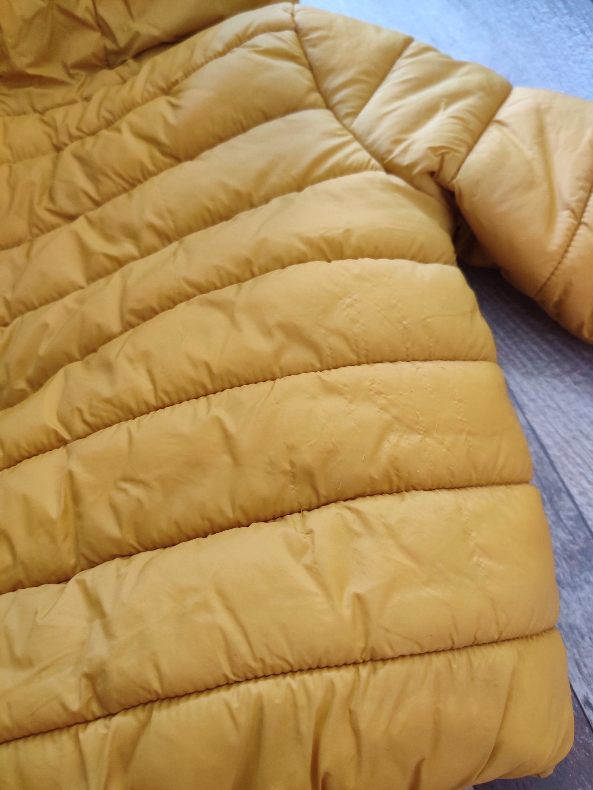 Oblečená asi 3 krát, bez akýchkoľvek poškodení, farba je horčicová, veľkosť uvedená S ale oblečie v pohode M, má vnútorné vrecko, je teplá, pohodlná