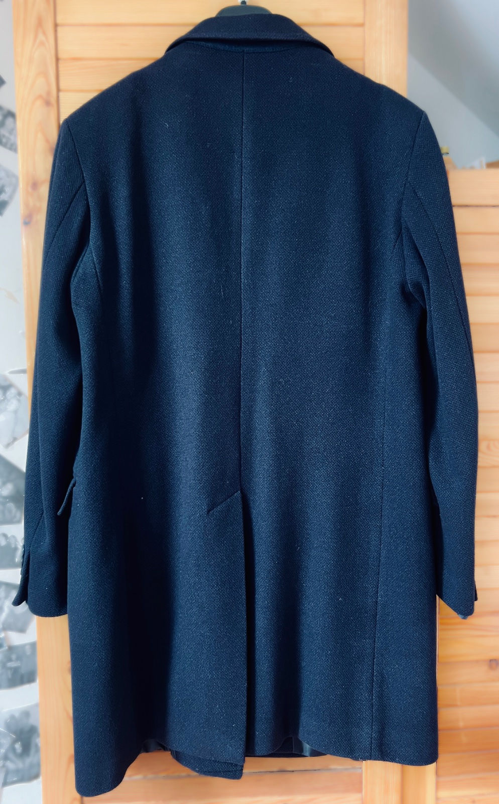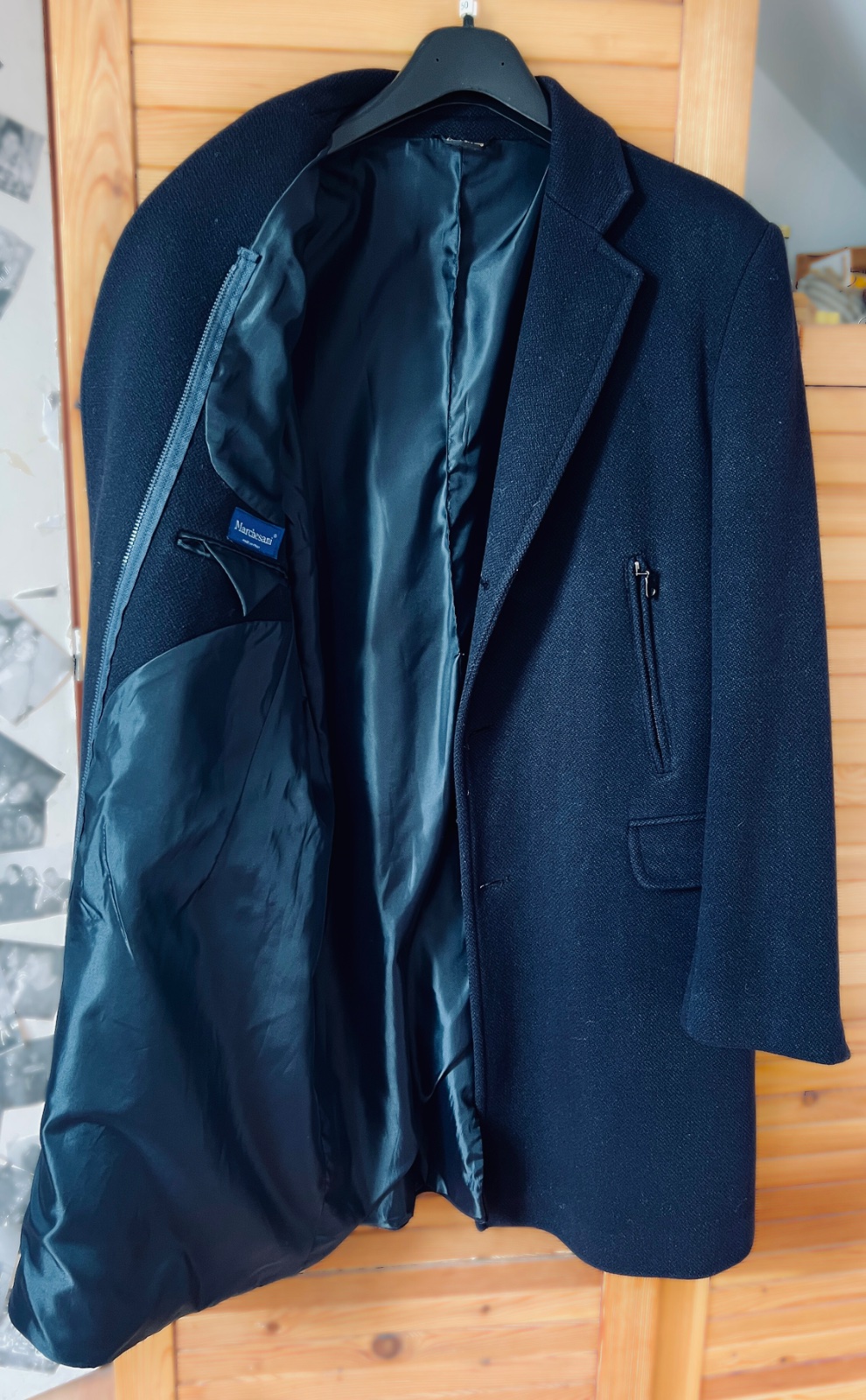 Teplý pánsky čierny kabát, podšitý. Zapína sa na gombíky a aj na zips. Má vonkajšie vrecká a jedno vnútorné. Veľkosť M.