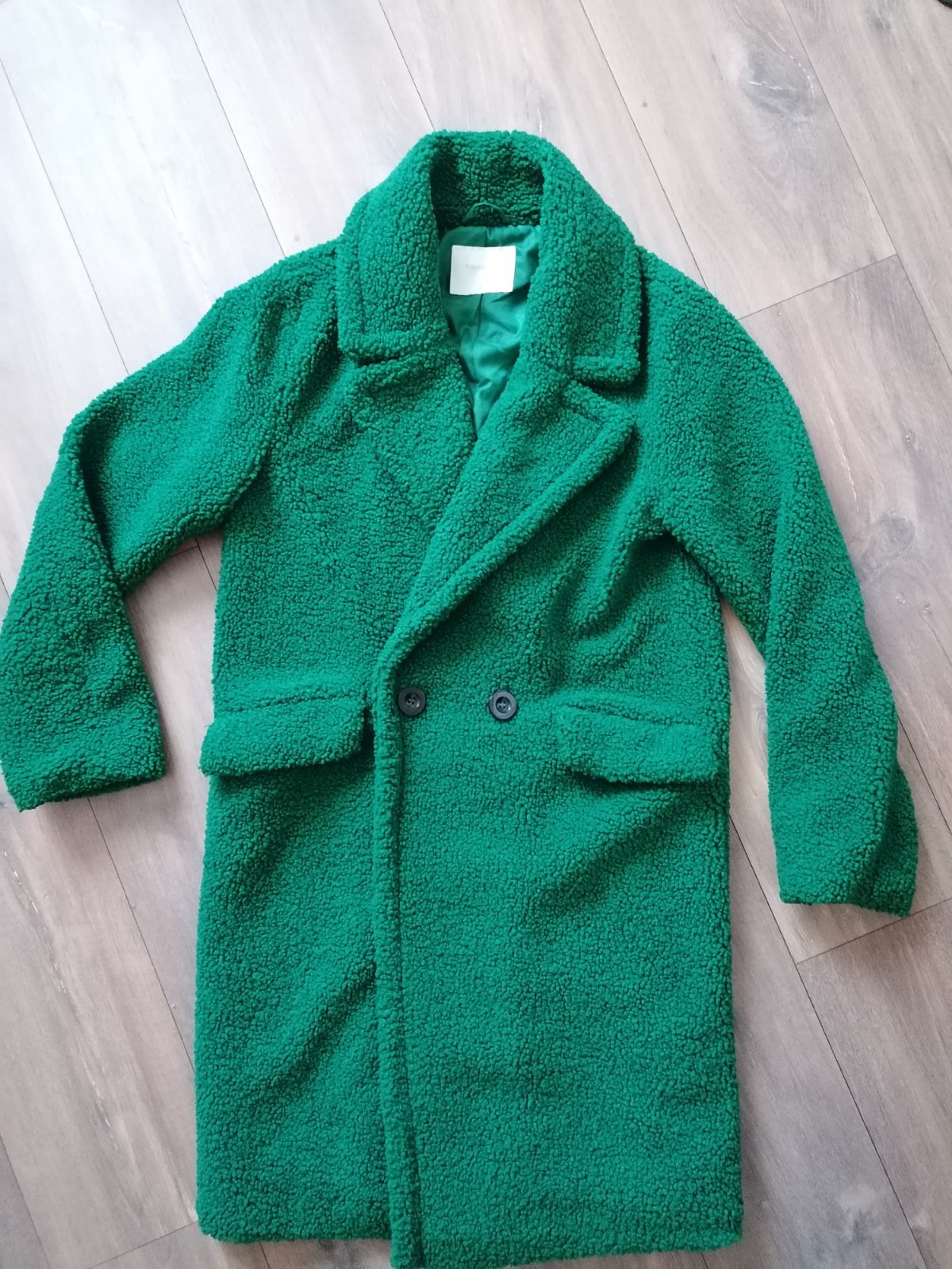 Nádherny Teddy kabát, kľudne na zimu, je ozaj celkom hrubý. Farba je krásna sýta smaragdovo zelená, ťažko sa mi to fotí. Vo veľmi peknom stave, bol máličko nosený, mne takéto oversized stihy príliš nepristanú. Dlzka 97 cm, šírka cca 50 cm.