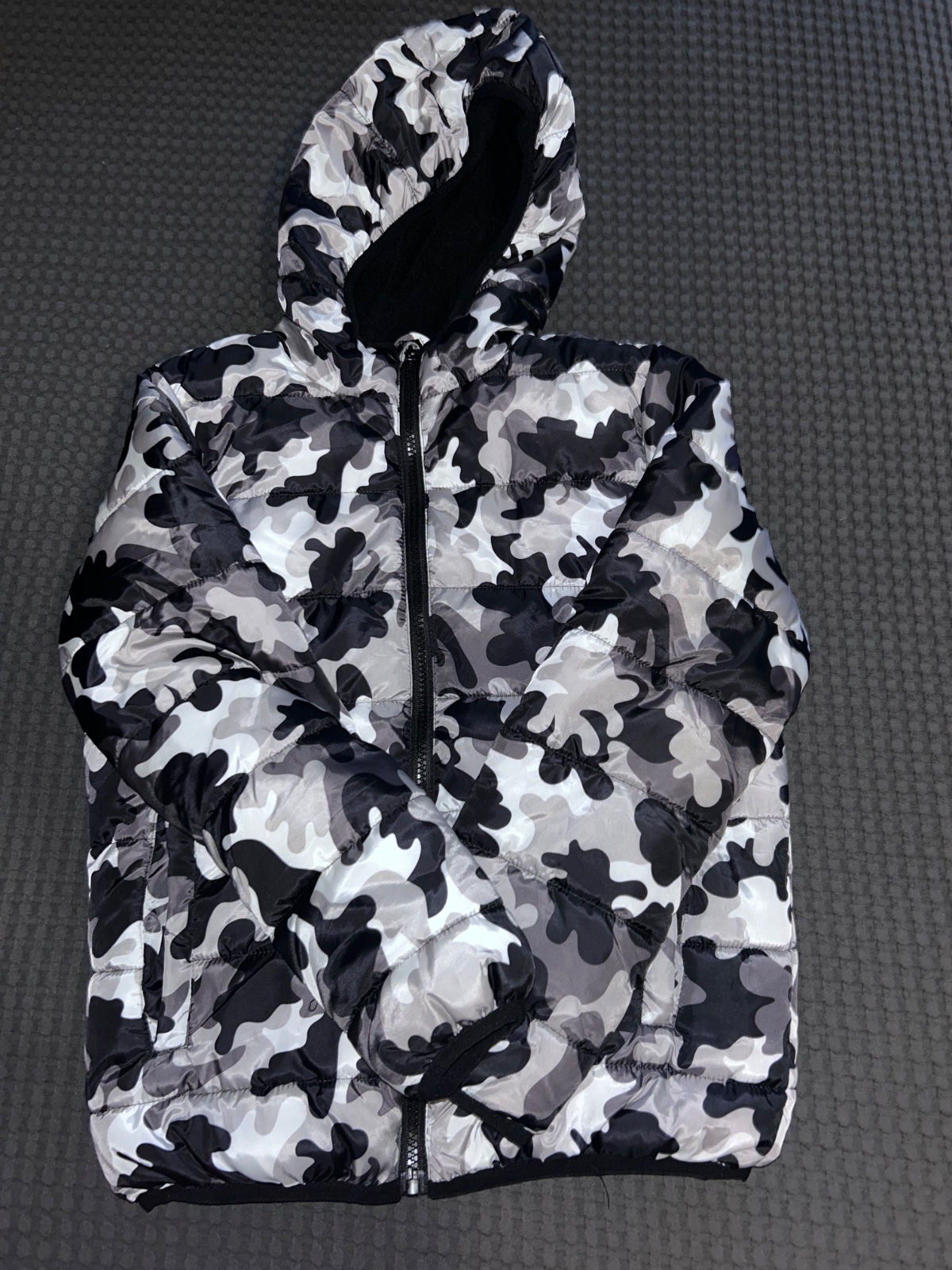 Vo velmi dobrom stave, bez poskodenia Aj zips bezi bez problemov. Po prani vsak vypln scvrkla , preto ma vnutro niekde jemne hrcky. vidiet to neni a neprekazaju pri noseni.