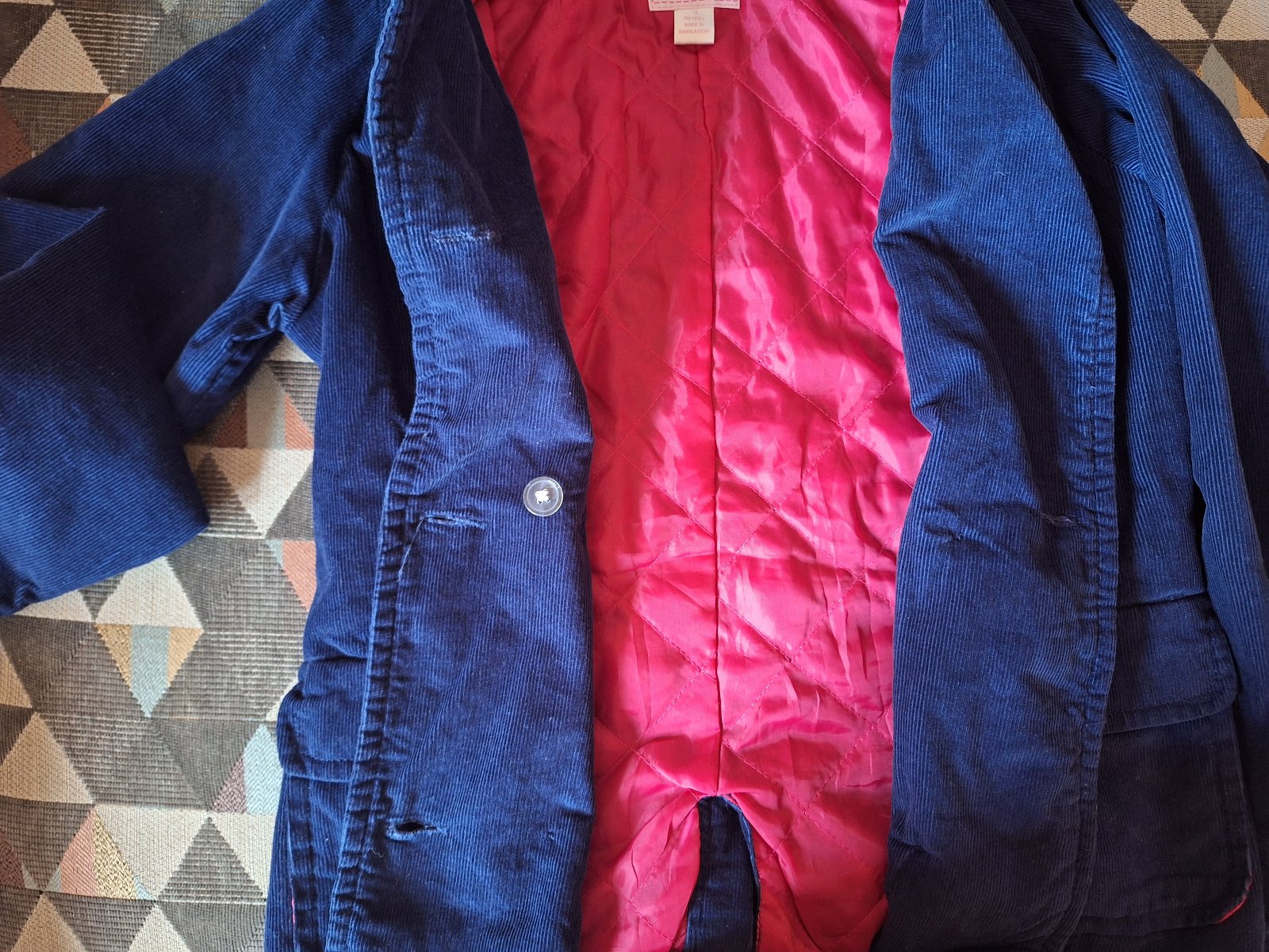 Predám pekný dievčenský prechodný menžestrový kabátik, tmavomodrej farby, so zapínaním na gombíky, jeden vnútorný gombík na zapínanie zvnútra, je podšitý tm.ružovou podšívkou, dve vrecká a má vzadu rozparok. zachovalý, bez chyby. veľ. je písaná 12, veľkosťou asi 146