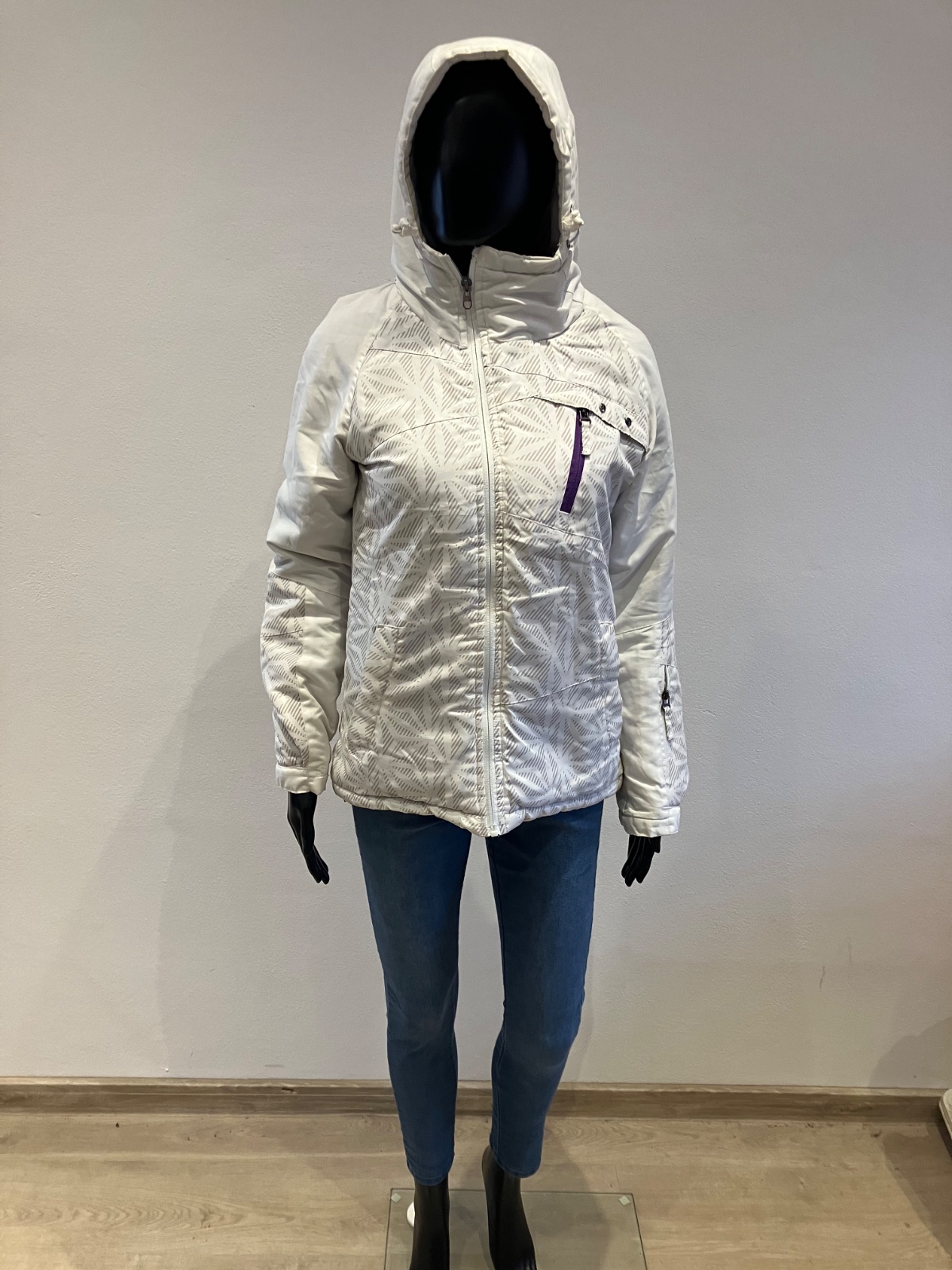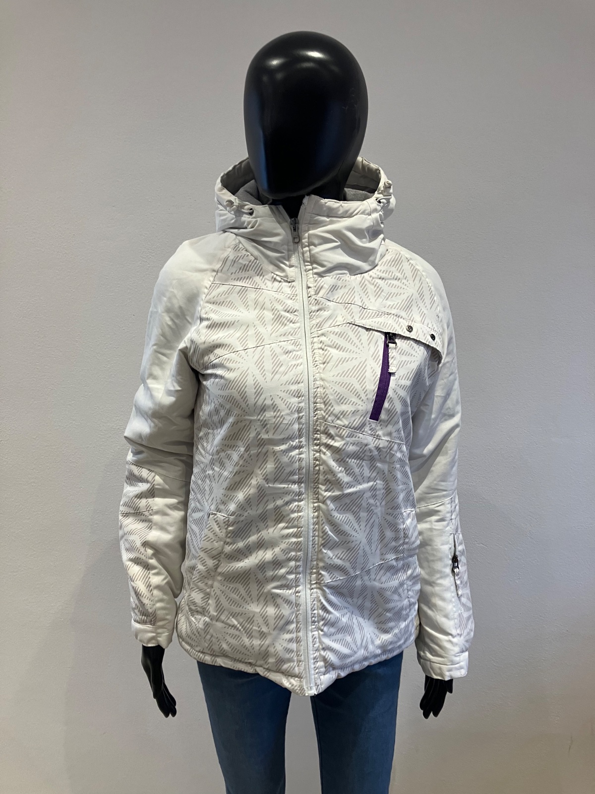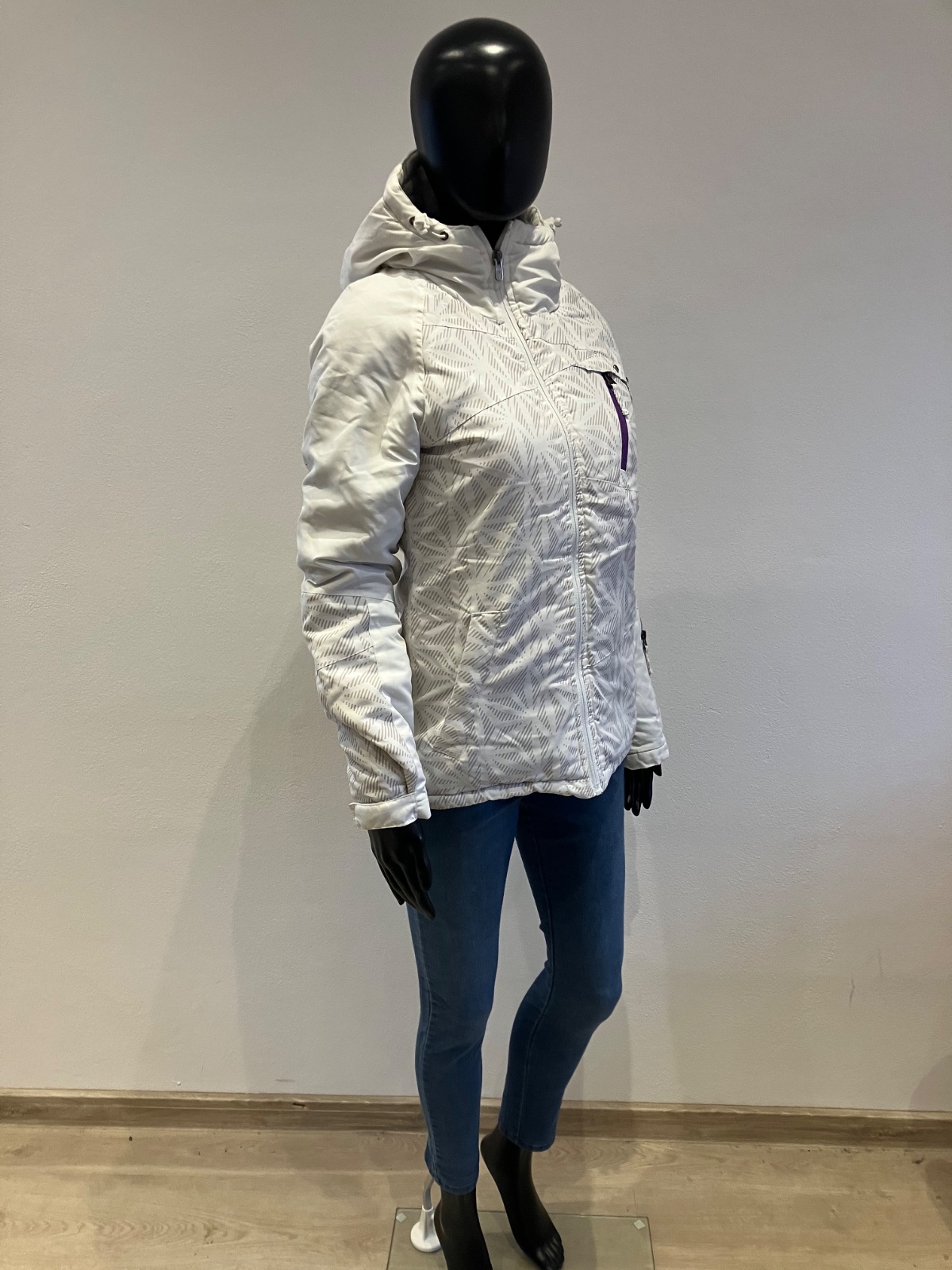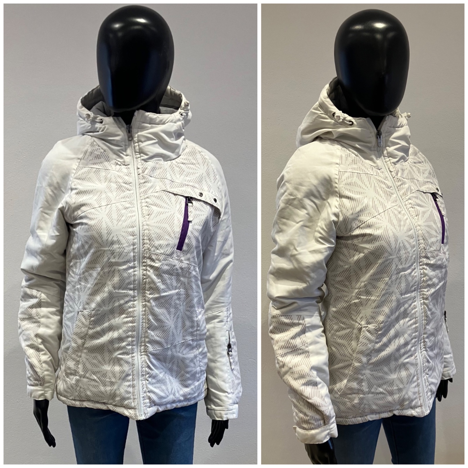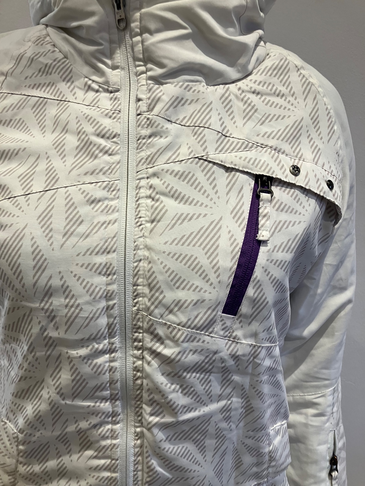 Dámska biela zimná vetrovka s kapucňou, majú sivé pásy, kapucňa je neodnímateľná.