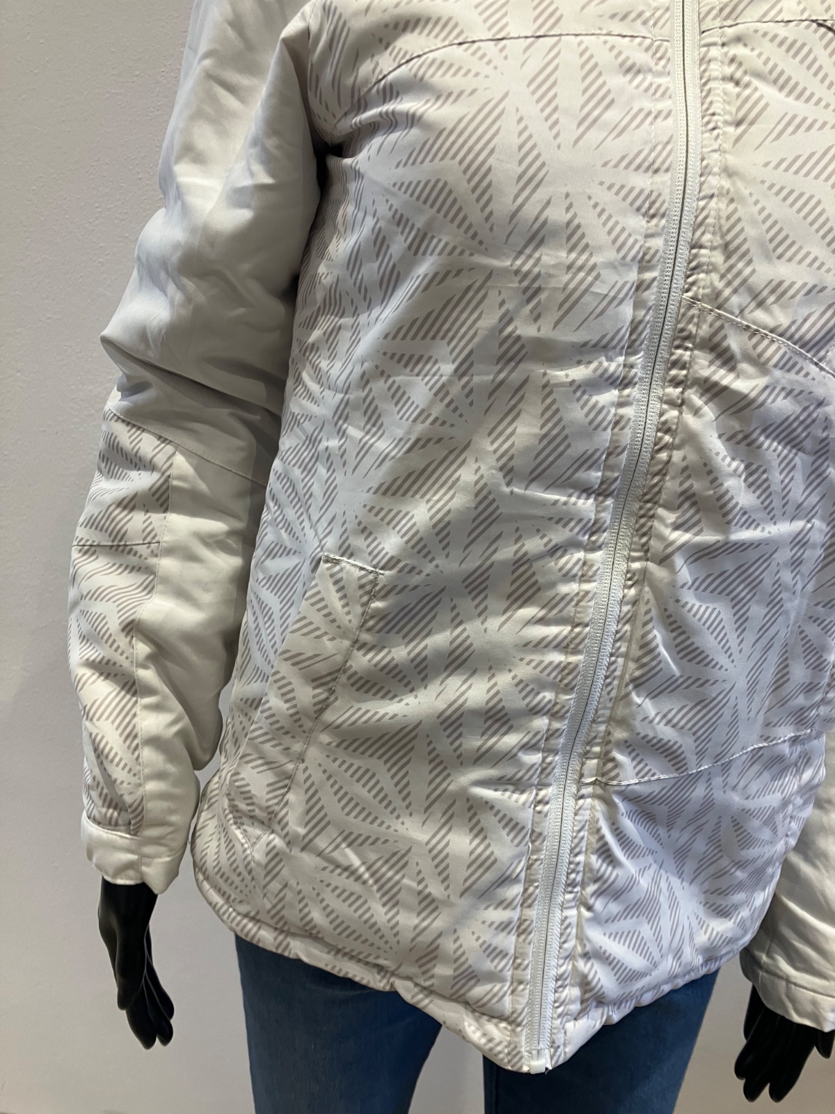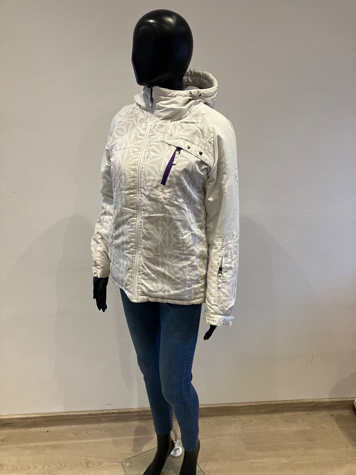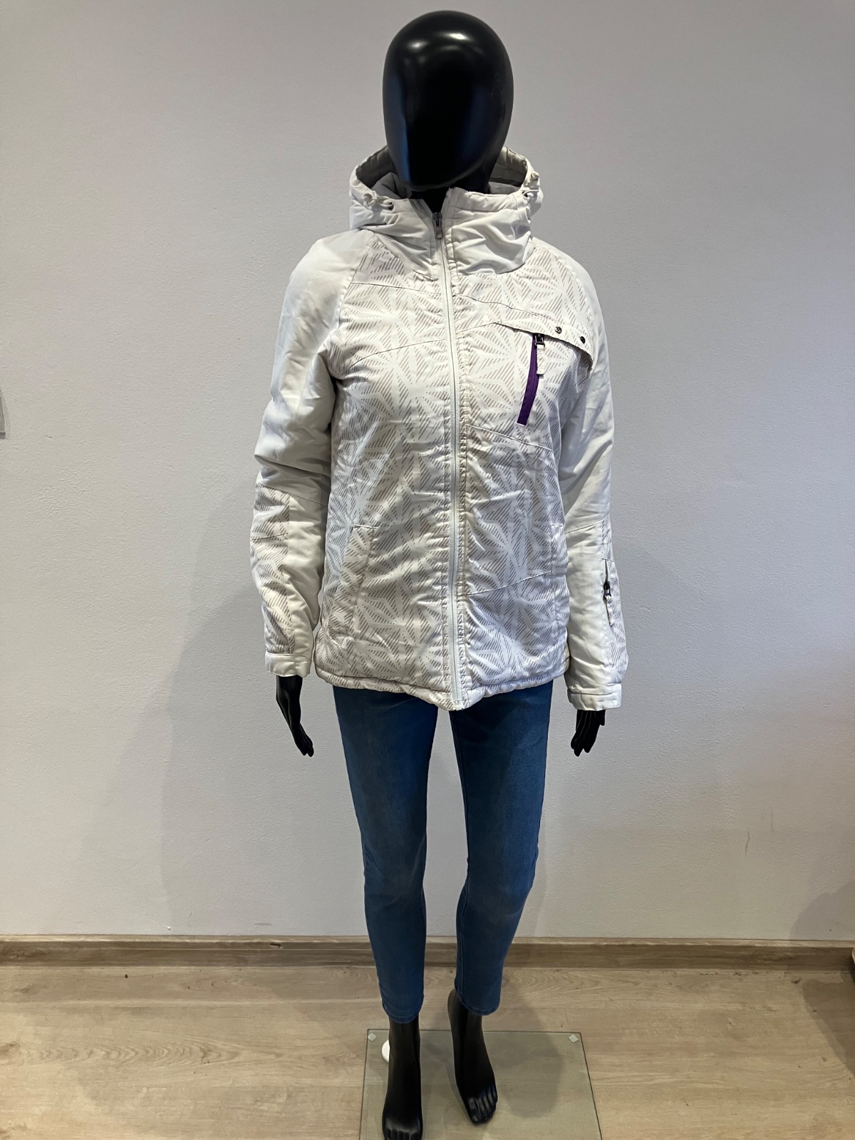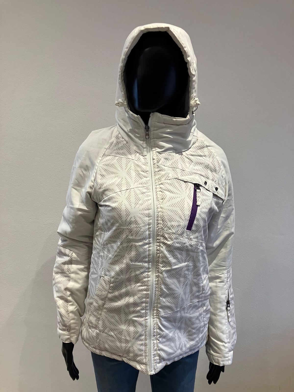 Dámska biela zimná vetrovka s kapucňou, majú sivé pásy, kapucňa je neodnímateľná.