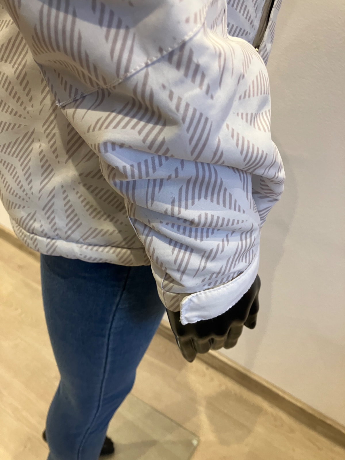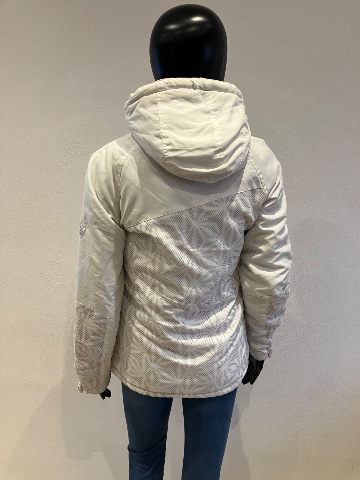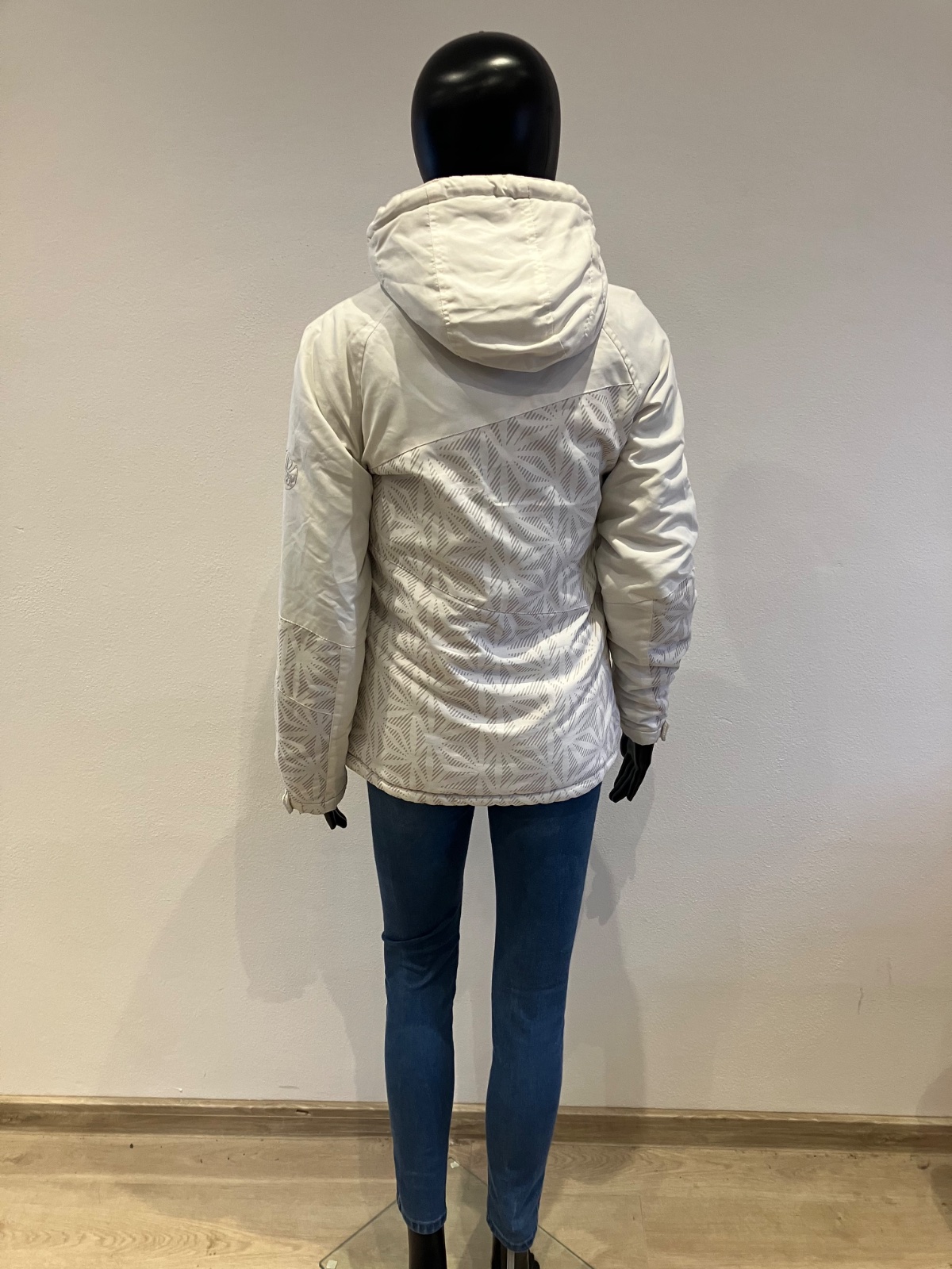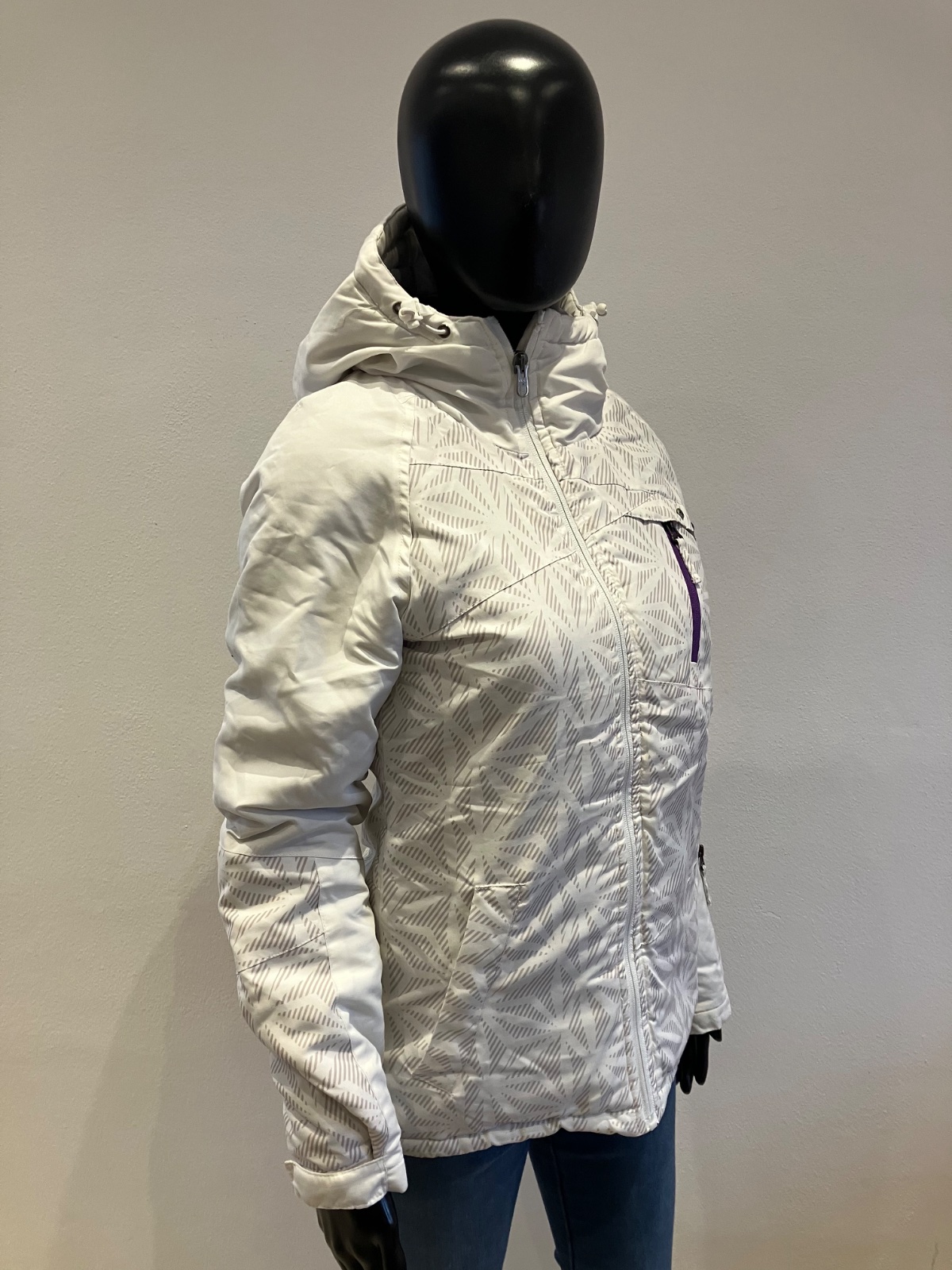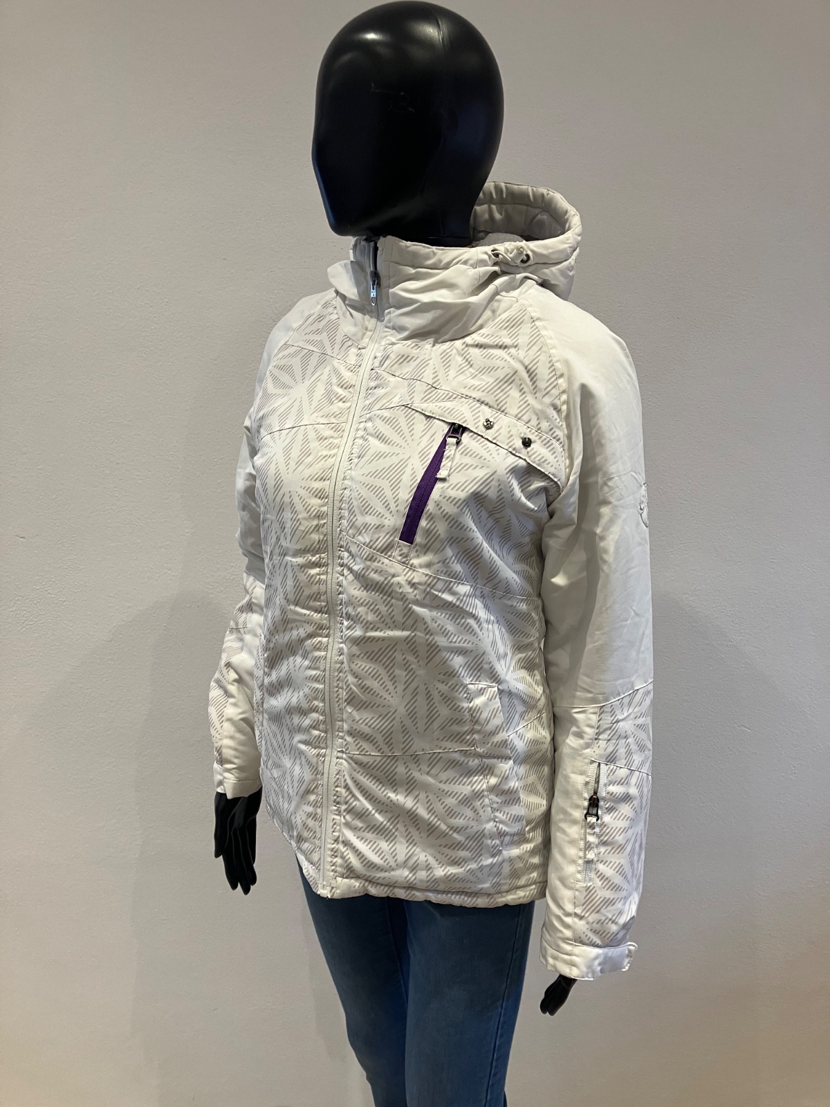Dámska biela zimná vetrovka s kapucňou, majú sivé pásy, kapucňa je neodnímateľná.