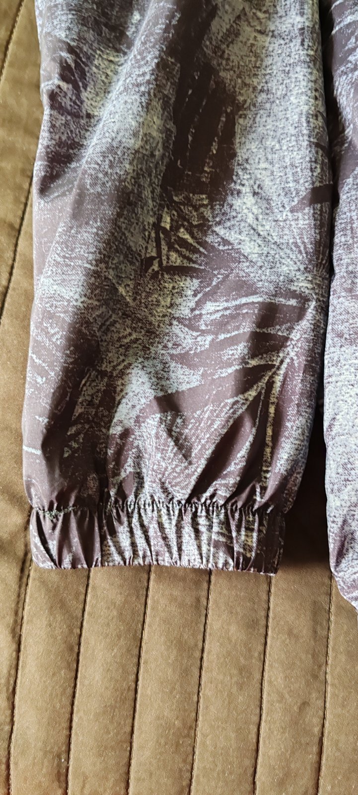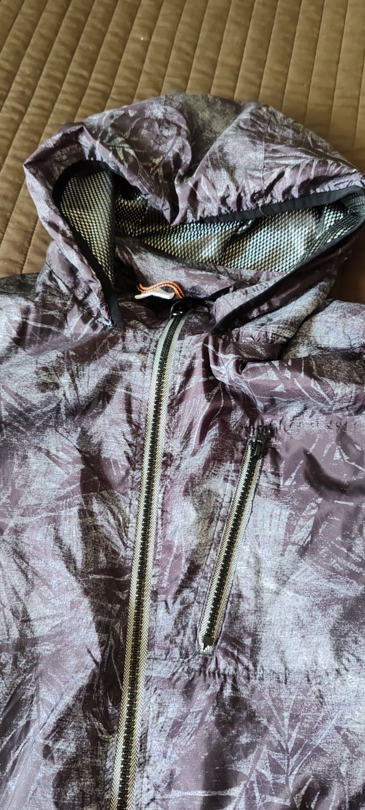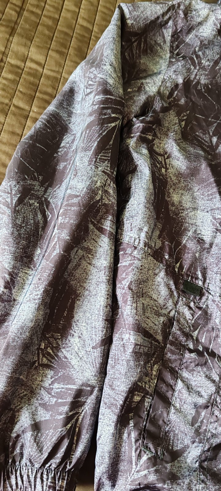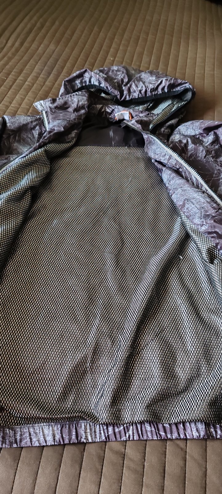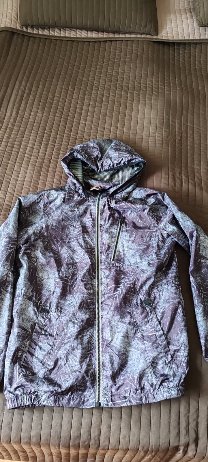 Šuštiaková bunda s kapucňou znacky F&F. Vzadu dole všitá guma. Kupovaná nová a nosená veľmi málo. Farba je tmavo modro siva.