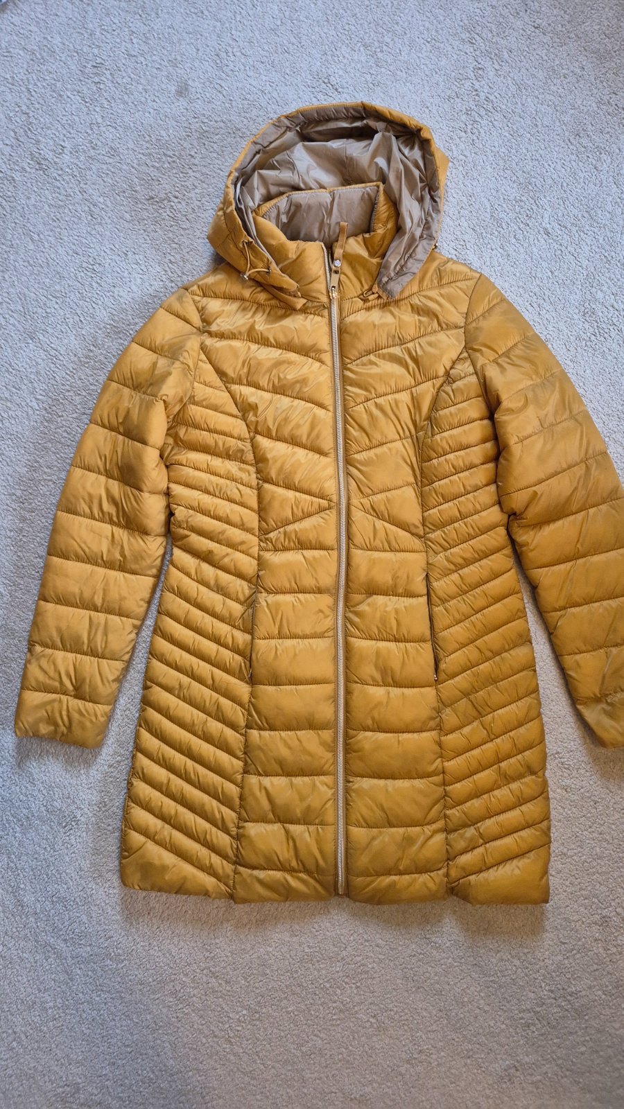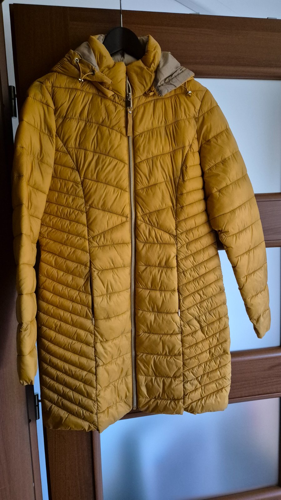 predám dámsku prechodnú bundičku v dobrom nosenom stave, píšu veľkosť 40, značka Janina, 100% polyester, farba horčicová, zapínanie na zips, bez goliera, dve predné vrecká na zips, rukávy sa zapína...