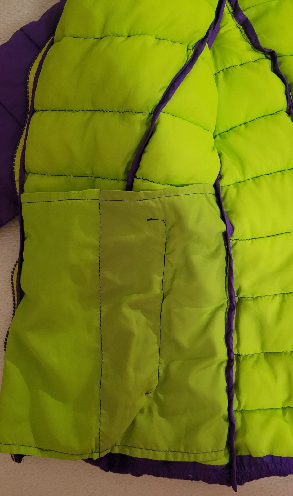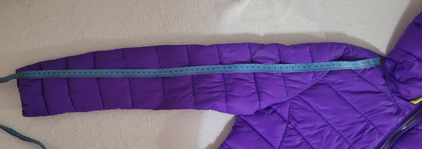 Fialova kratka bundicka, nosena, ale bez poskodeni. Dlzka 57 cm, sirka pod pazuchami 47 cm, dlzka rukava 53 cm