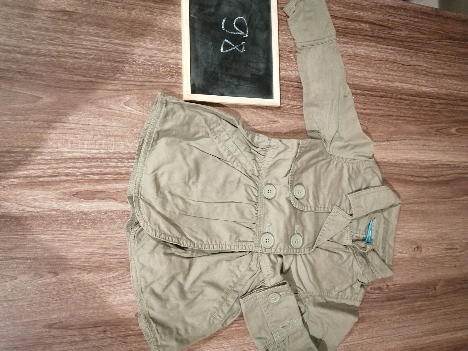 Krásný kabátek olivové barvy s propracovanými detaily. Velikost uvedena 3T, ale nositelný déle.