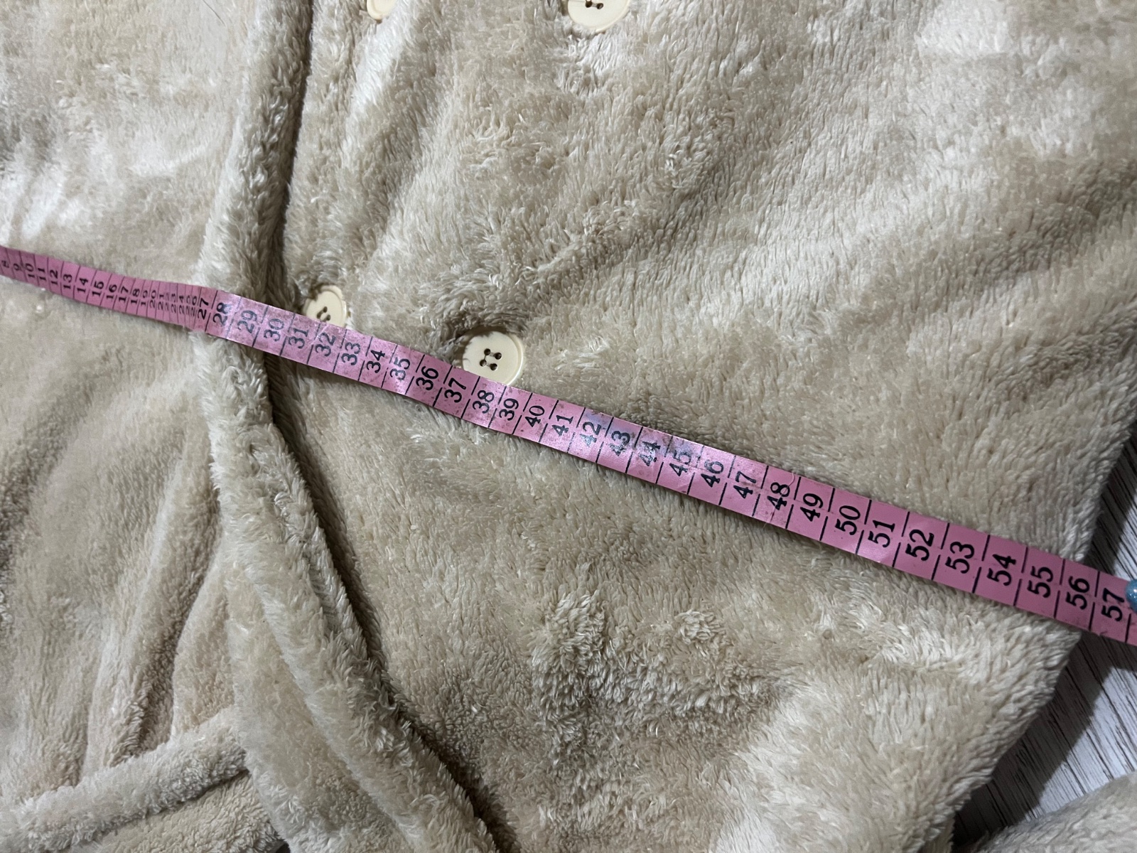 Farba jemnučkà bledunká krémová, pudrová, nie biela. Kožušinka maslovej farby nie snehobiela. Krásny elegantný kabátik s opaskom, dlžka 81cm, rukáv od pleca 59cm, šírka hrudník 49cm, pás 45cm, boky...