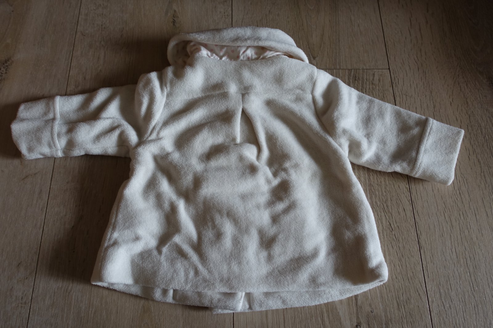 Predám prekrásny bielulinký velúrový kabátik podteplený bavlnenou látkou. Je stredne hrubý. V predu sa zapína na dve gombičky a nižšie na dve pukažky. Mali sme ho pár krát, ale je v peknom stave. Pranie troška vidno na vnútornej bavlnenej látke, inak je v krásnom stave. Nemá fľaky, ani diery. Je skutočne veľmi rozkošný. Mäkulinký, odporúčam, k šatočkám či sukničke ideálny. Celková dĺžka je 34 cm a šírka 30 cm (meraná popod pozuškami). Dĺžka rukáviku od krku 29 cm a od pliecka 24 cm. (G)