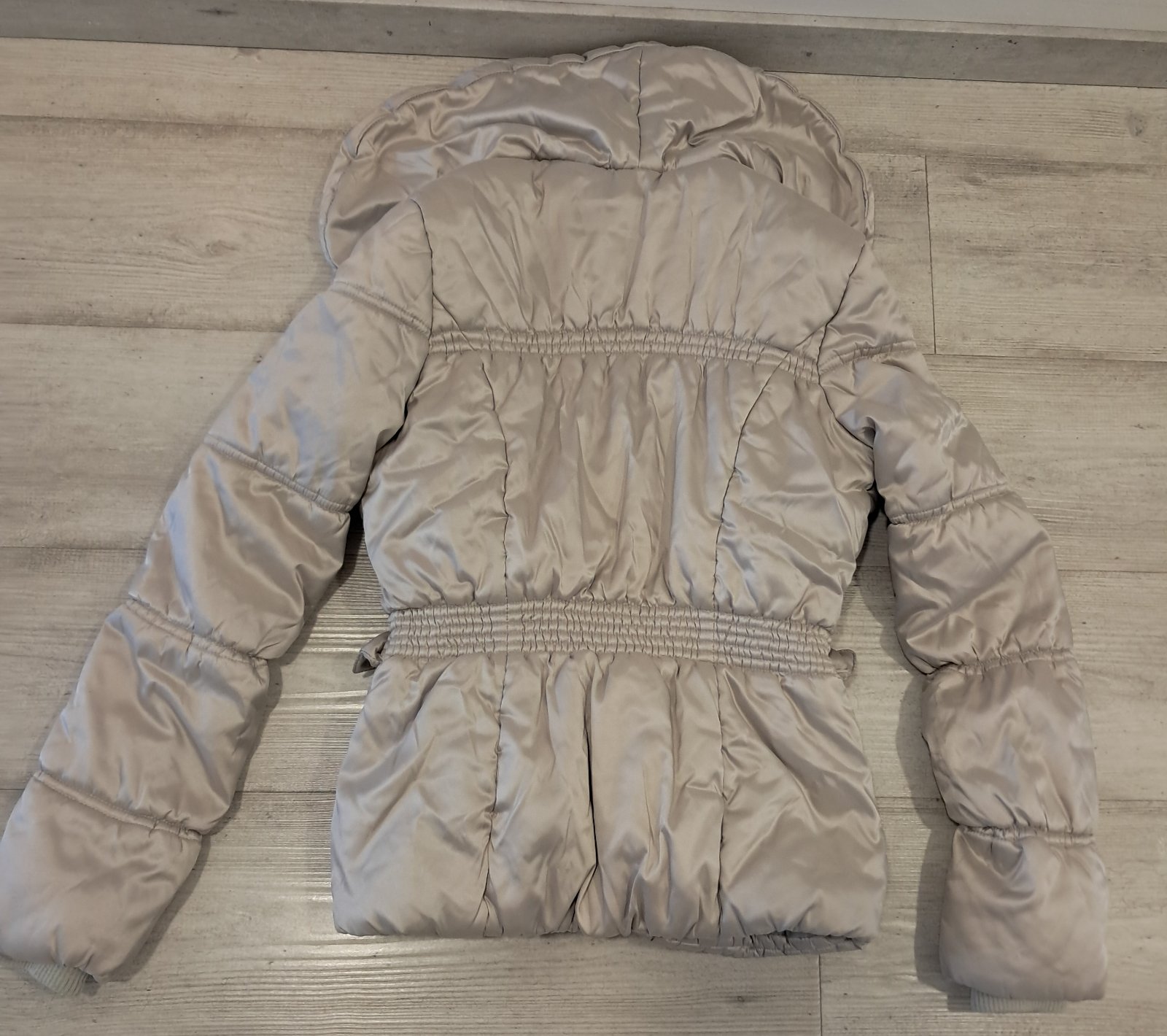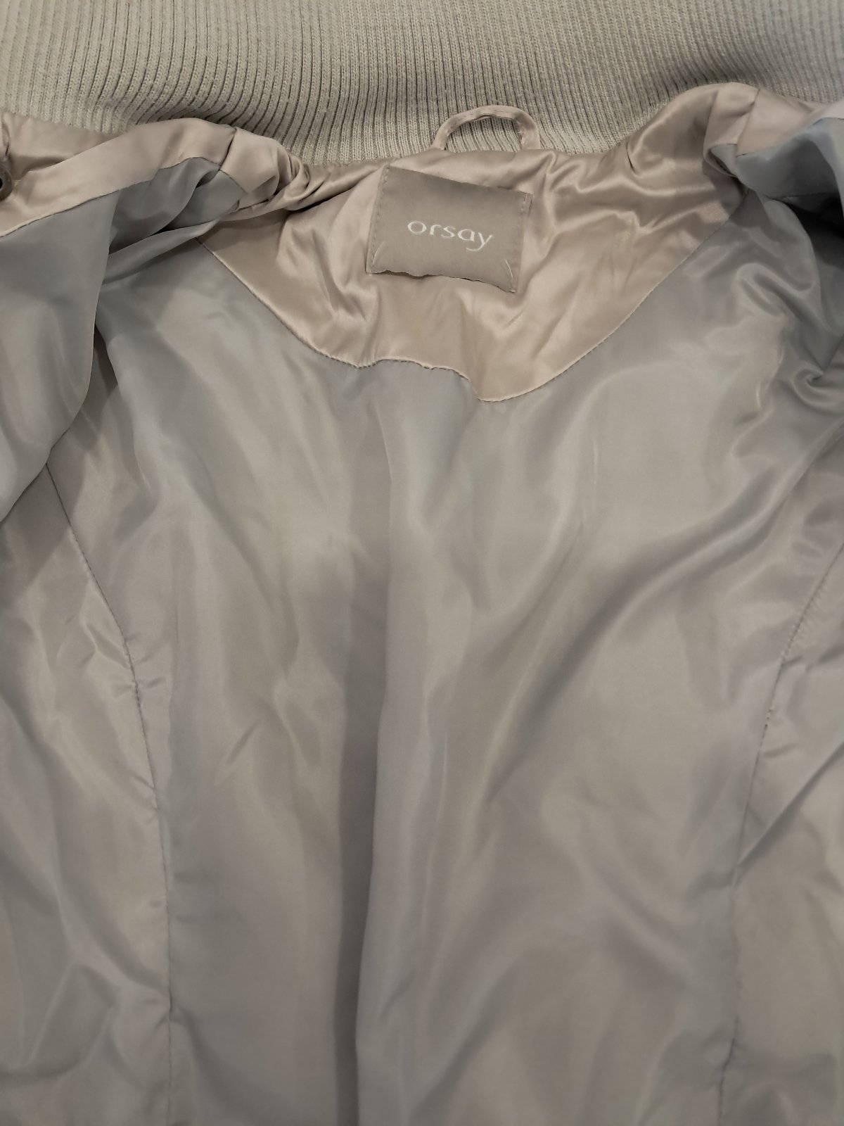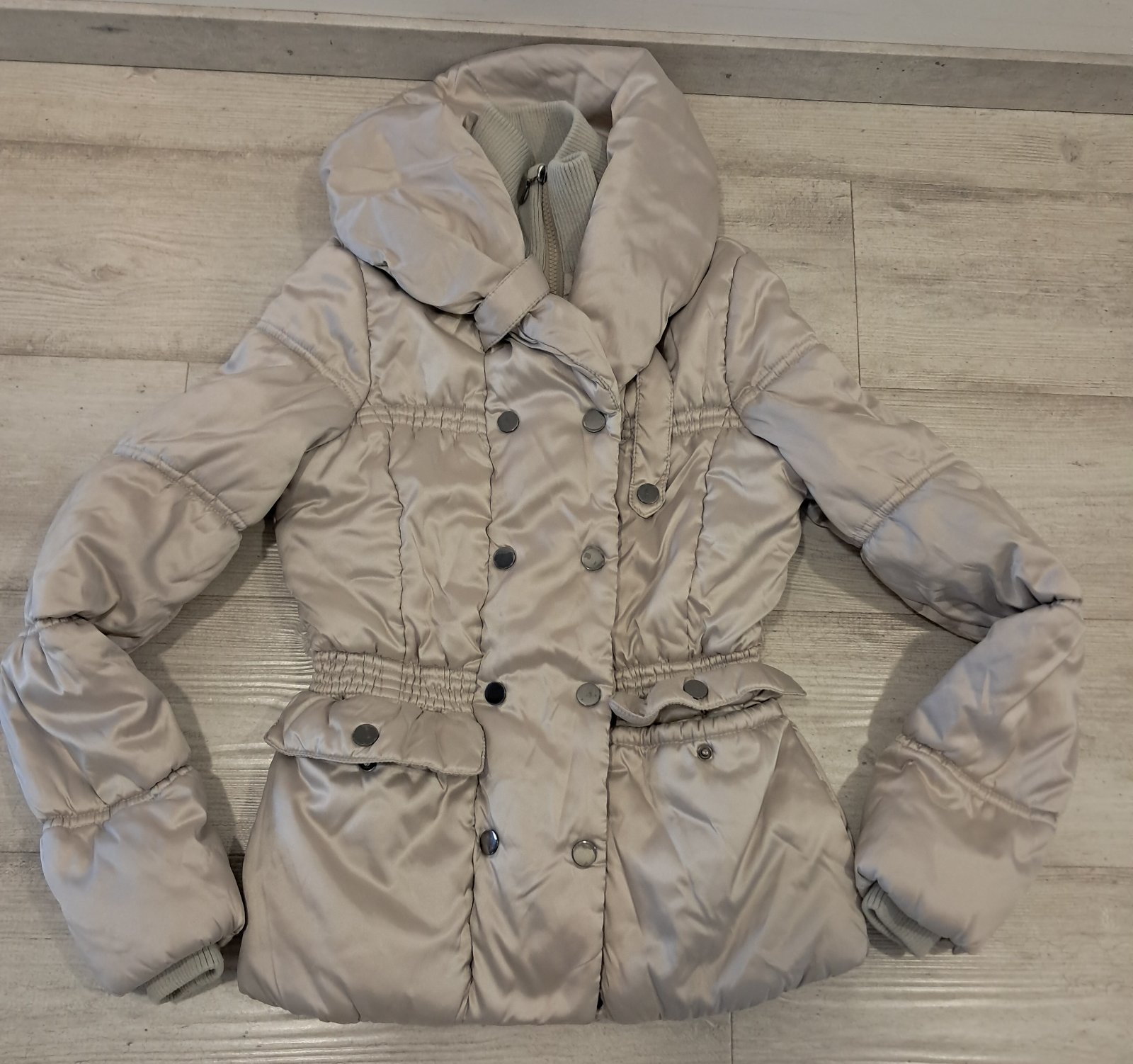Predám krátku strieborno-šedú zimnú bundičku, veľ. 38/M, zn. Orsay. Jediné poškodenie - po opratí na gombíkoch vznikli drobné fliačky (viď foto), čo ale nebráni noseniu. Pekný nosený stav.