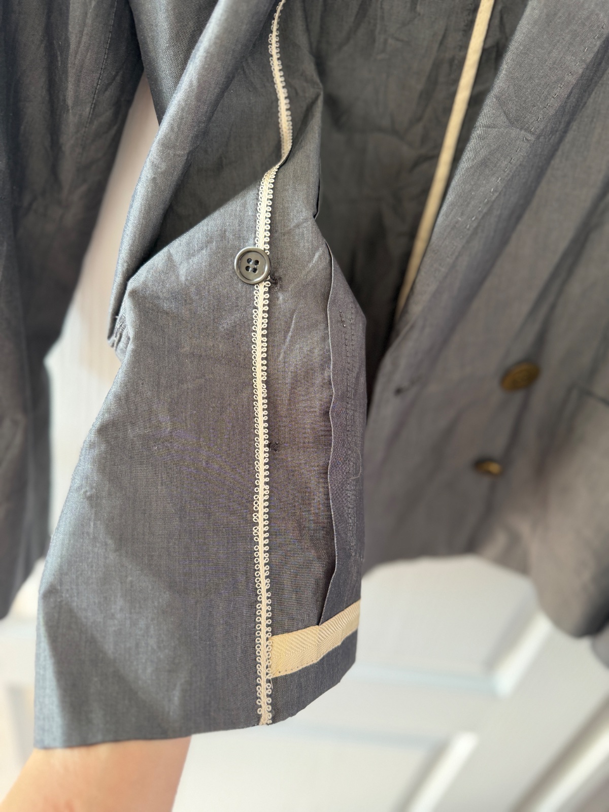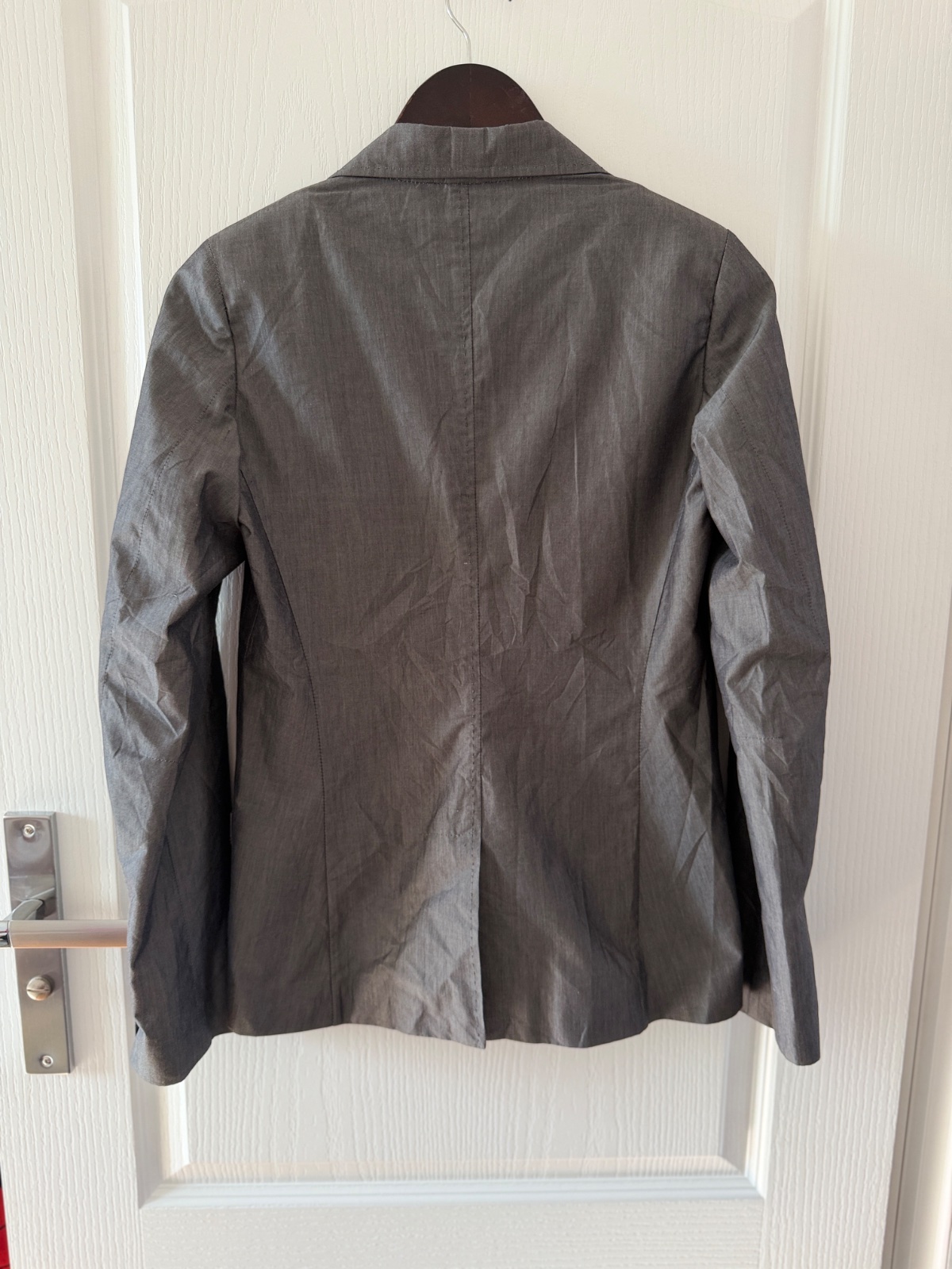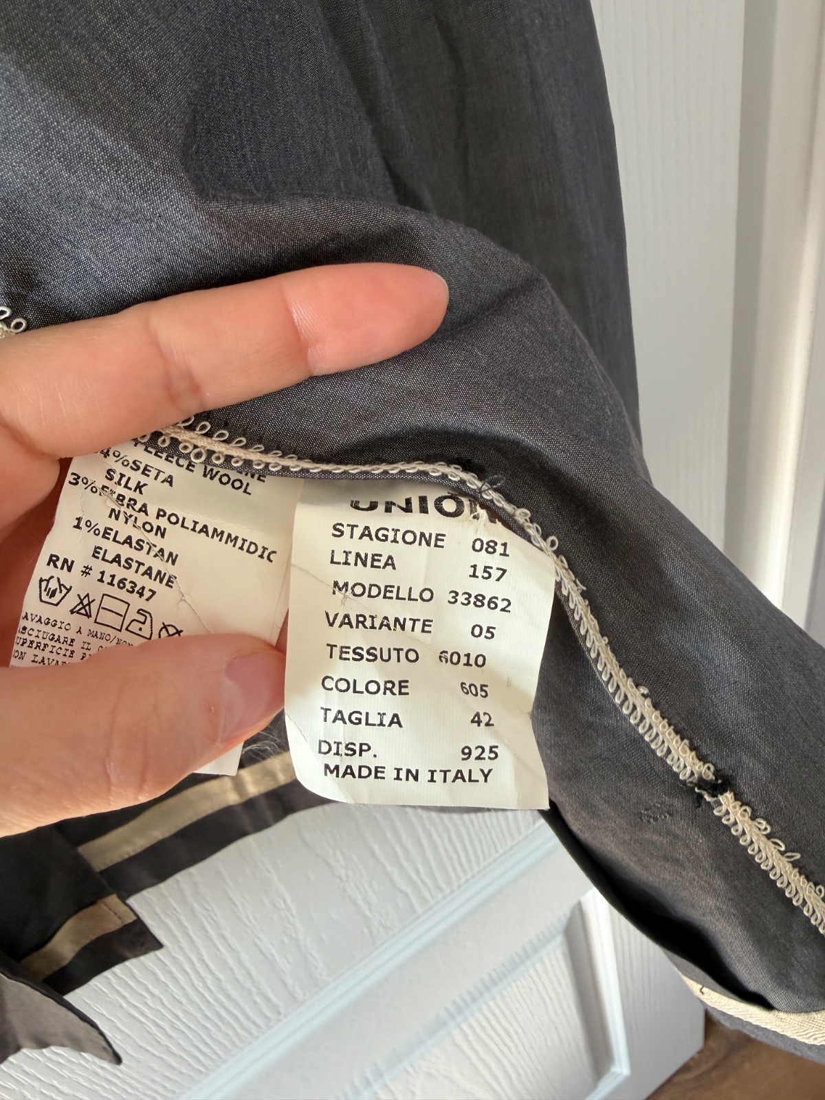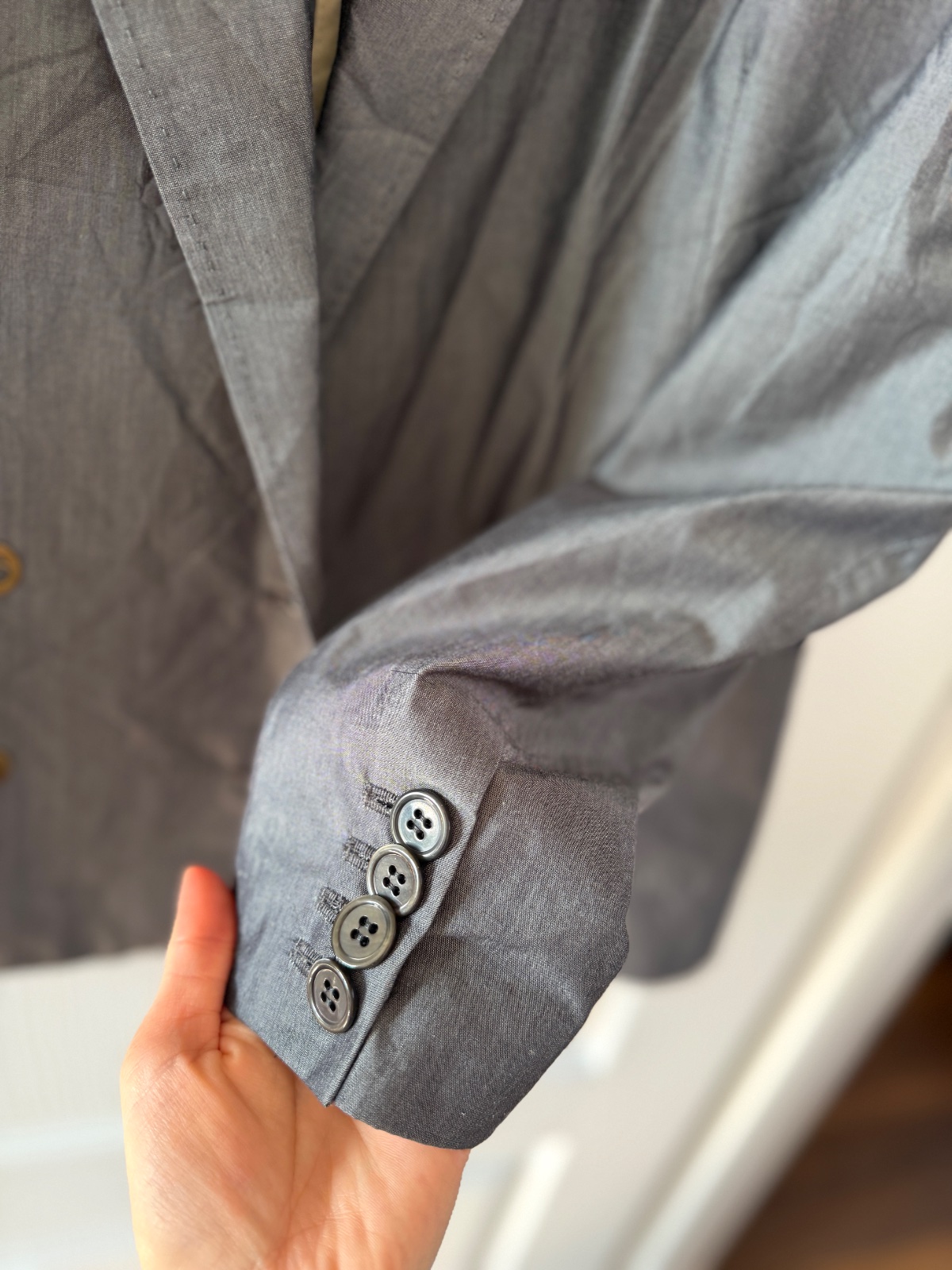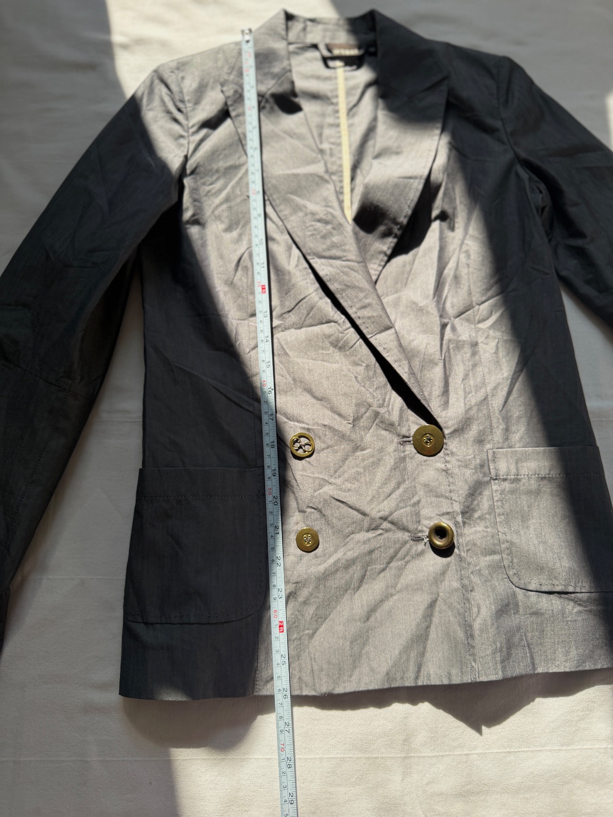 Toto elegantné dámske sako má klasický, no zároveň moderný strih, vyrobený z luxusnej zmesi materiálov. Pýši sa jemným, rafinovaným leskom a vysoko kvalitným remeselným spracovaním. Farba je oceľovosivá. Vrchná látka je 62 % panenskej vlny, 34 % hodvábu, 3 % polyamidu a 1 % elastanu. Sako má dvojradové zapínanie a zapína sa na štyri ozdobné gombíky v starožitnom zlate/bronzi. Má dve predné našívané vrecká, ktoré mu dodávajú o niečo menej formálny, „elegantne-ležérny“ vzhľad. Rukávy sú zakončené štyrmi menšími gombíkmi na manžetách. Jeden zadný rozparok umožňuje väčšiu slobodu pohybu. Sako nie je úplne podšité (ľahká konštrukcia) a vnútorné švy sú starostlivo zakončené kontrastným lemovaním, čo dokazuje vysoko kvalitné krajčírske spracovanie. Veľkosť na etikete je talianska 42; všetky miery sú na fotografiách. Toto sako je perfektnou voľbou pre tých, ktorí si cenia kvalitu „Quiet Luxury“ – bude sa skvele hodiť do kancelárie aj k džínsom a bielemu tričku.