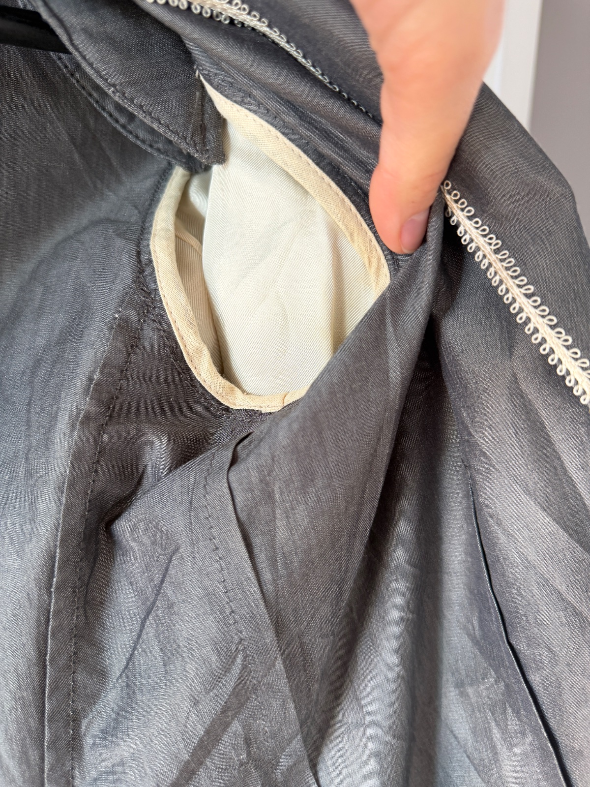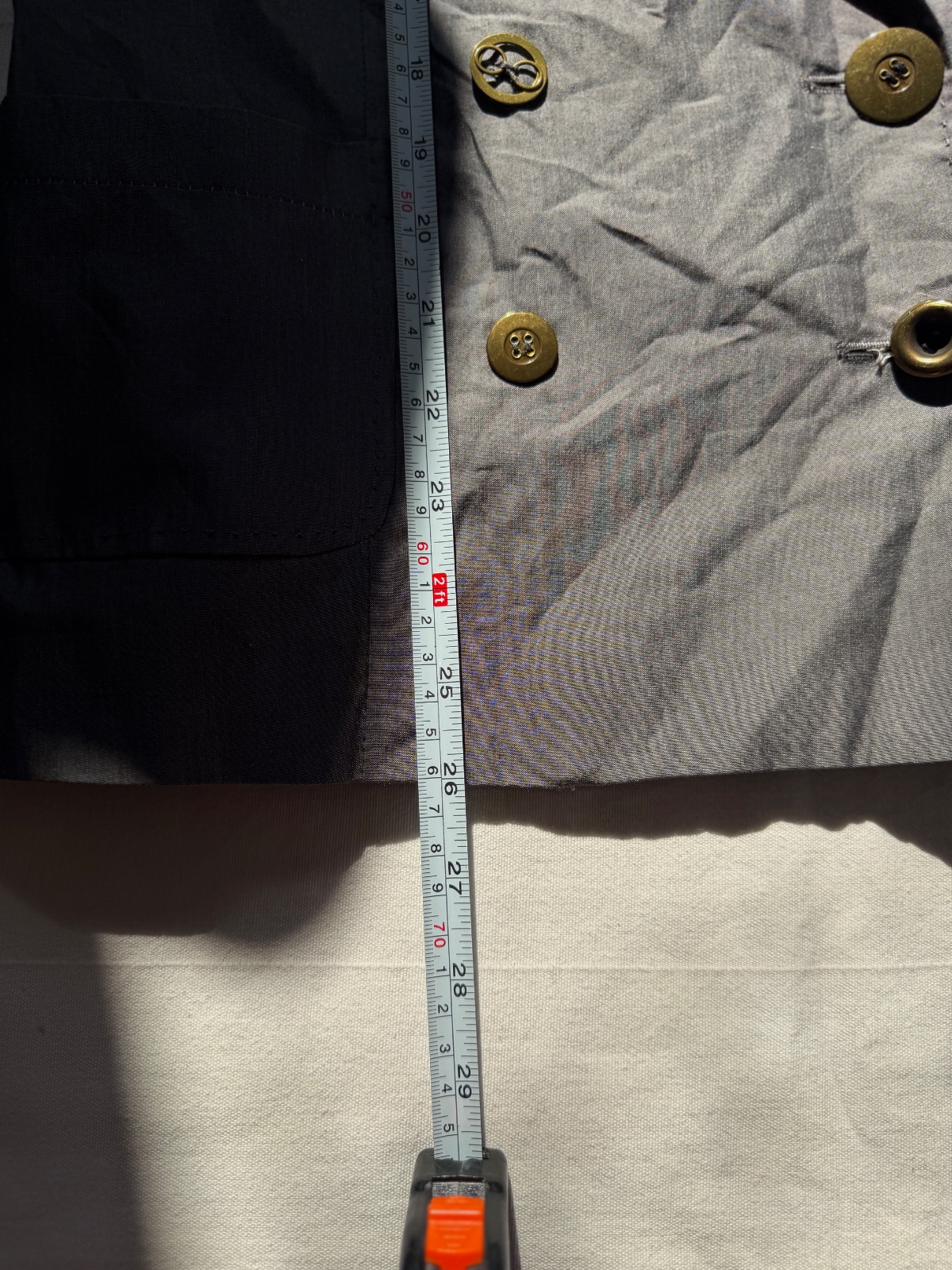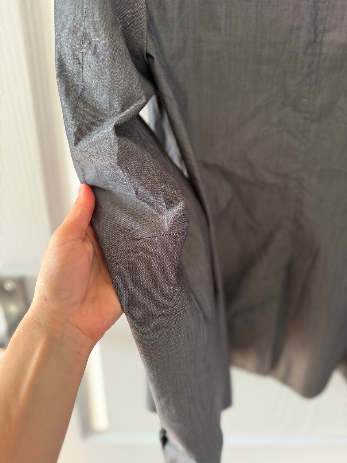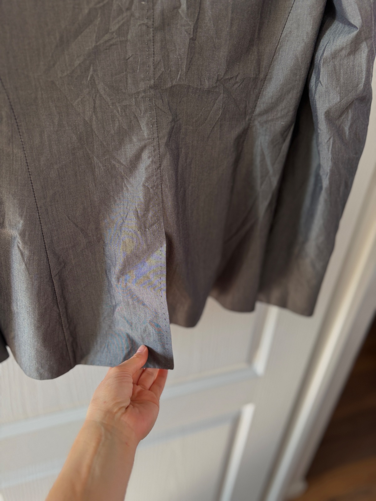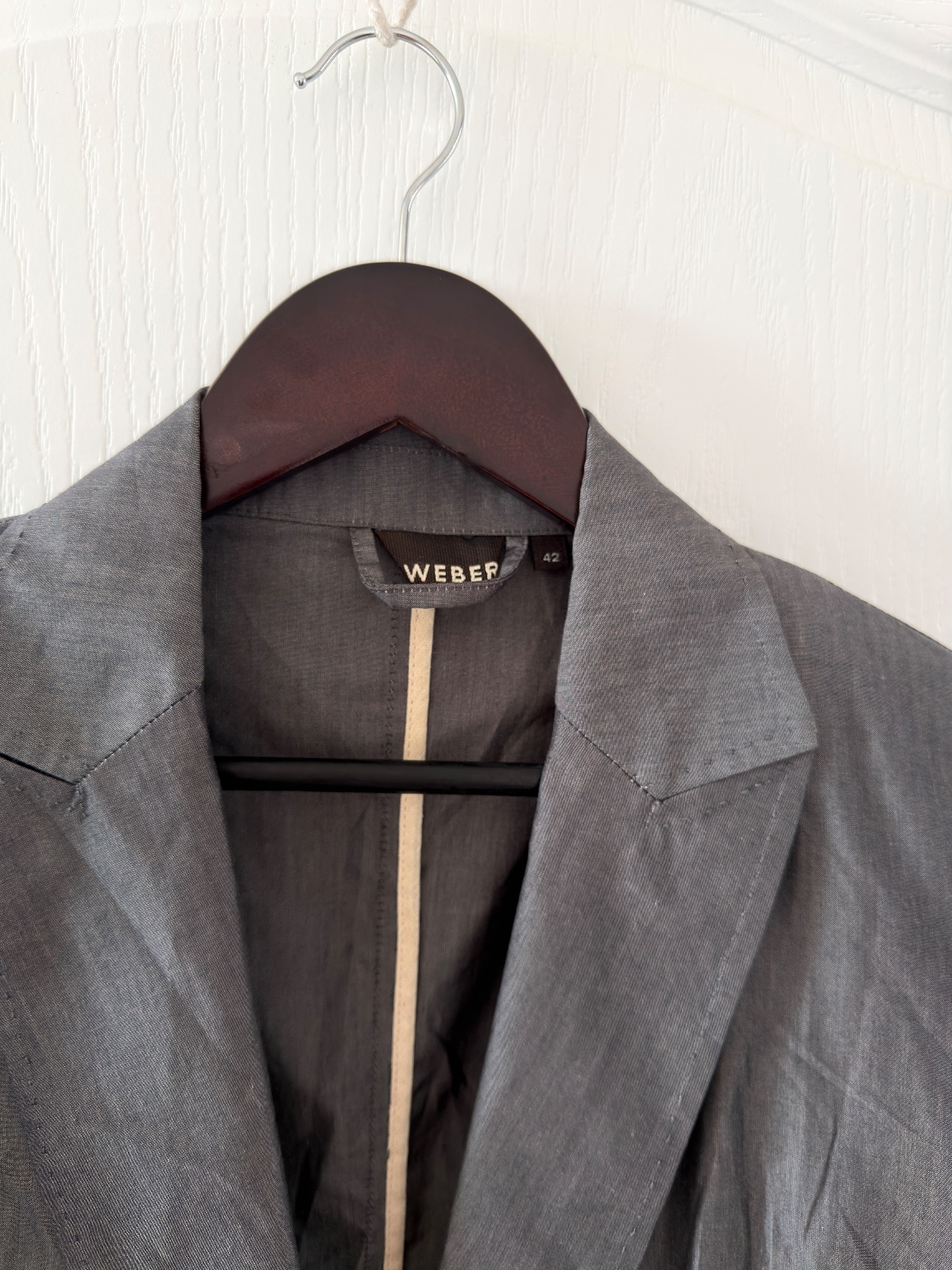 Toto elegantné dámske sako má klasický, no zároveň moderný strih, vyrobený z luxusnej zmesi materiálov. Pýši sa jemným, rafinovaným leskom a vysoko kvalitným remeselným spracovaním. Farba je oceľovosivá. Vrchná látka je 62 % panenskej vlny, 34 % hodvábu, 3 % polyamidu a 1 % elastanu. Sako má dvojradové zapínanie a zapína sa na štyri ozdobné gombíky v starožitnom zlate/bronzi. Má dve predné našívané vrecká, ktoré mu dodávajú o niečo menej formálny, „elegantne-ležérny“ vzhľad. Rukávy sú zakončené štyrmi menšími gombíkmi na manžetách. Jeden zadný rozparok umožňuje väčšiu slobodu pohybu. Sako nie je úplne podšité (ľahká konštrukcia) a vnútorné švy sú starostlivo zakončené kontrastným lemovaním, čo dokazuje vysoko kvalitné krajčírske spracovanie. Veľkosť na etikete je talianska 42; všetky miery sú na fotografiách. Toto sako je perfektnou voľbou pre tých, ktorí si cenia kvalitu „Quiet Luxury“ – bude sa skvele hodiť do kancelárie aj k džínsom a bielemu tričku.