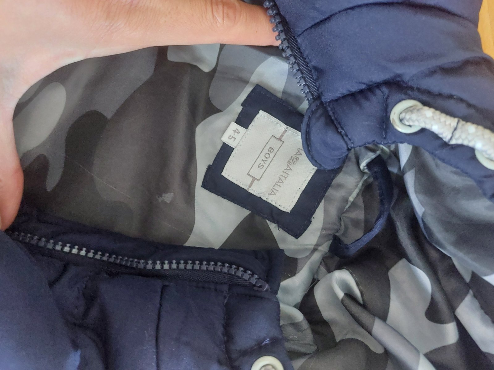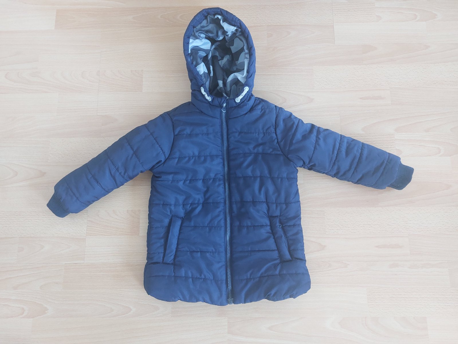Veľkosť 110. Kupovaná v predajni C&A. Kapucňa ma odnímateľnú kožušinku. Upozorňujem na golierik - z vnúornej strany golierika na malom kúsku odratá kožušinka. Pozri foto. Na rukáve bola malinká die...
