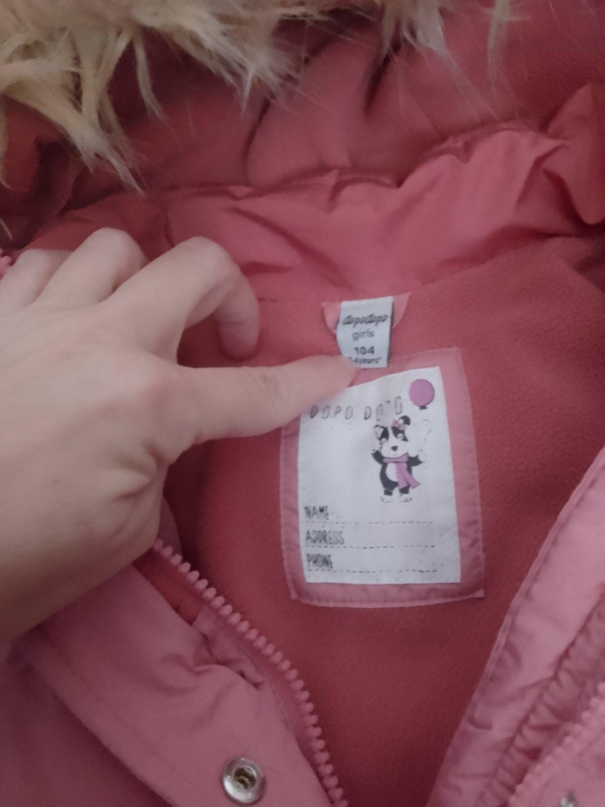 Dievčenská zimná bunda vo výbornom stave. Zvnútra zateplená flausovou podšívkou, na chrbáte reflexný prvok. Veľkosť 5-6 rokov. Dĺžka bundy 55,5cm, dĺžka rukáva od ramena 43.5cm.