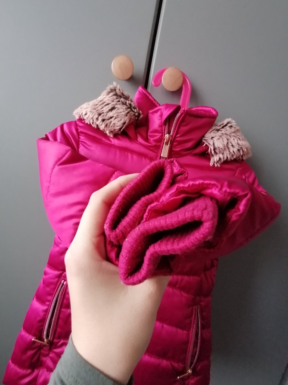 pekny stav. oblecene par krat, bezne znamky nosenia, tj. velmi jemne zatiahnuté sem tam (snazila som sa odfotit) a trochu šuchnute bezce, zipsy funguju, kapucna napevno, kozusinka odnimatelna, farba krasna syta vinova (kovova /pololesk), v prioadne zaujmu premeriam