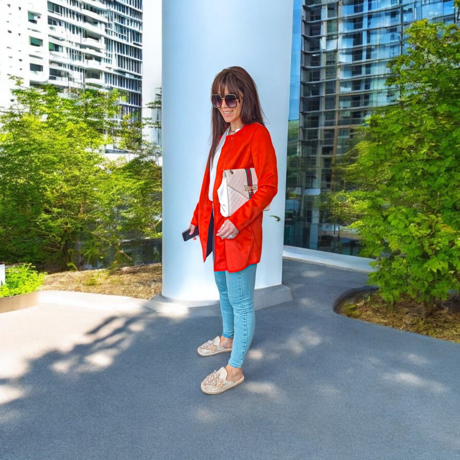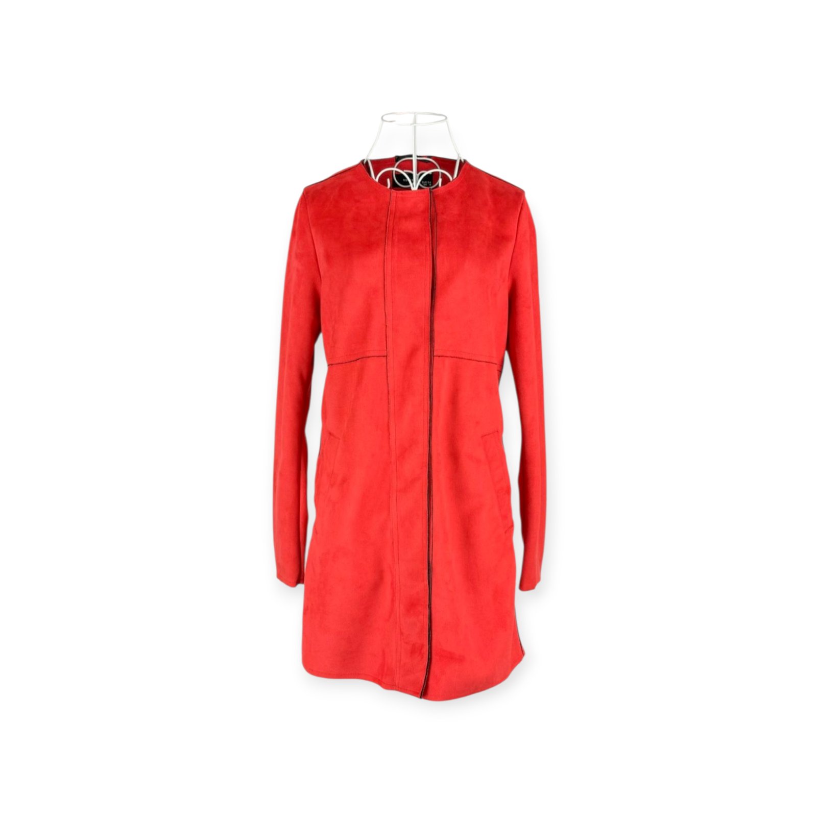 dámsky jahodový kabát z jemne elastického materiálu má zapínanie na cvoky