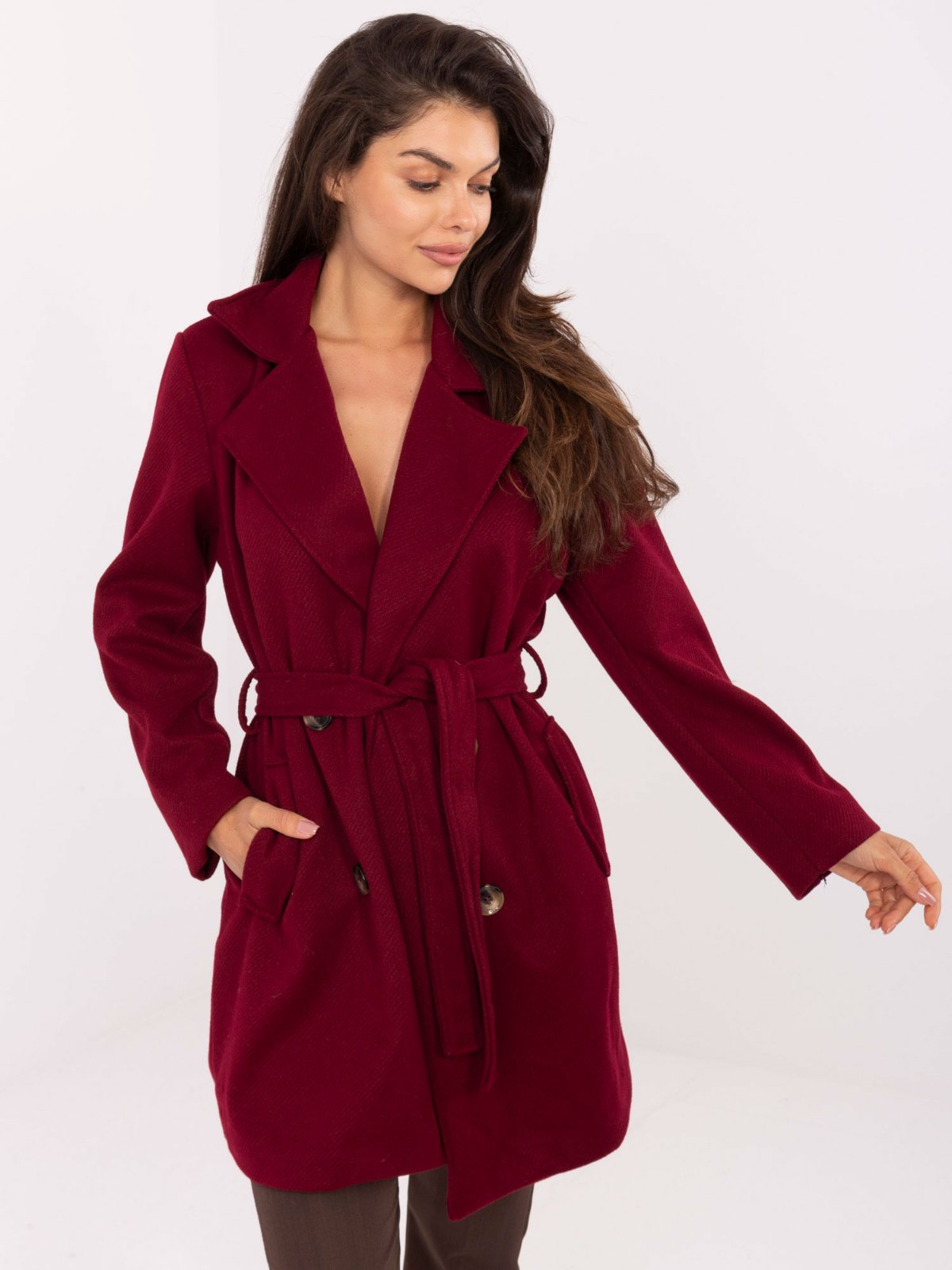 ✅ Praktické detaily – viazací opasok a dvojradové zapínanie.