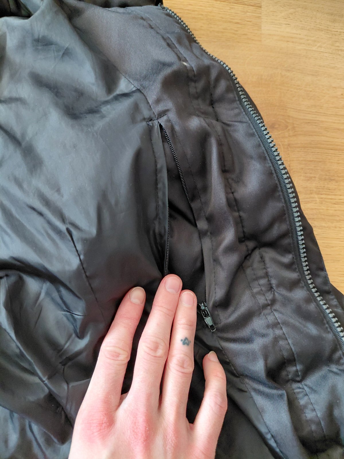 Vetrovka má aj vnútorné vrecko a gumovú nášivku na rukáve , taktiež rázporky so skrytými zipsami dole na rukávoch (foto)