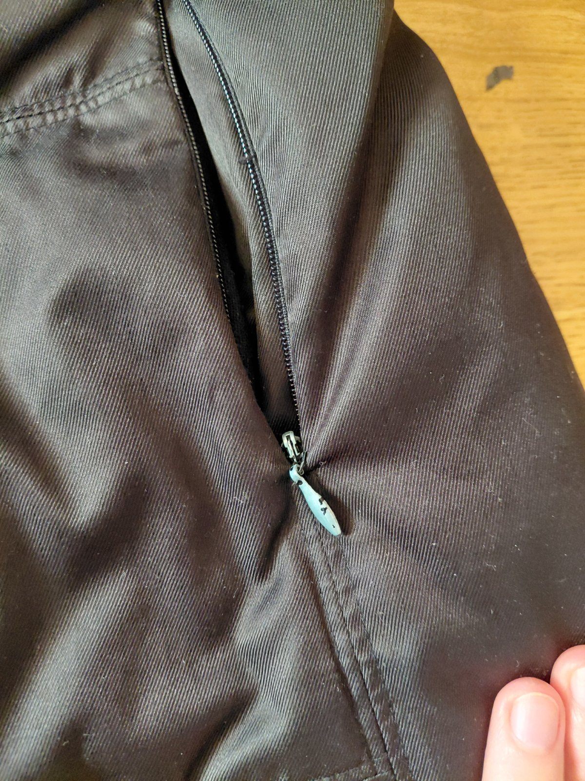 Zapínanie vpredu na zips -- gombíky a putká z vrchnej strany boli odpárané