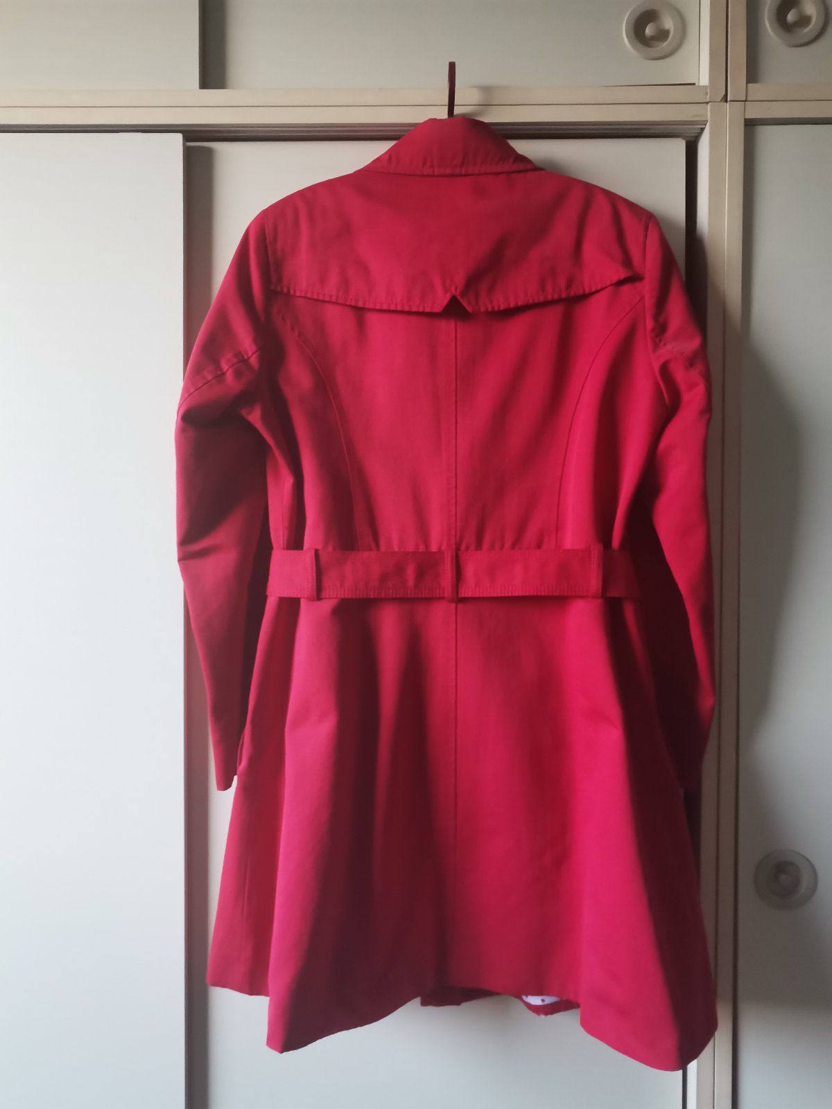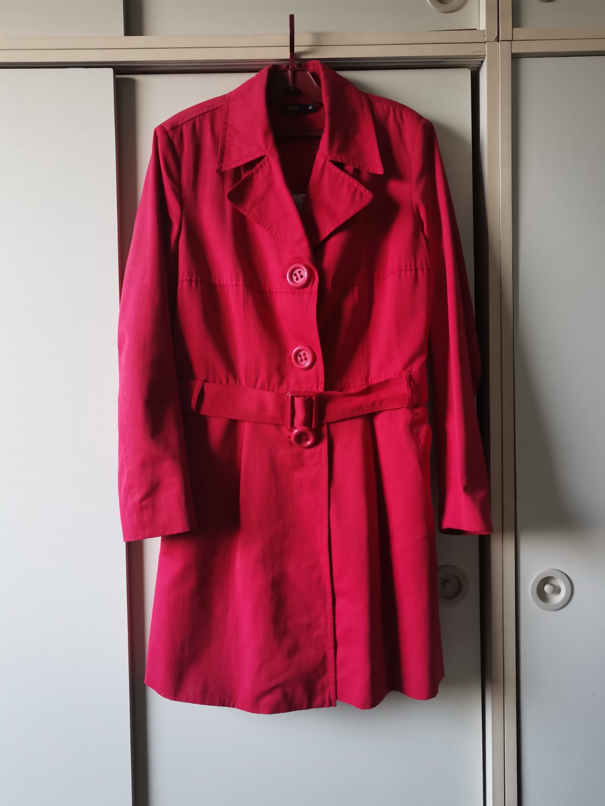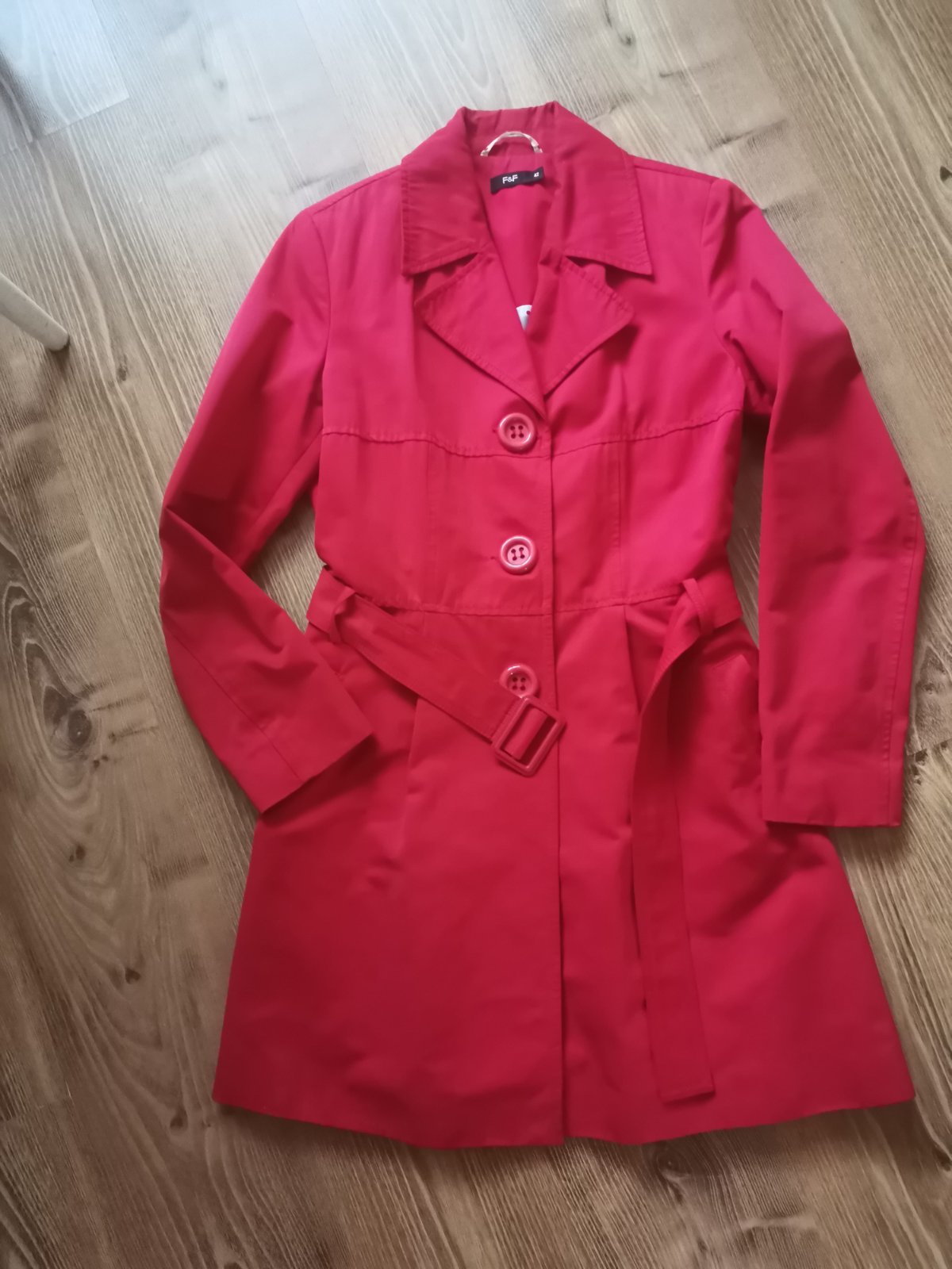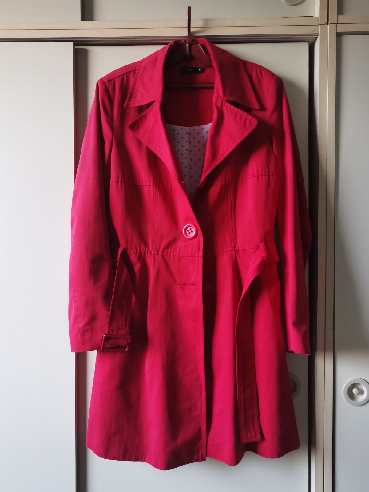 Krásny červený ľahký kabát (jar/jesen) vnútri bodkovaný podšívka. Velk písaná 44,ale je zúžený na velk 40/42