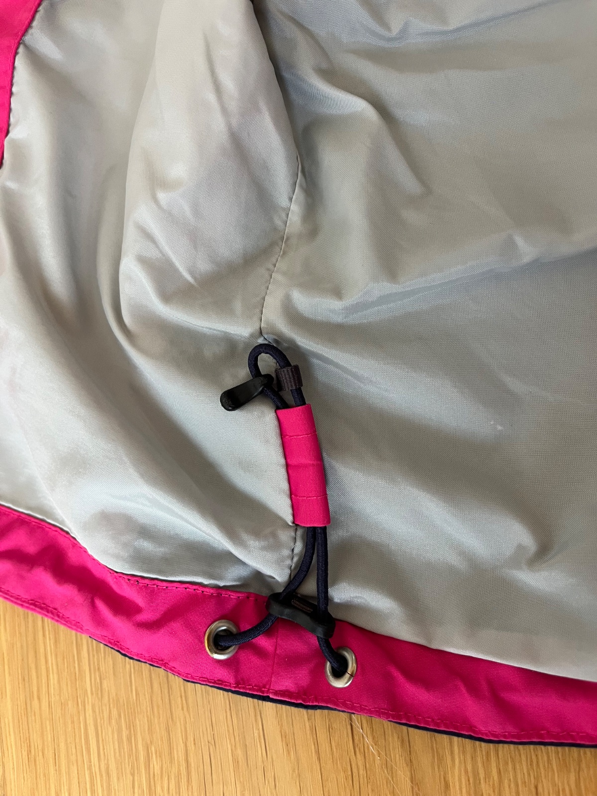 Bundička je bez veľkých poškodení, ale nosenie vidno na farbe - je bledšia ako na fotkách. Bunda má priťahovacie šnúrky na spodku a reflexné prvky.
