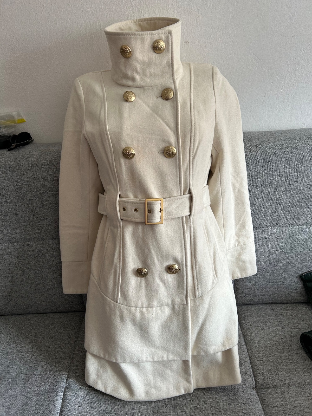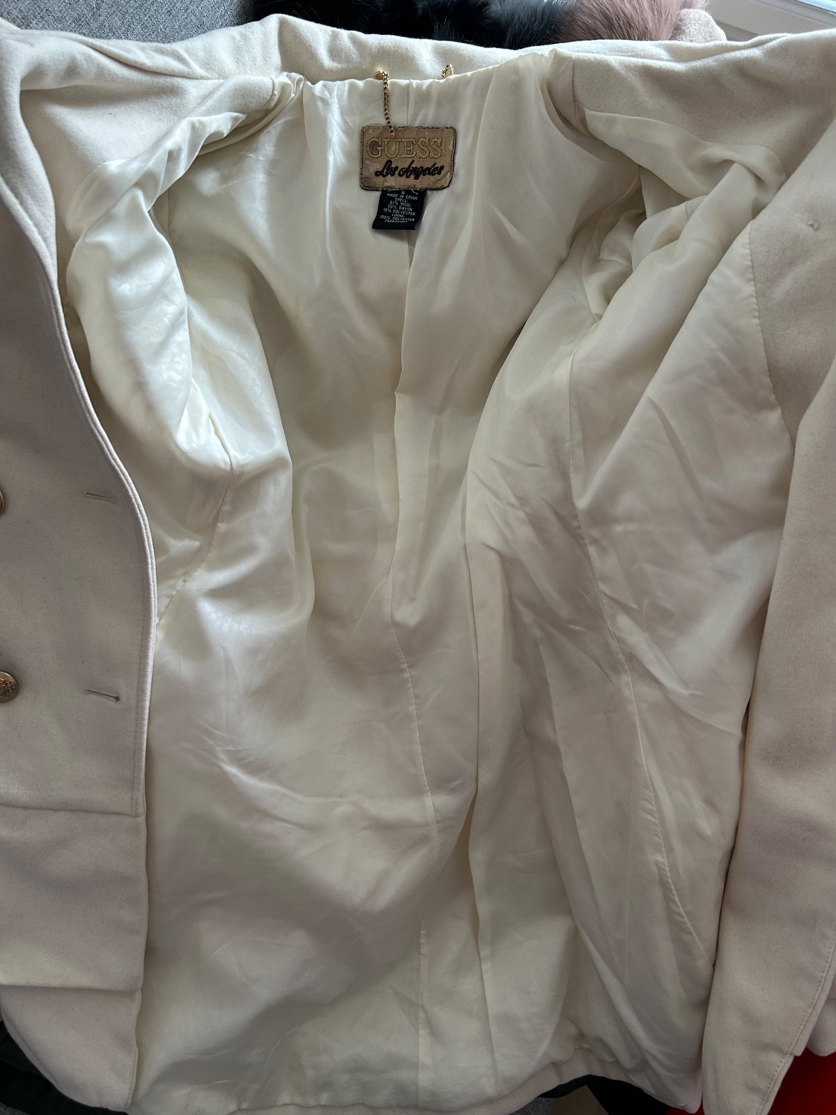 Kabát Guess, vzadu na spodu dva nepatrné nažltnuté fliačky viď posledná foto. Gombíky zlaté kovové.